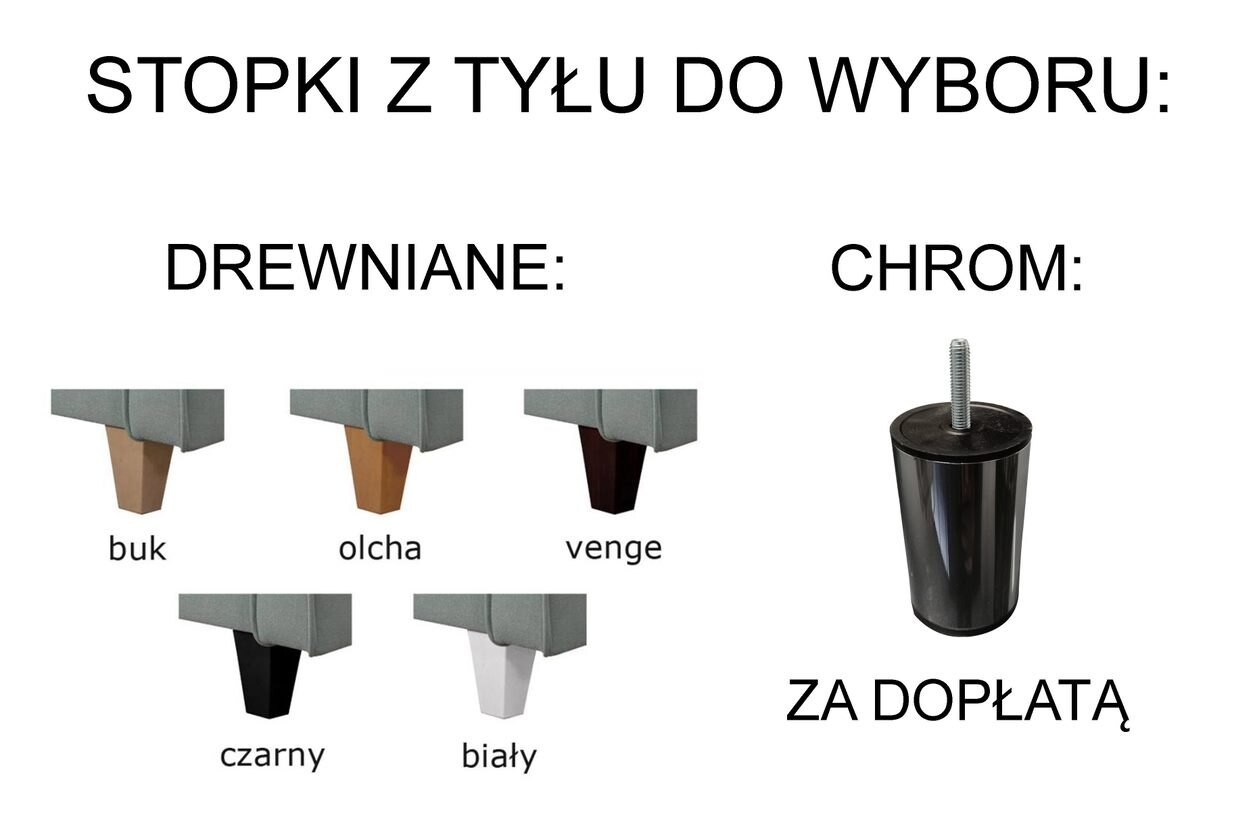 - Nóżki z przodu: metalowe, chromowane lub czarne. Nóżki z tyłu: drewniane lub metalowe (metalowe za dopłatą + 100 zł)