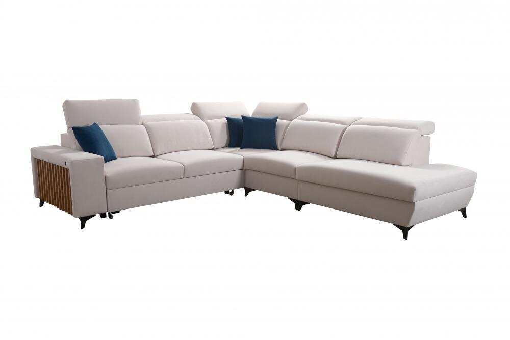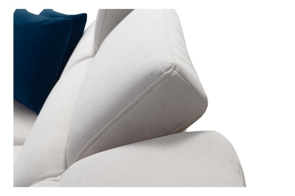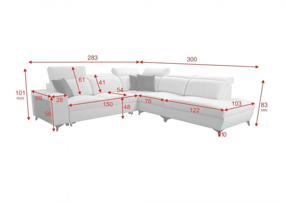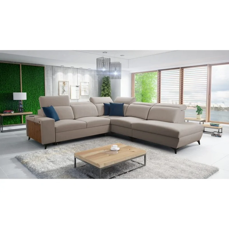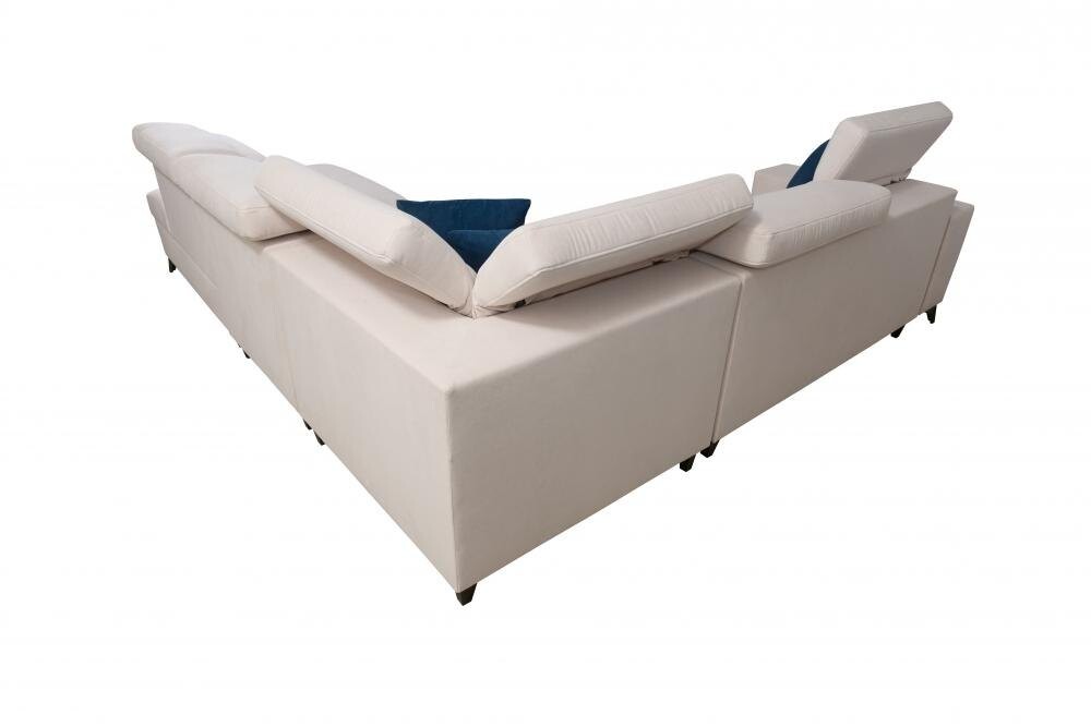 Stelaż narożnika wykonany jest z solidnego drewna oraz płyty, co gwarantuje stabilność i długowieczność mebla. Regulowane zagłówki pozwalają na dopasowanie pozycji do indywidualnych potrzeb, a wygodna funkcja spania umożliwia szybkie przekształcenie narożnika w wygodne łóżko. Pojemnik na pościel to dodatkowy atut, który pomaga utrzymać porządek w salonie.