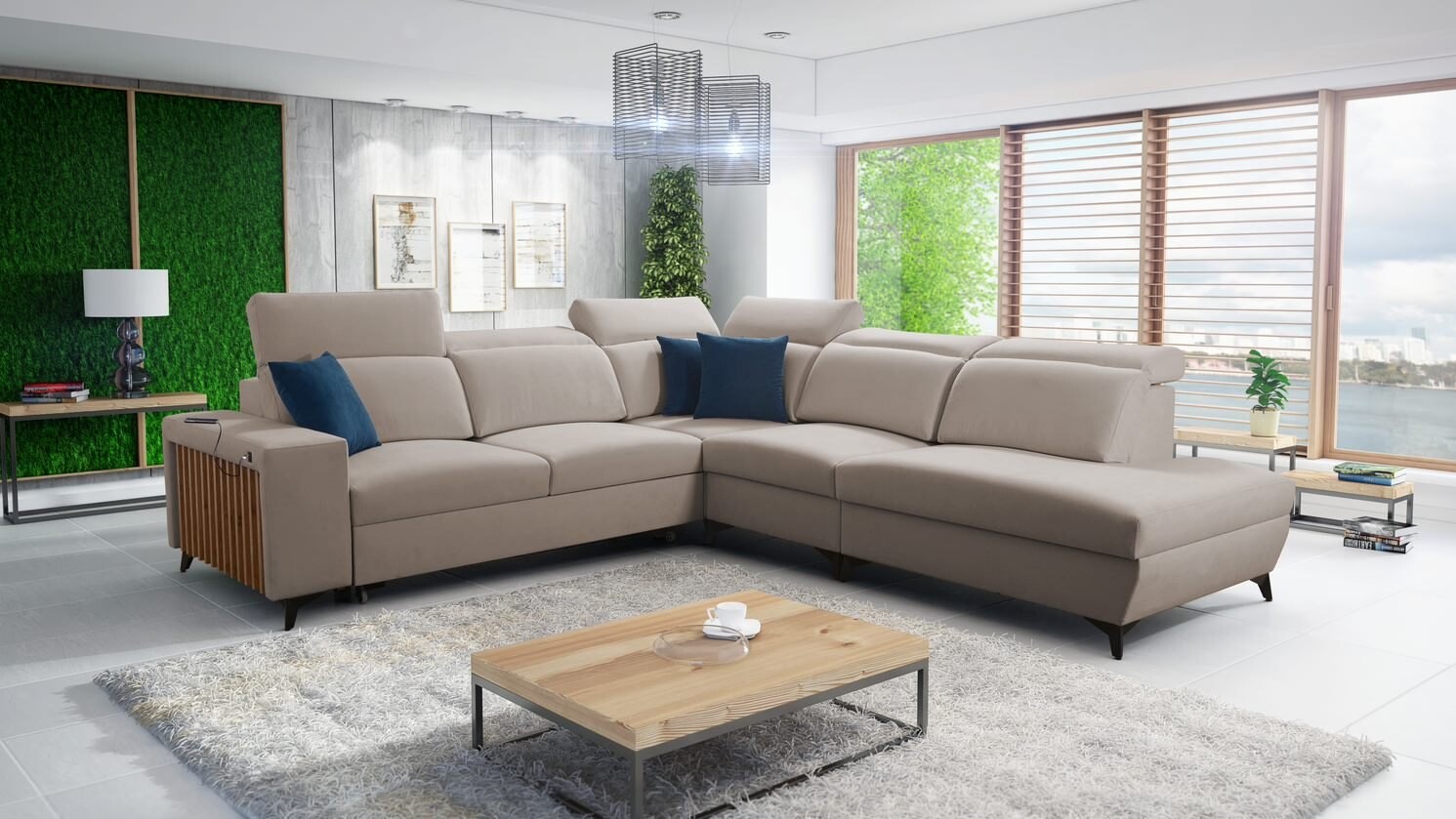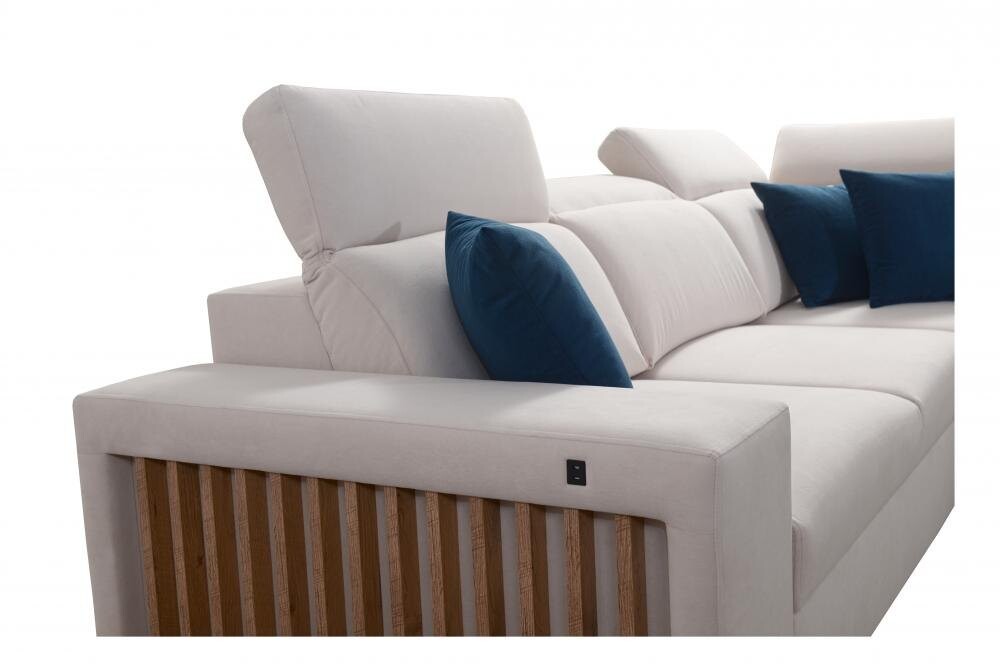 Dla większej personalizacji, narożnik oferuje możliwość wyboru rodzaju nóżek – metalowe, chromowane lub czarne z przodu oraz drewniane lub metalowe z tyłu (metalowe za dopłatą). Ozdobne lamele w podłokietniku dostępne są w różnych kolorach i wykończeniach, takich jak płyta lakierowana laminat czy półka laminat, co pozwala na dodatkowe dopasowanie do stylu wnętrza. Dodatkowo, dostępne jest wejście USB w kolorze czarnym lub srebrnym.
