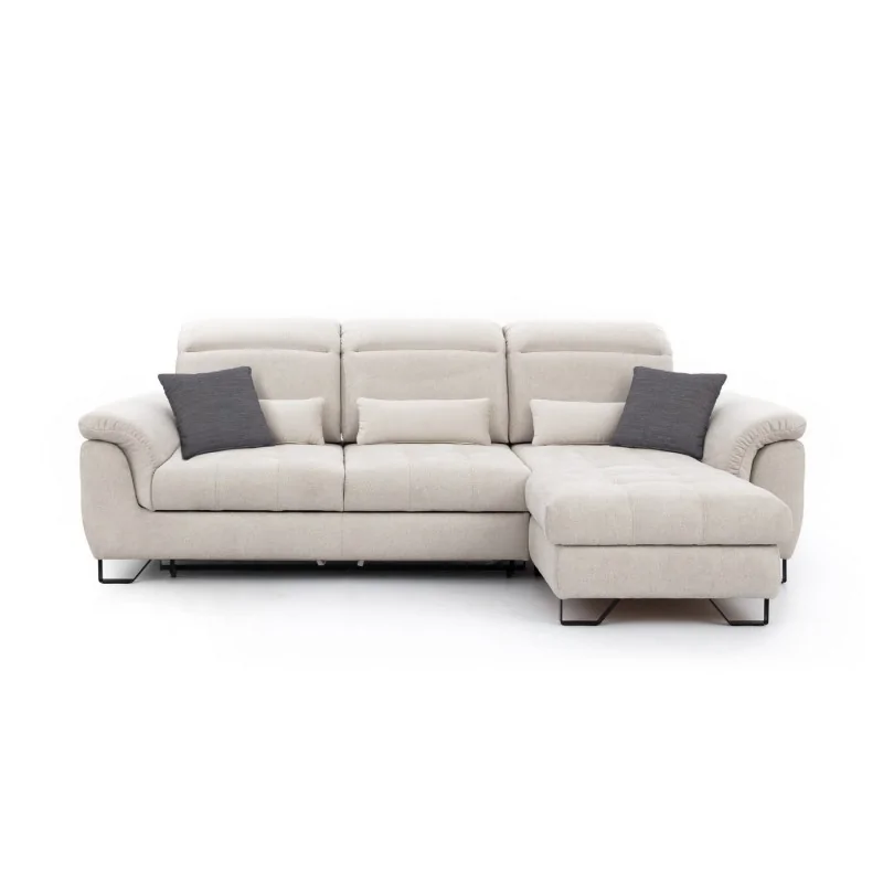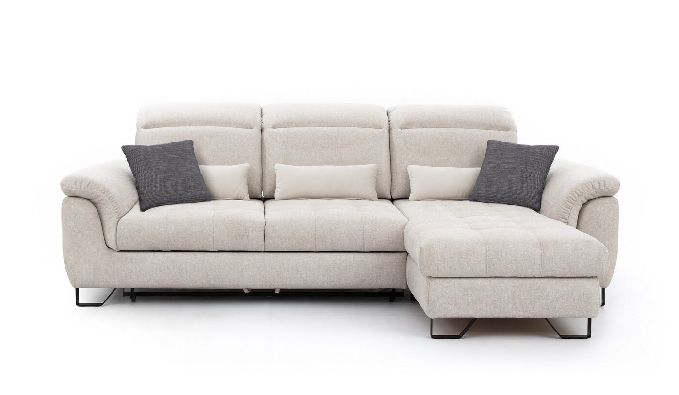 Narożnik wypoczynkowy Solar o wymiarach 280x201 cm łączy w sobie funkcjonalność i elegancję. Jego jasna tapicerka nadaje wnętrzu świeżości, a metalowe nóżki w kolorze czarnym lub srebrnym dodają nowoczesnego charakteru. Narożnik wyposażony jest w regulowane zagłówki oraz przesuwne oparcia, co pozwala na dostosowanie do indywidualnych potrzeb i zapewnia komfort na najwyższym poziomie. Dzięki funkcji spania i pojemnikowi na pościel, Solar jest idealnym rozwiązaniem zarówno na co dzień, jak i podczas wizyt gości.