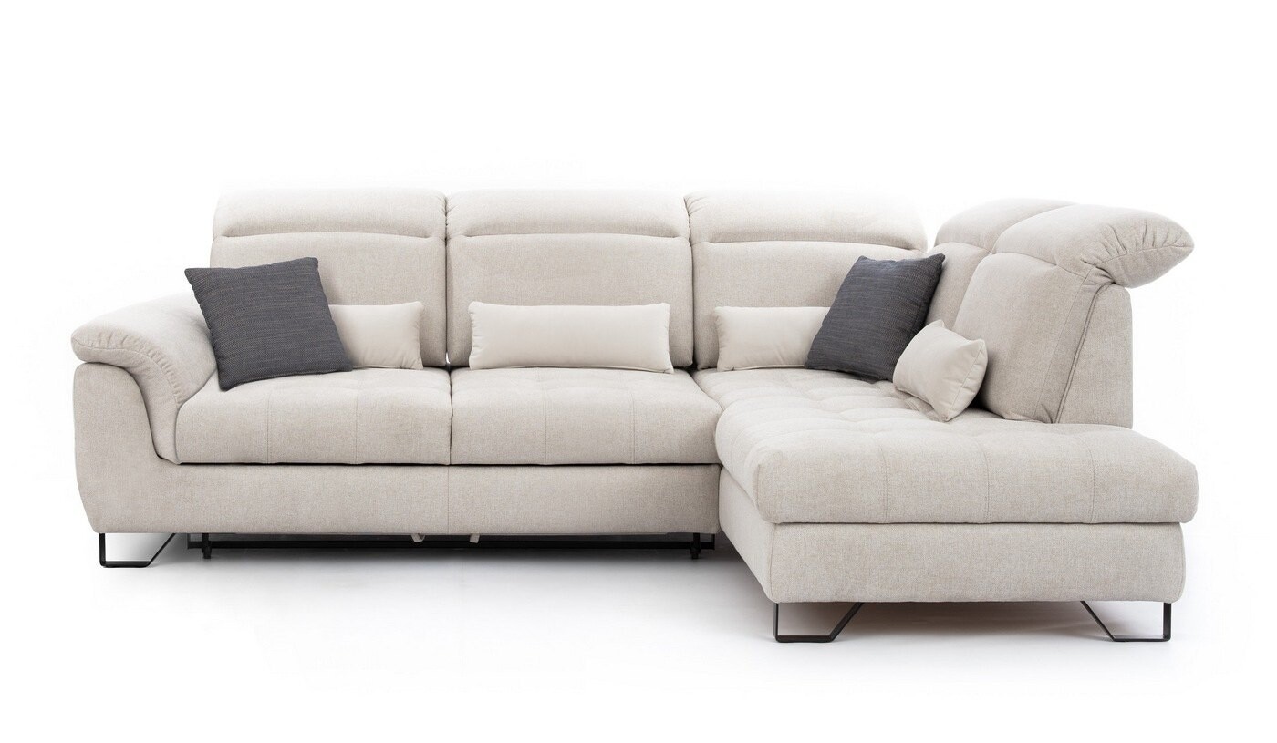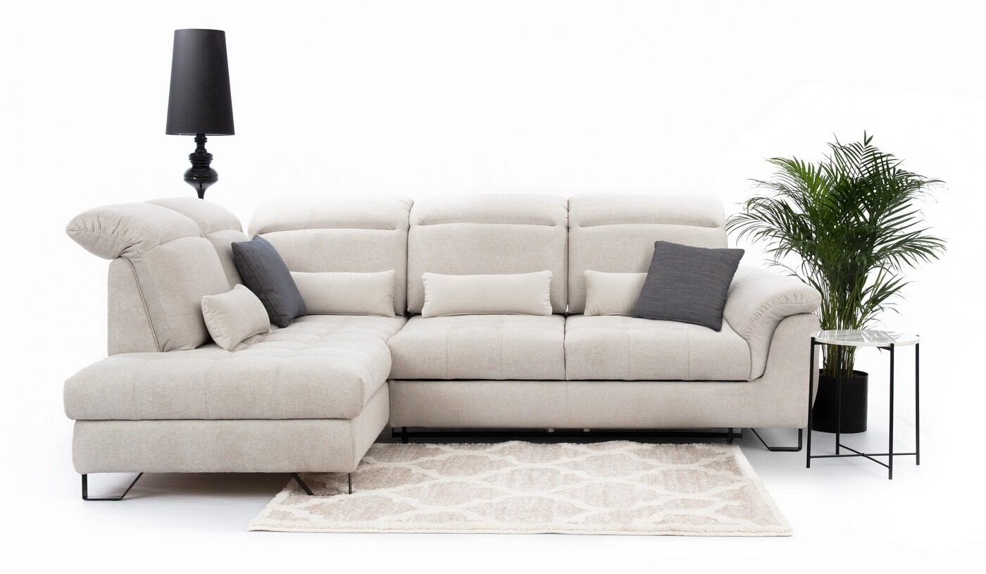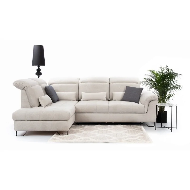 Narożnik Solar o wymiarach 284x218 cm to idealne połączenie elegancji i funkcjonalności. Jasna tapicerka i metalowe nóżki w kolorze czarnym lub srebrnym nadają mu nowoczesny wygląd, który doskonale komponuje się z różnymi stylami wnętrz. Wyposażony w wysokie, regulowane zagłówki oraz przesuwne oparcia, zapewnia maksymalny komfort użytkowania. Dzięki funkcji spania i pojemnikowi na pościel, narożnik Solar jest praktycznym rozwiązaniem zarówno na co dzień, jak i na specjalne okazje.