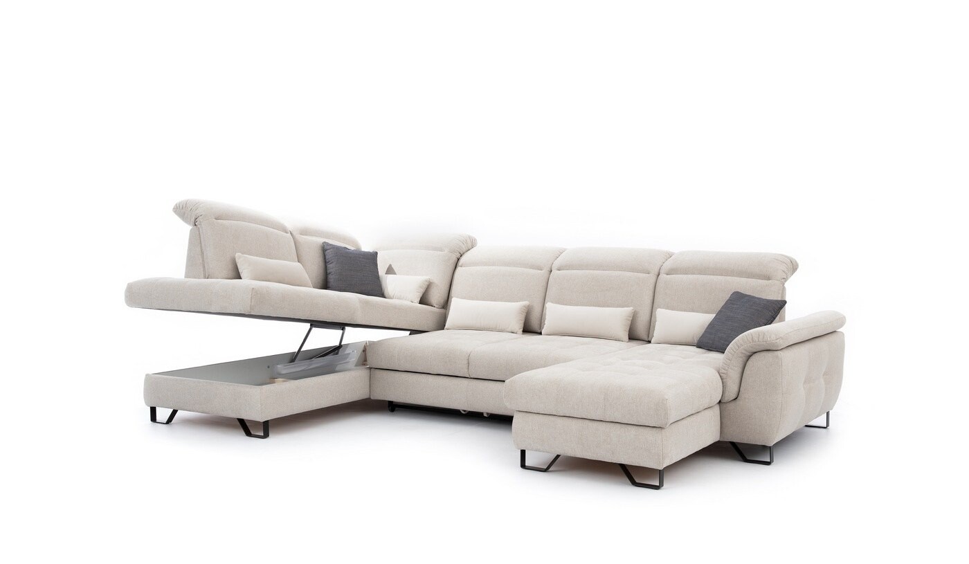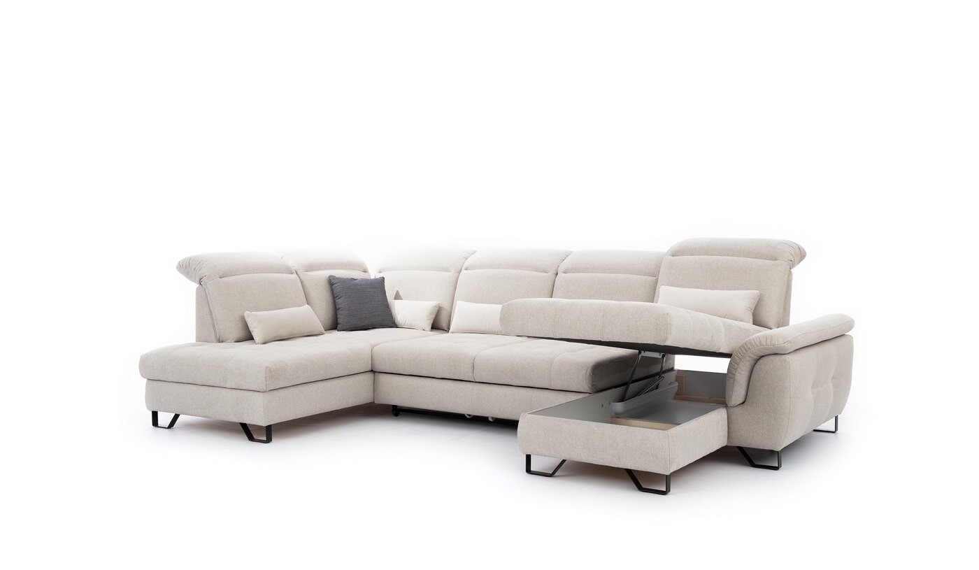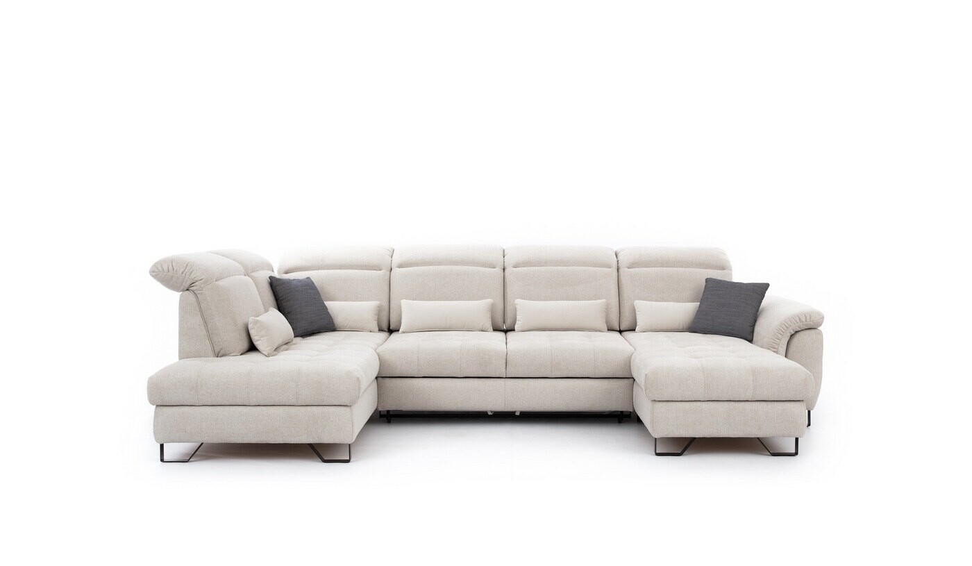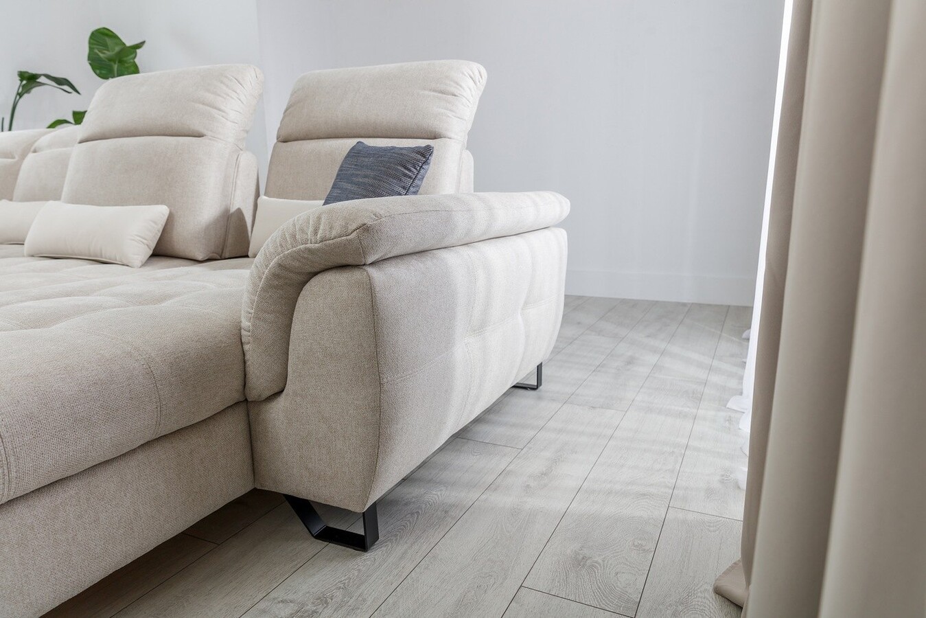 Narożnik Solar o wymiarach 218x355x201 cm to idealne rozwiązanie dla dużych przestrzeni. Jasna tapicerka w połączeniu z metalowymi nóżkami w kolorze czarnym lub srebrnym nadaje mu nowoczesny i elegancki wygląd. Dzięki regulowanym zagłówkom i przesuwnym oparciom, narożnik zapewnia wyjątkowy komfort użytkowania. Wysuwana funkcja spania oraz dwa pojemniki na pościel czynią go niezwykle praktycznym, idealnym zarówno do codziennego użytku, jak i na wyjątkowe okazje.