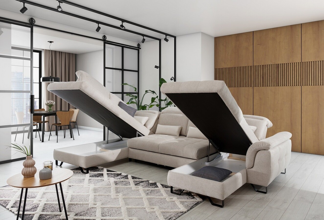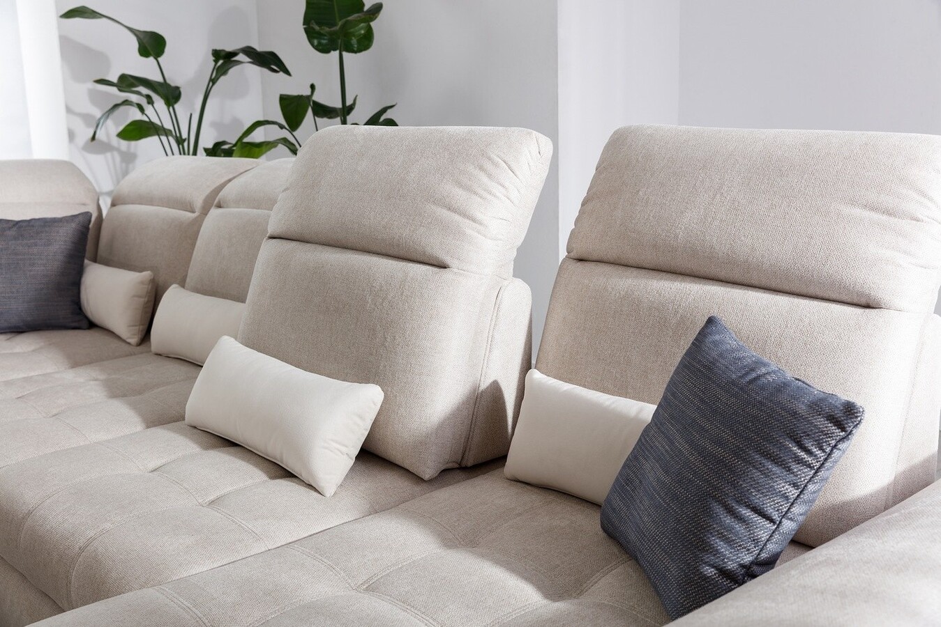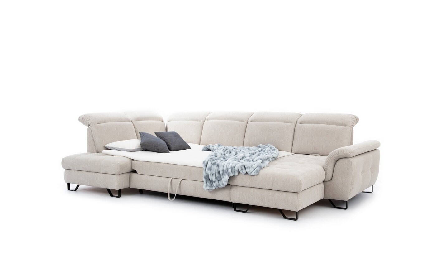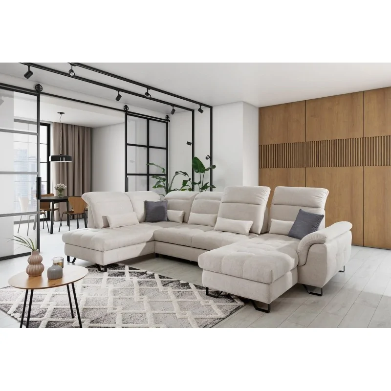 Narożnik Solar o wymiarach 218x355x201 cm to idealne rozwiązanie dla dużych przestrzeni. Jasna tapicerka w połączeniu z metalowymi nóżkami w kolorze czarnym lub srebrnym nadaje mu nowoczesny i elegancki wygląd. Dzięki regulowanym zagłówkom i przesuwnym oparciom, narożnik zapewnia wyjątkowy komfort użytkowania. Wysuwana funkcja spania oraz dwa pojemniki na pościel czynią go niezwykle praktycznym, idealnym zarówno do codziennego użytku, jak i na wyjątkowe okazje.