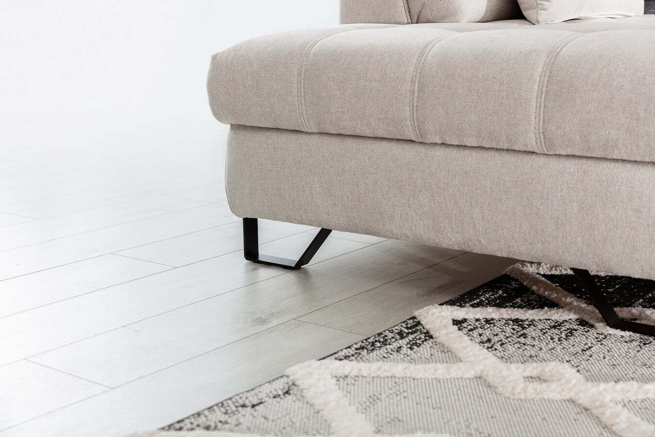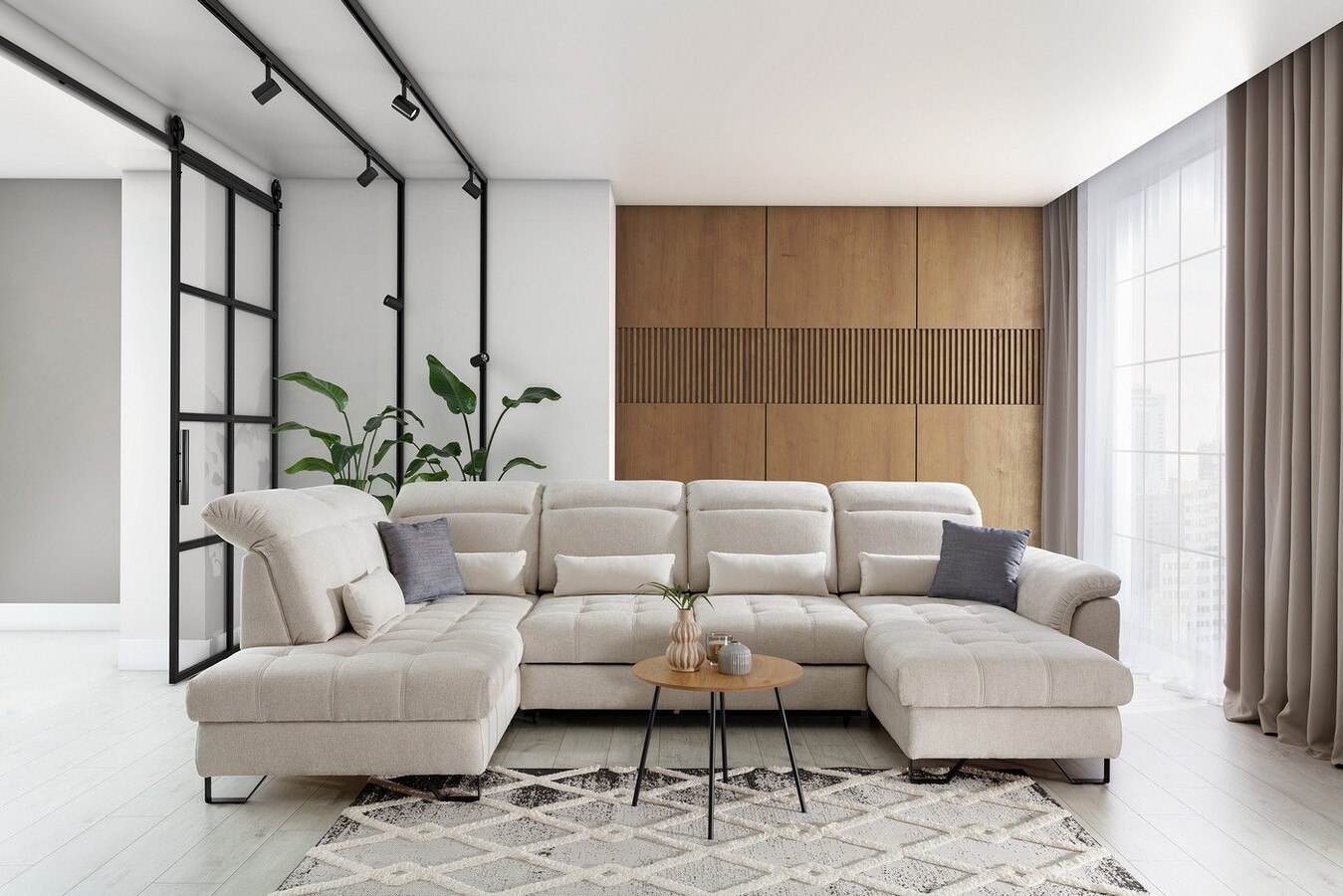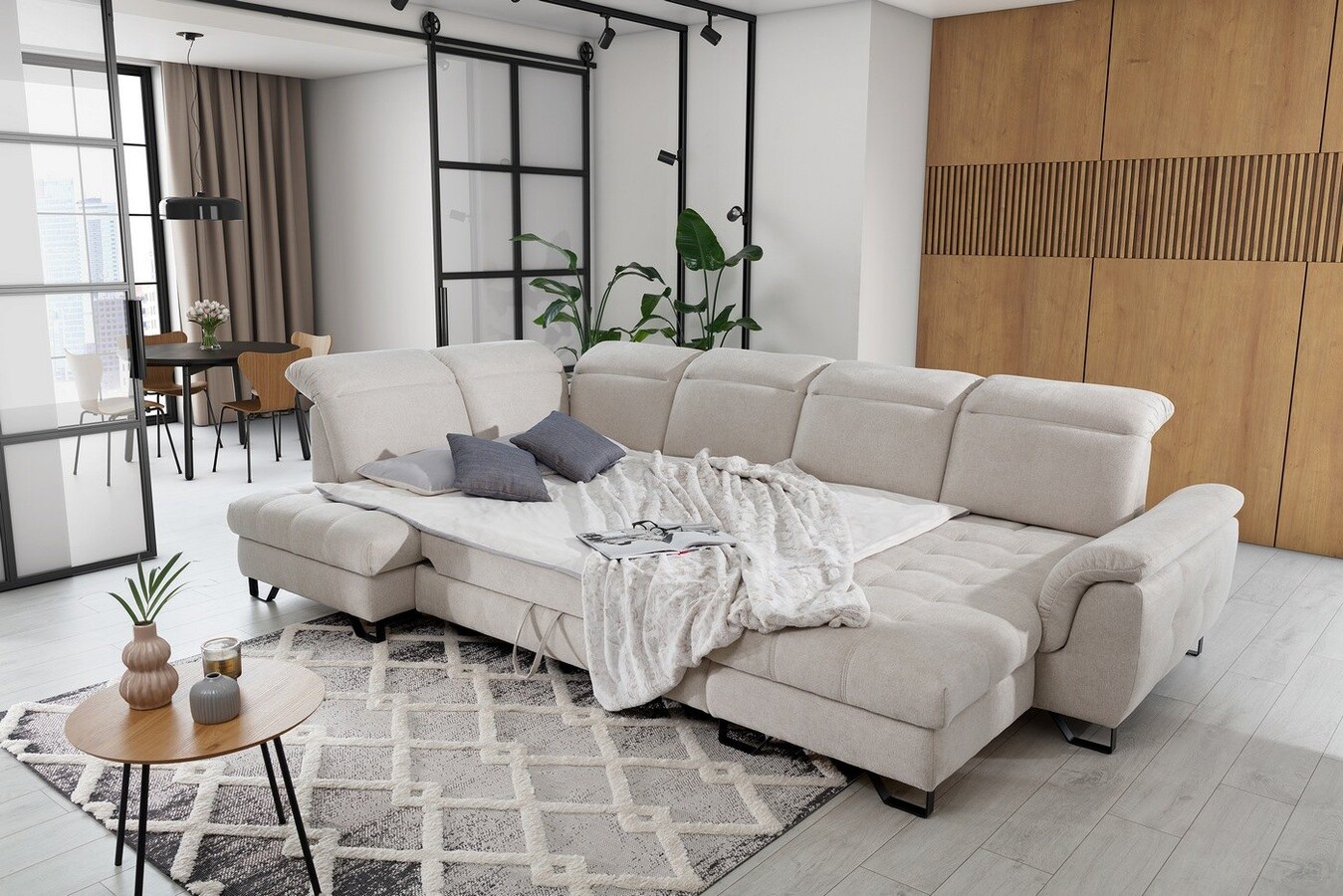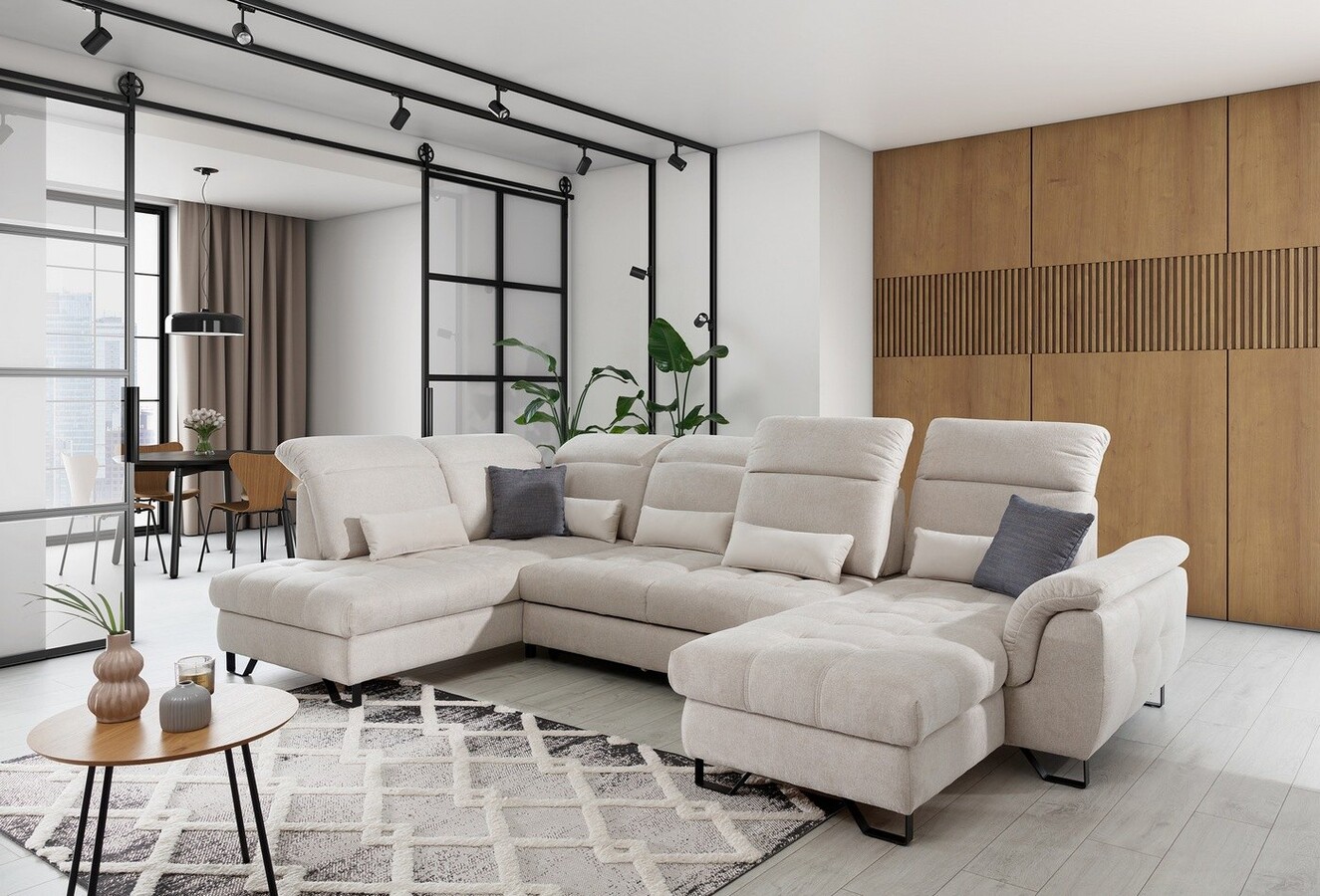 Narożnik Solar o wymiarach 218x355x201 cm to idealne rozwiązanie dla dużych przestrzeni. Jasna tapicerka w połączeniu z metalowymi nóżkami w kolorze czarnym lub srebrnym nadaje mu nowoczesny i elegancki wygląd. Dzięki regulowanym zagłówkom i przesuwnym oparciom, narożnik zapewnia wyjątkowy komfort użytkowania. Wysuwana funkcja spania oraz dwa pojemniki na pościel czynią go niezwykle praktycznym, idealnym zarówno do codziennego użytku, jak i na wyjątkowe okazje.