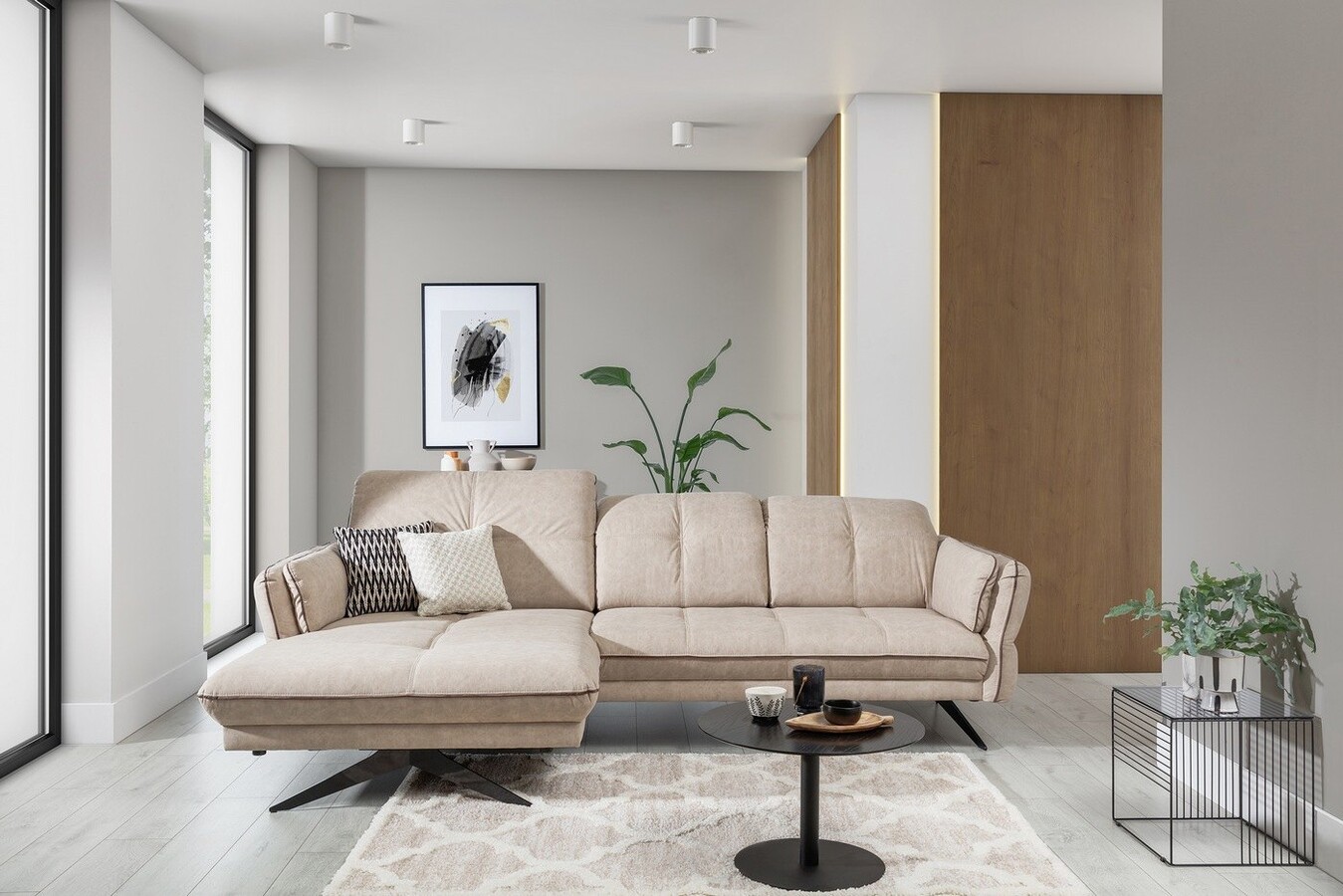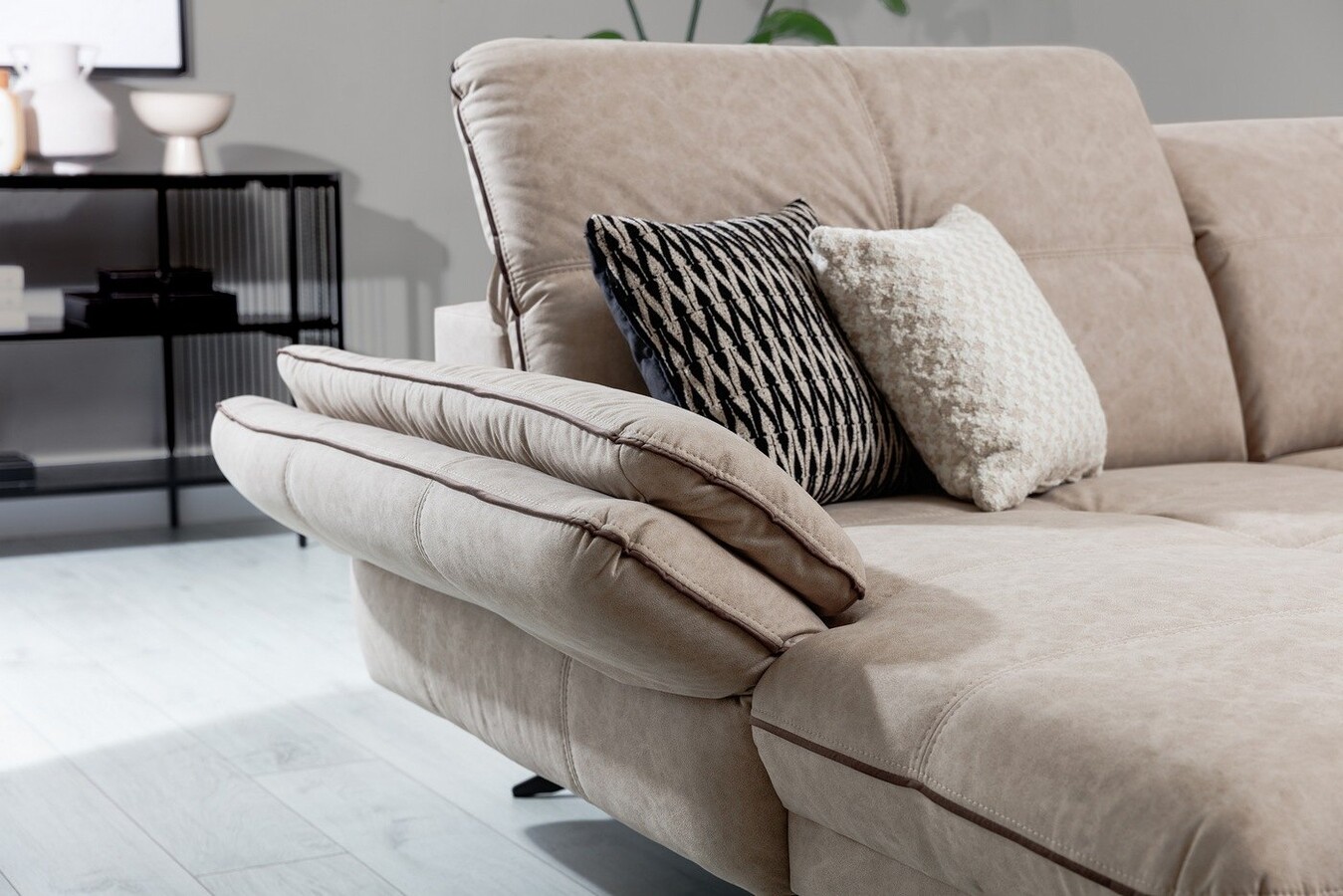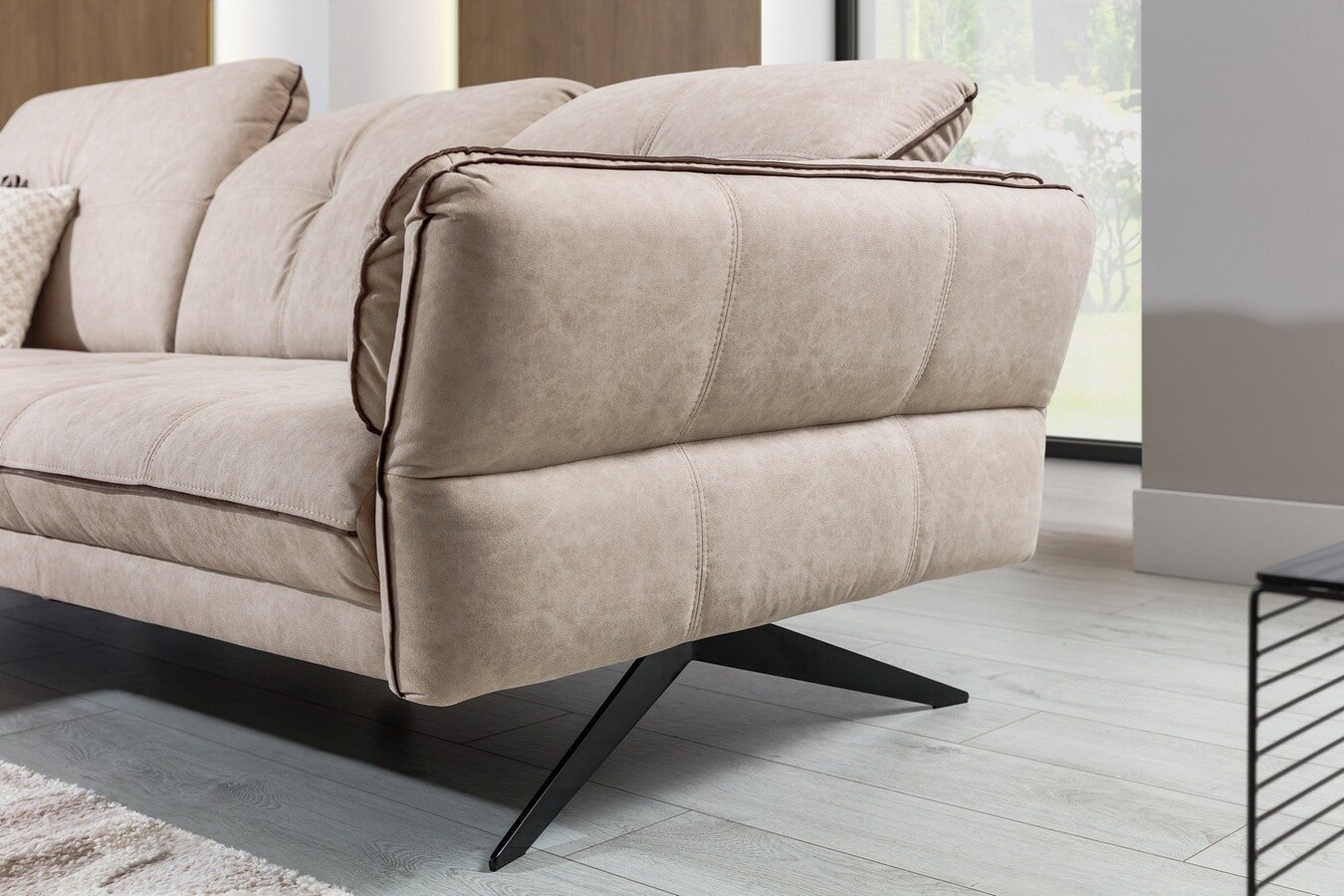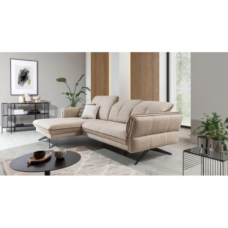 Narożnik Marbella to elegancka i funkcjonalna sofa o wymiarach 287x170 cm, idealna do nowoczesnych wnętrz. Jego subtelny beżowy kolor oraz minimalistyczny design doskonale wpisują się w różnorodne aranżacje salonów. Konstrukcja sofy osadzona jest na smukłych, metalowych nogach, które można wybrać w formie płóz lub pojedynczych nóg w kolorze czarnym lub srebrnym. Dzięki regulowanym zagłówkom i podłokietnikom, sofa zapewnia wysoki komfort użytkowania.