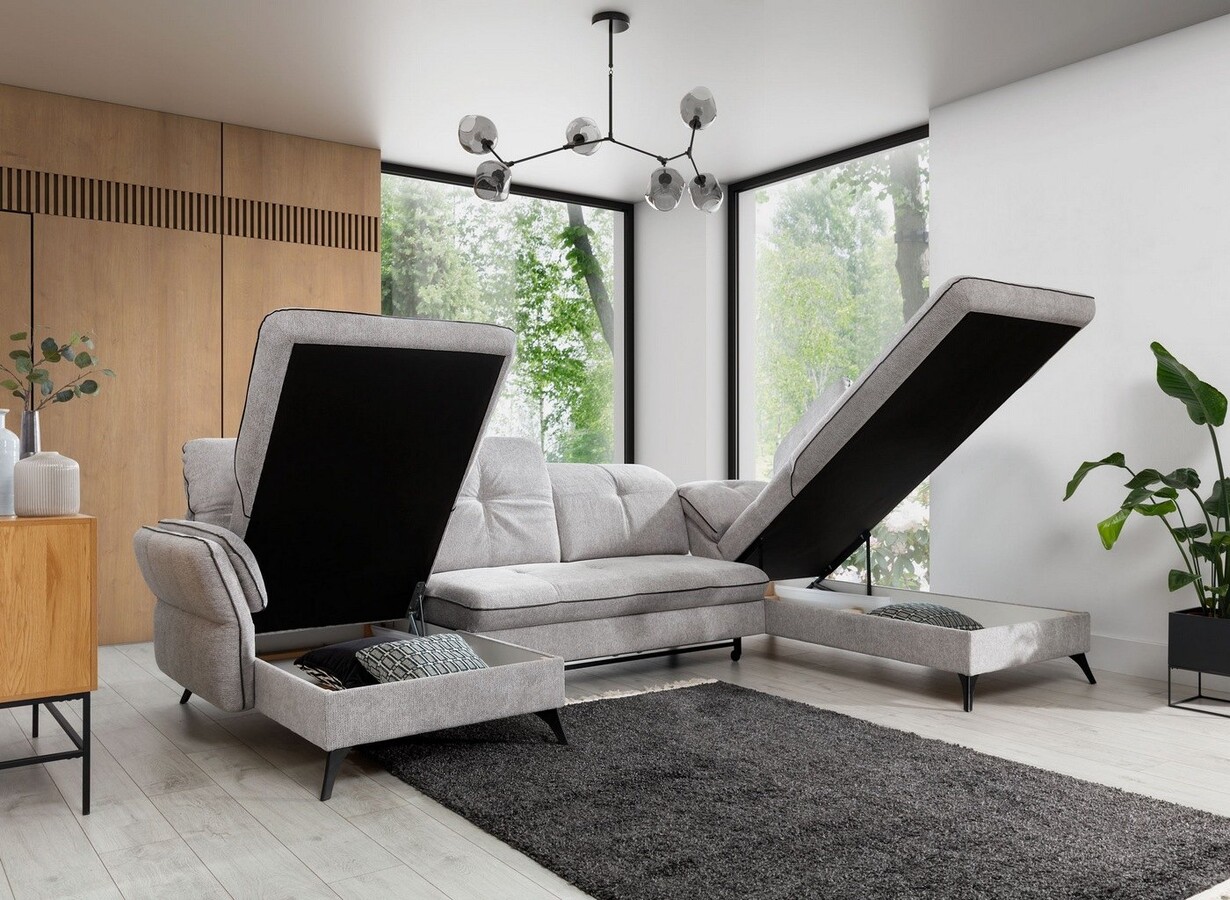 Narożnik Preston wyróżnia się zaawansowaną funkcjonalnością. Posiada wysuwaną funkcję spania, która łatwo przekształca go w wygodne łóżko o powierzchni 255x121 cm, oraz dwa pojemniki na pościel, co pozwala na praktyczne przechowywanie kołder i poduszek. Dzięki regulowanym podłokietnikom, szerokość narożnika można dostosować od 321 cm do 335 cm, co zwiększa jego wszechstronność i dostosowanie do różnych przestrzeni. Standardowe nogi w kolorze czarnym lub srebrnym dodają narożnikowi nowoczesnego wyglądu, a możliwość zamówienia na płozach oferuje dodatkową opcję stylizacji.