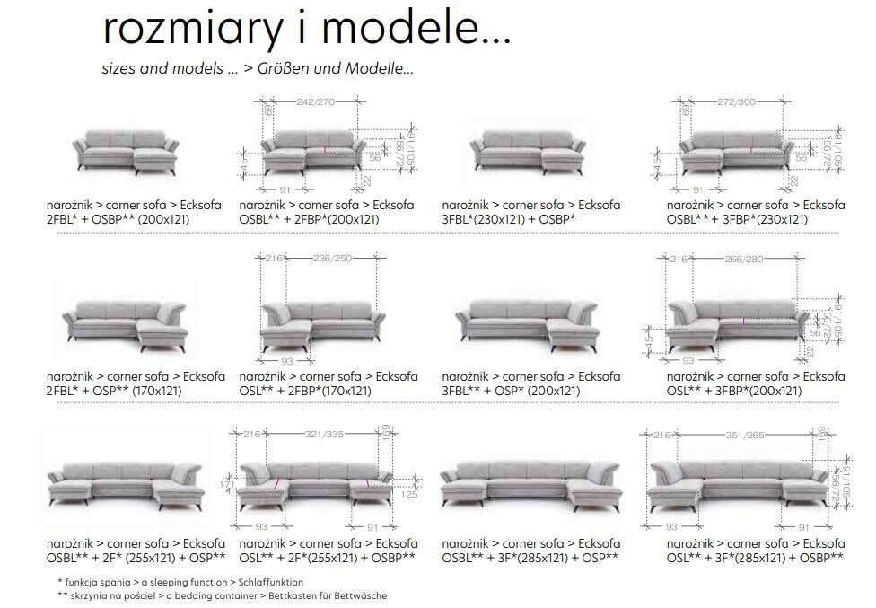 Narożnik Preston dostępny jest w różnych konfiguracjach i rozmiarach, co umożliwia idealne dopasowanie do każdej przestrzeni. Standardowe wymiary to 216x321/335x169 cm, ale dostępne są również mniejsze wersje, takie jak 242/270x169 cm czy 236/250x216 cm. Małe poduszki widoczne na zdjęciu nie są częścią wyposażenia narożnika, co pozwala na dowolne aranżowanie dodatków według własnego gustu. Wysokiej jakości materiały i solidne wykonanie gwarantują trwałość i odporność na codzienne użytkowanie, zapewniając jednocześnie elegancki wygląd przez wiele lat.