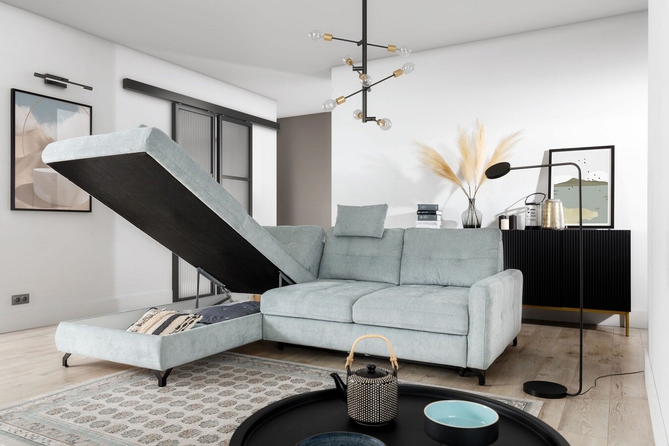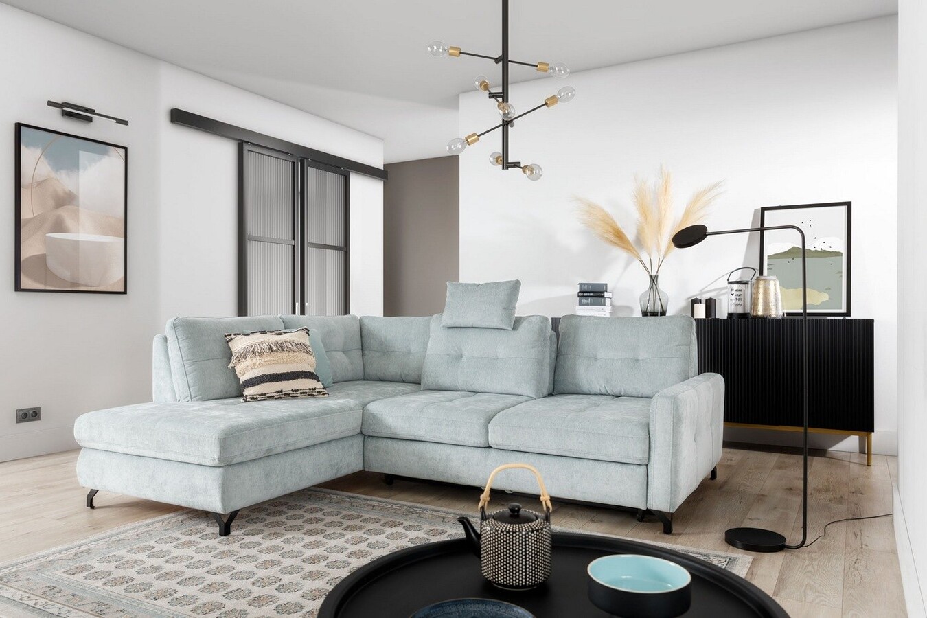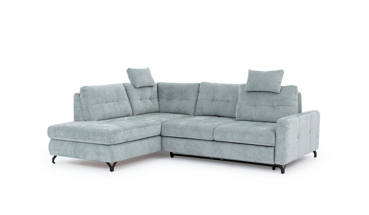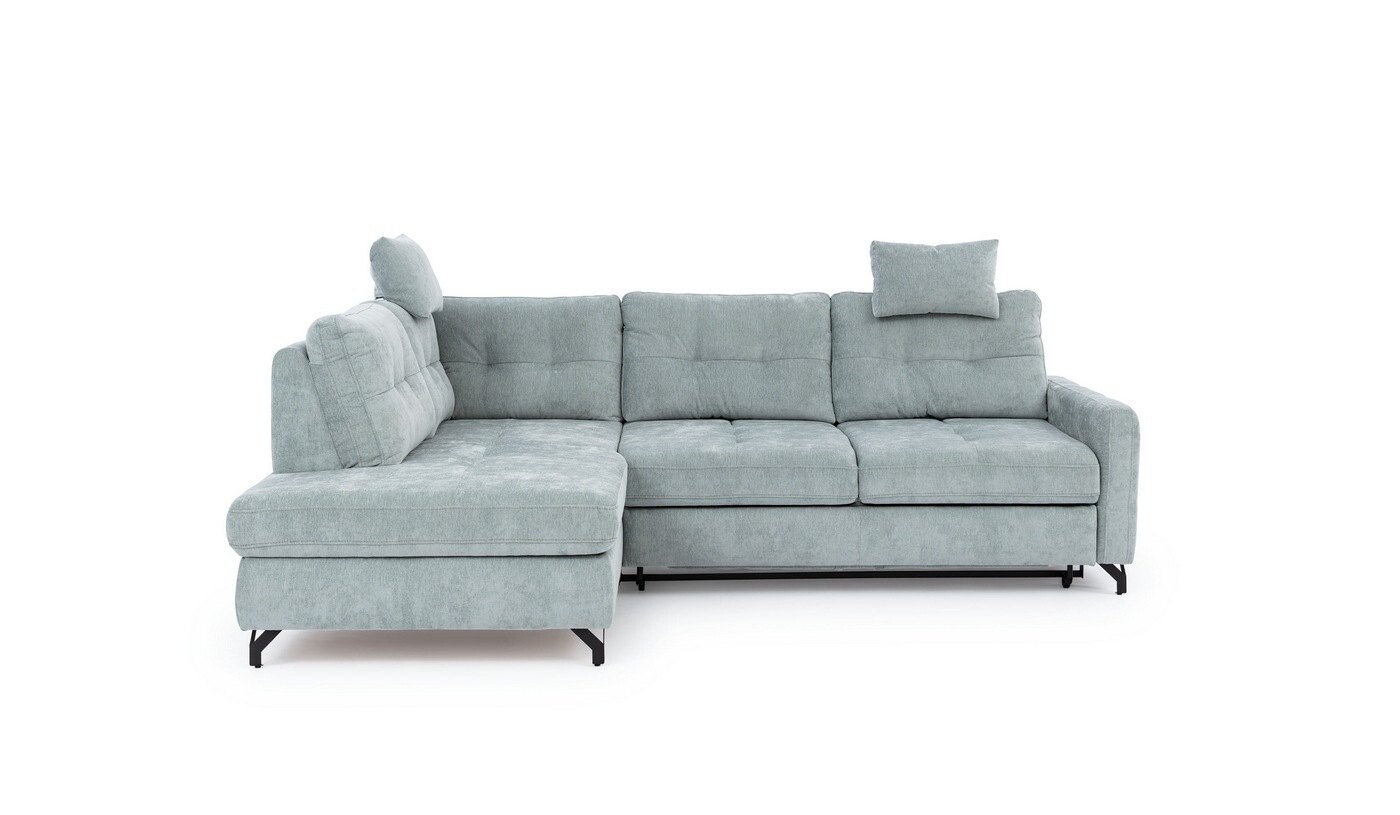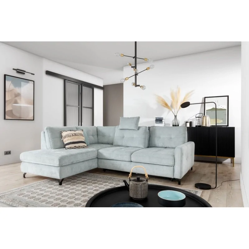 Rozkładany narożnik London o wymiarach 250x205 cm to elegancki i funkcjonalny mebel, idealny do nowoczesnych wnętrz. Jego jasnoniebieska tapicerka nadaje wnętrzu świeżości i lekkości, a pikowania na oparciach, siedziskach i bokach podkreślają nowoczesny styl mebla. Narożnik London wyposażony jest w przesuwny oparcia, które umożliwiają dostosowanie komfortu do indywidualnych potrzeb użytkownika. Solidne nogi dostępne w kolorze czarnym lub srebrnym dodają nowoczesnego akcentu i zapewniają stabilność mebla.