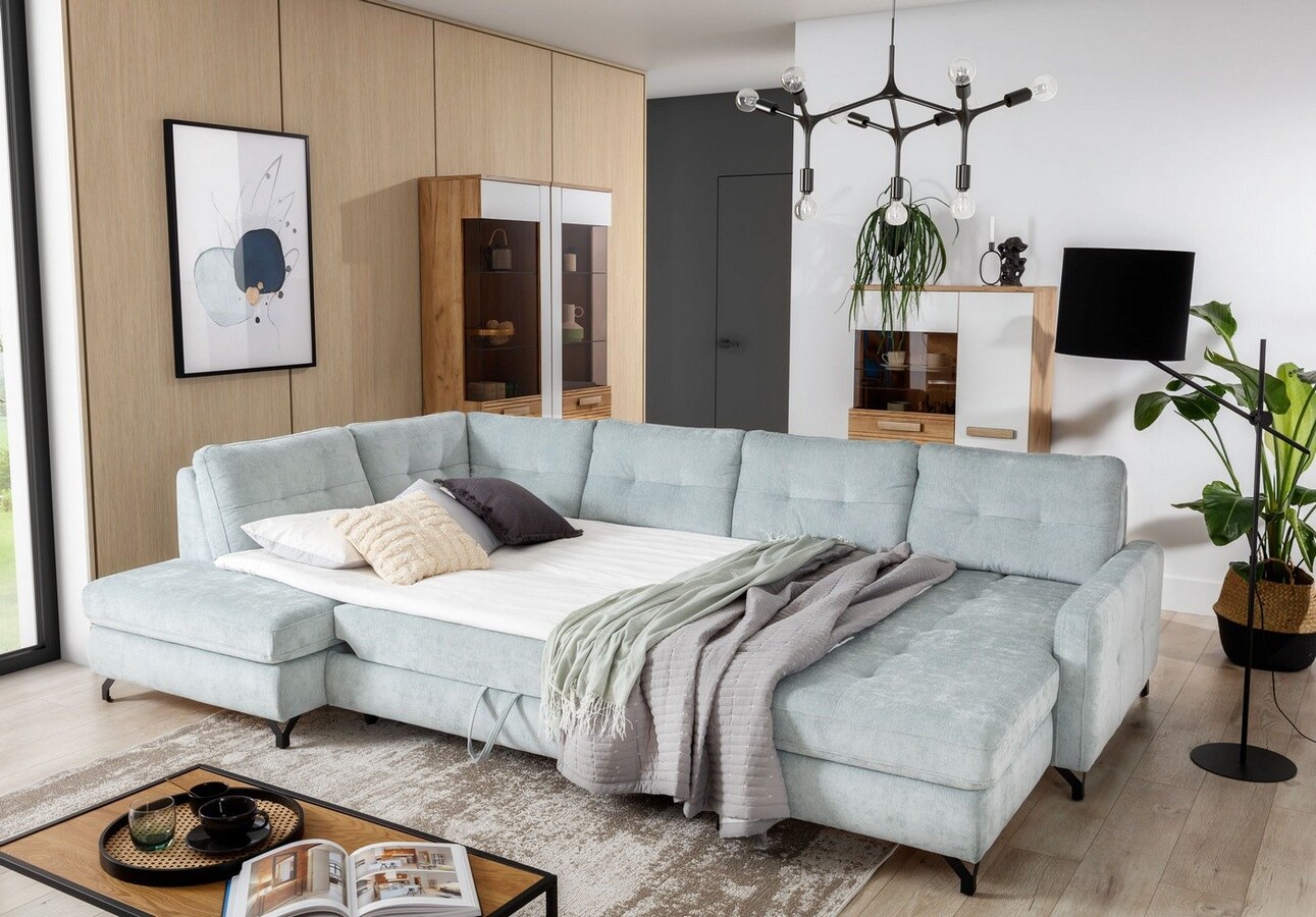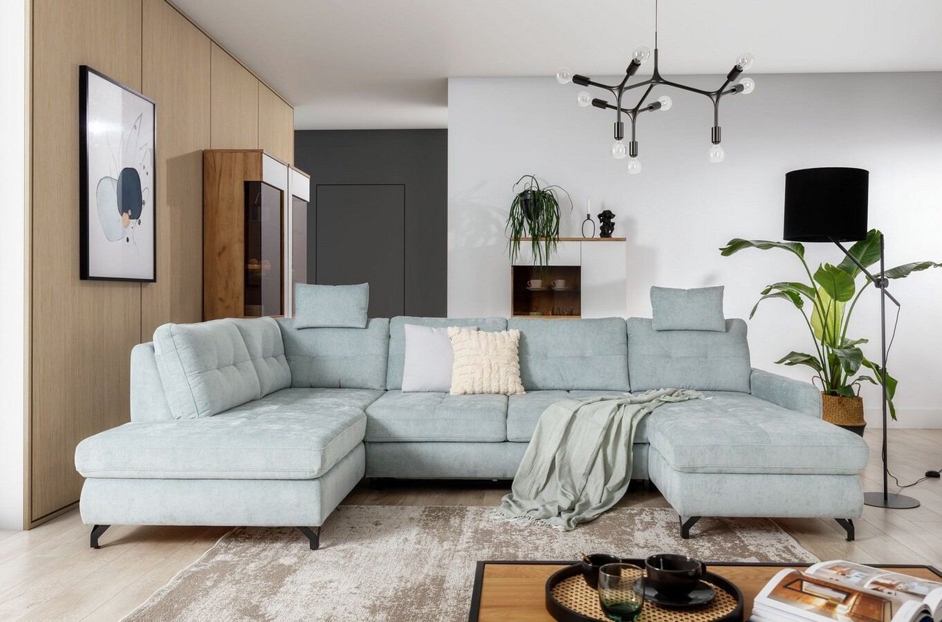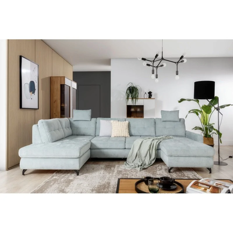 Przestronny narożnik London o imponujących wymiarach 205x322x186 cm to doskonały wybór dla dużych wnętrz, który łączy nowoczesny design z wyjątkową funkcjonalnością. Jego jasnoniebieska tapicerka wprowadza do wnętrza świeżość i lekkość, a pikowania na oparciach, siedziskach i bokach nadają mu elegancji. Narożnik London wyposażony jest w przesuwny oparcia, które pozwalają na elastyczne dostosowanie komfortu do indywidualnych potrzeb. Solidne nogi dostępne w kolorze czarnym lub srebrnym dodają nowoczesnego charakteru i stabilności mebla.