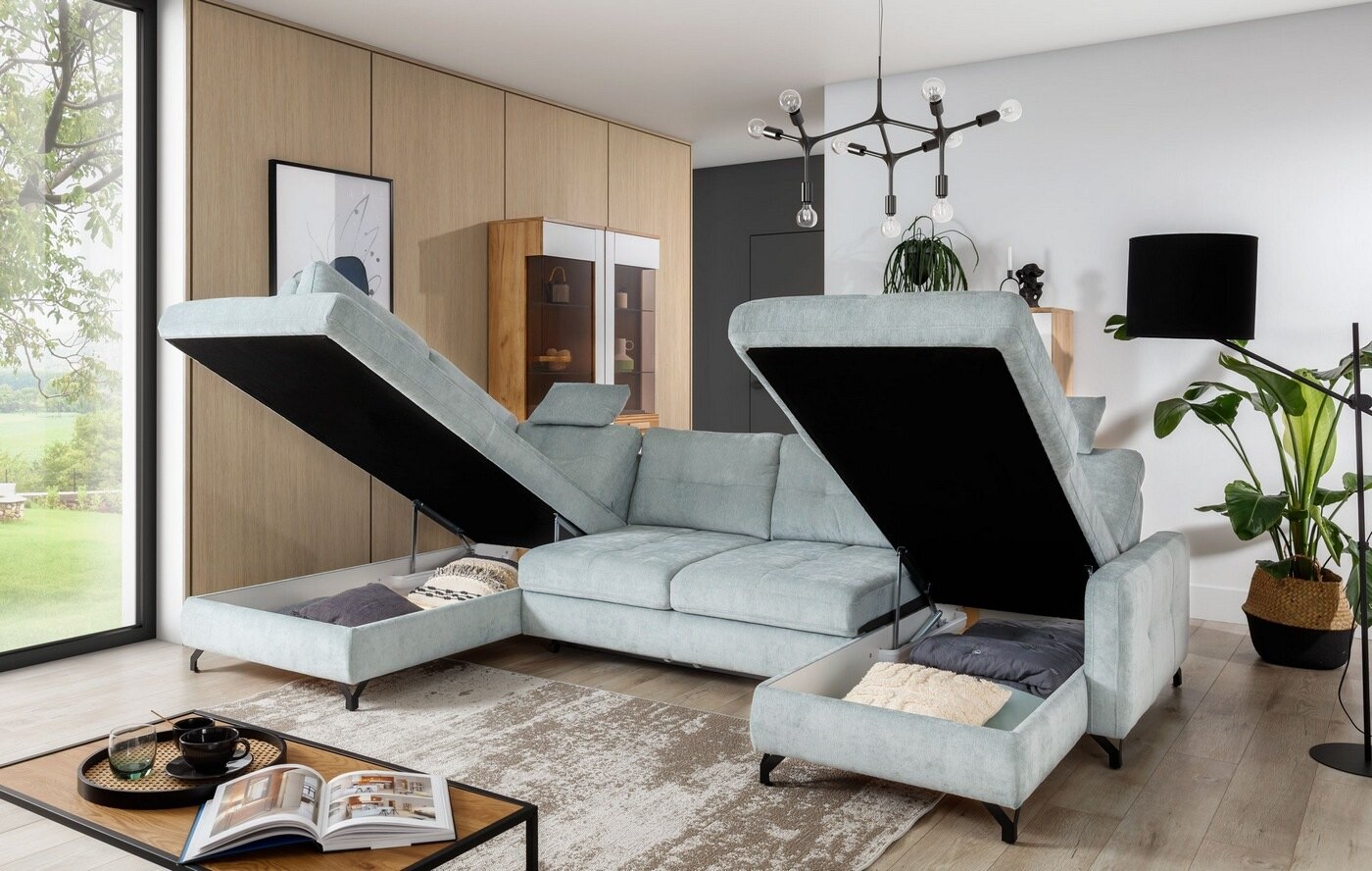 Narożnik London wyróżnia się zaawansowaną funkcjonalnością. Posiada wysuwaną funkcję spania, która umożliwia szybkie przekształcenie go w wygodne łóżko o powierzchni 260x143 cm, idealne na noclegi dla gości. Dwa duże schowki na pościel to praktyczne rozwiązanie, które pozwala na przechowywanie kołder, poduszek i innych niezbędnych przedmiotów. Przesuwne oparcia oraz dwa mobilne zagłówki (w cenie narożnika) zapewniają maksymalny komfort i wszechstronność, umożliwiając dostosowanie narożnika do różnych sytuacji i potrzeb.