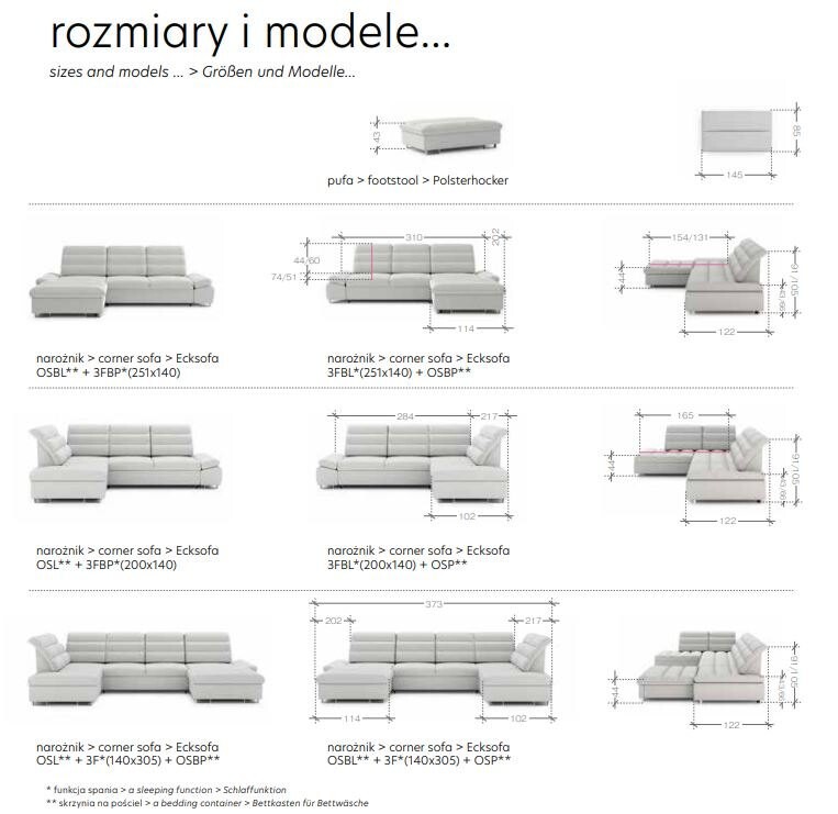 Narożnik Dalmir jest dostępny w różnych konfiguracjach, co pozwala na dopasowanie go do indywidualnych potrzeb przestrzennych. Możliwość zamówienia większych modeli o wymiarach 310x202 cm oraz 202x373x217 cm sprawia, że jest to mebel wszechstronny i elastyczny. Regulowane zagłówki, przesuwne oparcia i możliwość wyboru kolorów tkanin sprawiają, że narożnik Dalmir nie tylko prezentuje się elegancko, ale także oferuje wyjątkowy komfort użytkowania. Dzięki swojej funkcjonalności i estetyce, narożnik Dalmir będzie doskonałym wyborem do każdego nowoczesnego wnętrza.