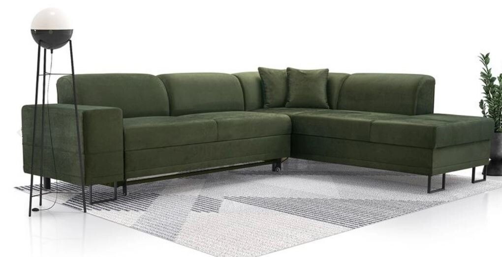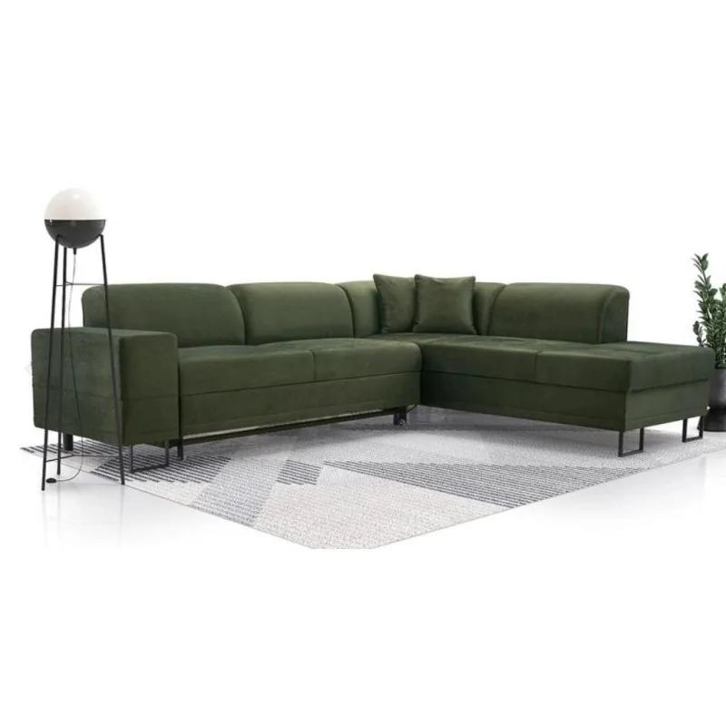 Narożnik Asteria łączy w sobie funkcjonalność, komfort i elegancki design, idealnie pasując do nowoczesnych wnętrz. Jego głęboka, soczysta zieleń w połączeniu z minimalistycznymi metalowymi nóżkami dodaje wnętrzu wyrafinowanego charakteru. Siedzisko, wyposażone w sprężyny faliste oraz wysokoelastyczną piankę T30, zapewnia optymalne wsparcie i komfort podczas siedzenia, co czyni go idealnym miejscem do relaksu.