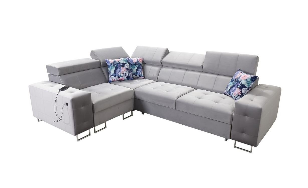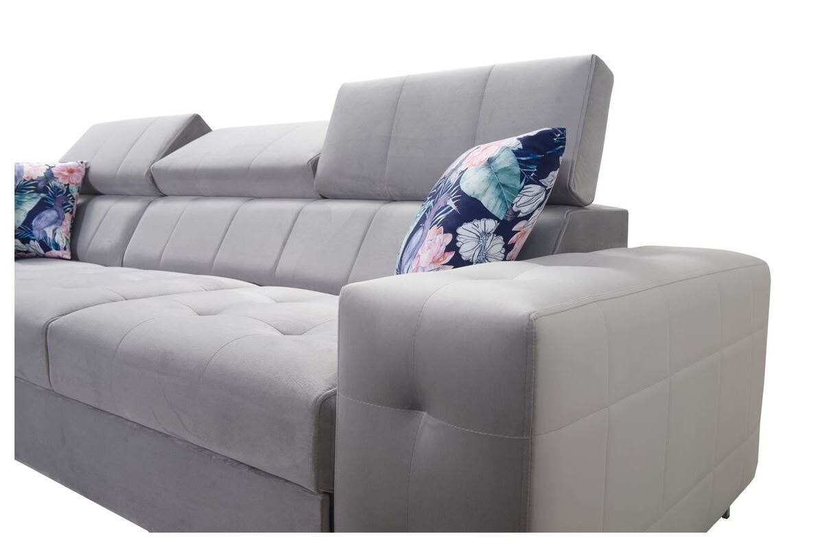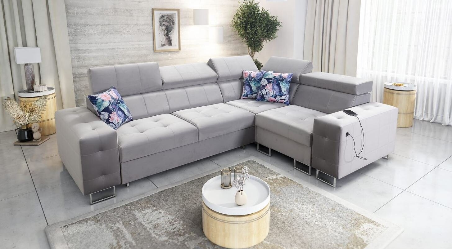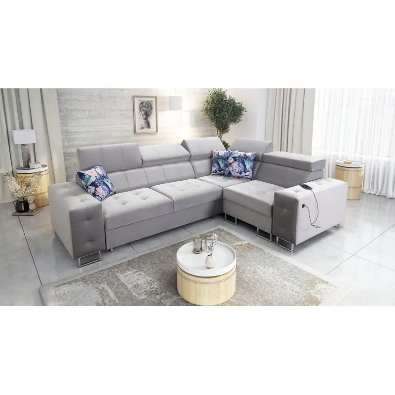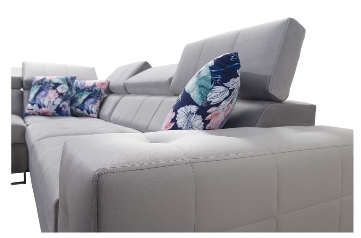 Narożnik dostępny jest w wielu kolorach plamoodpornych tkanin o różnych strukturach, takich jak welury i plecionki, co gwarantuje nie tylko estetykę, ale i praktyczność w codziennym użytkowaniu. Siedzisko wykonane ze sprężyn falistych oraz utwardzonej pianki T30 o grubości 10 cm zapewnia wyjątkowy komfort. Istnieje opcja zamówienia wypełnienia z pianki HR 35, co dodatkowo podnosi komfort użytkowania. Regulowane zagłówki umożliwiają dopasowanie pozycji do indywidualnych potrzeb, a funkcja spania sprawia, że narożnik staje się idealnym rozwiązaniem do salonu pełniącego również funkcję sypialni.