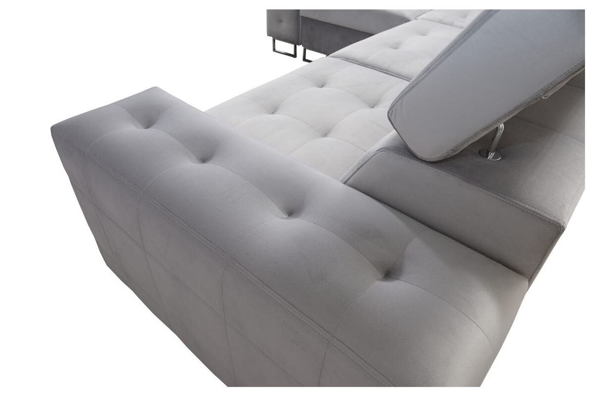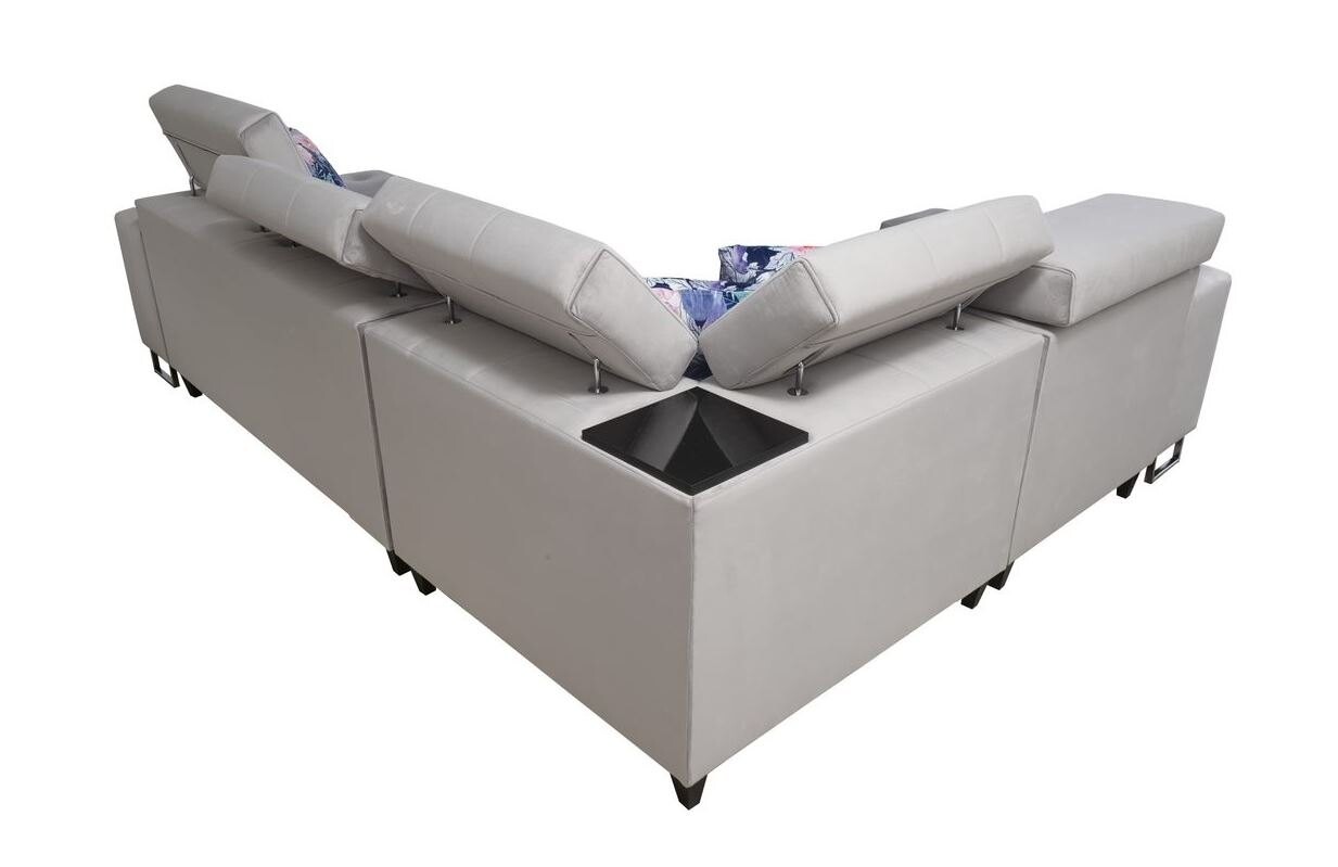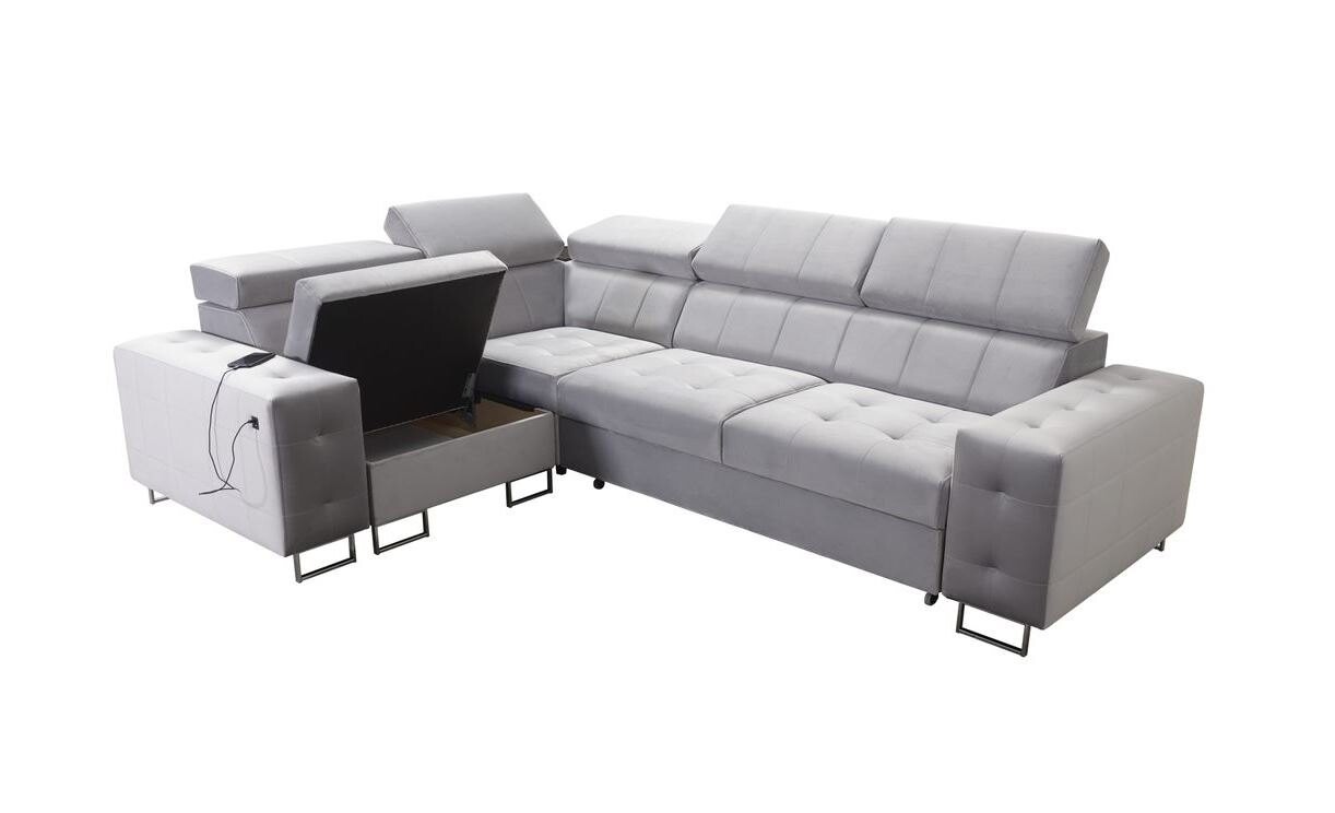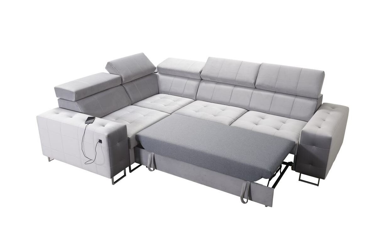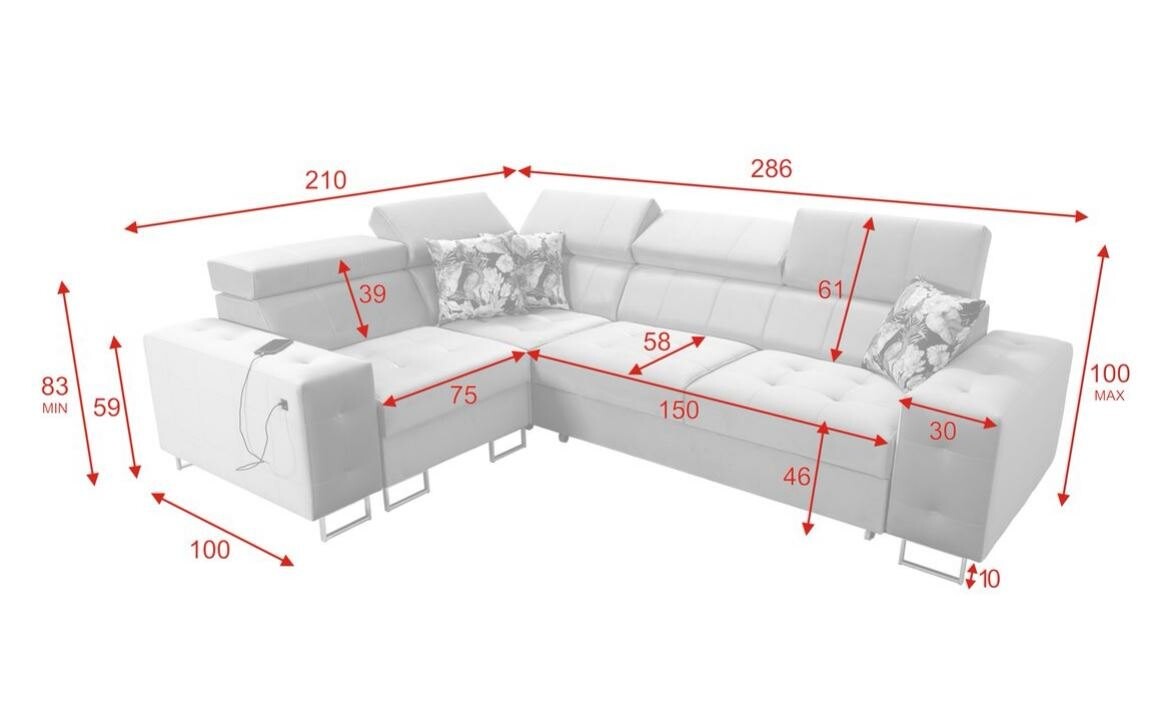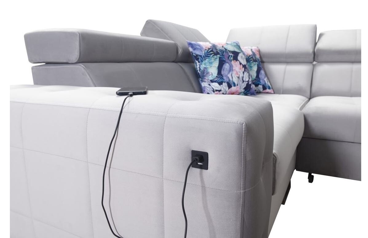 Narożnik Vertizo II wyposażony jest w pojemnik na pościel, co czyni go wyjątkowo praktycznym. Możliwość wykonania powierzchni spania w takiej samej tkaninie jak cały narożnik, za dopłatą, pozwala na spójność estetyczną. Nóżki z przodu mogą być metalowe, chromowane lub czarne, a nóżki z tyłu drewniane lub metalowe (metalowe za dopłatą). Wejście USB w kolorze czarnym lub srebrnym to praktyczne udogodnienie, umożliwiające ładowanie urządzeń bez wstawania z sofy. W rogu narożnika znajduje się praktyczna półka, której wybarwienie można dostosować do reszty mebla. Możliwość otrzymania darmowych próbek tkanin oraz bezpieczny transport na terenie całego kraju to dodatkowe zalety tego narożnika.