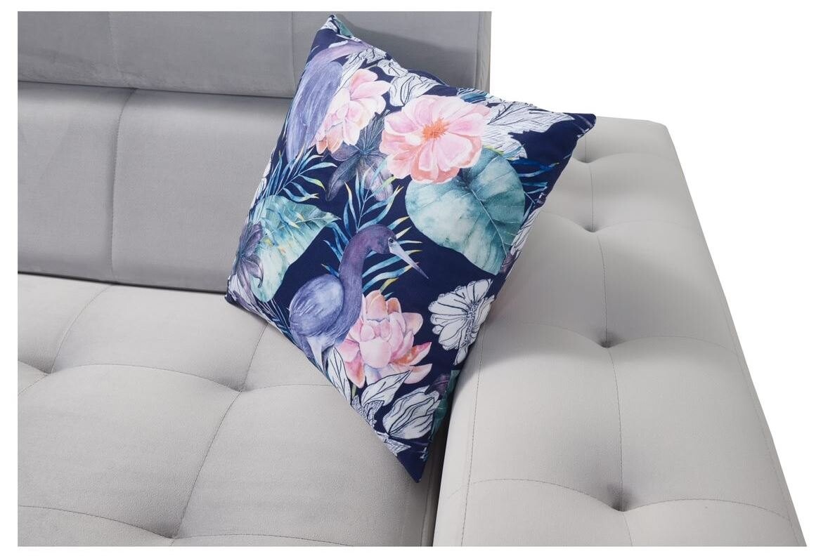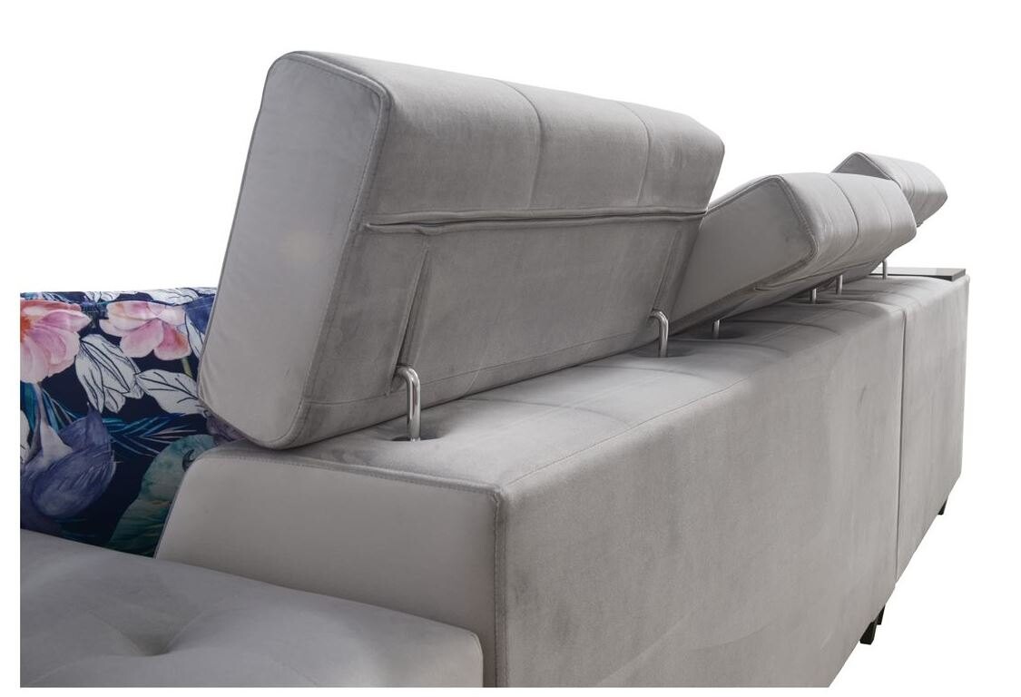 Na zdjęciu widzimy narożnik Vertizo II o wymiarach 210x286 cm, który zachwyca swoją elegancją i nowoczesnym designem. Pikowane siedzisko dodaje mu klasycznego uroku, jednocześnie podkreślając nowoczesne linie mebla. Jasnoszara tapicerka świetnie komponuje się z jasnymi i przestronnymi wnętrzami, a kolorowe poduszki z kwiatowym motywem wprowadzają przyjemny akcent dekoracyjny. Solidne nóżki wykonane z metalu wprowadzają nowoczesny akcent, jednocześnie zapewniając stabilność mebla.