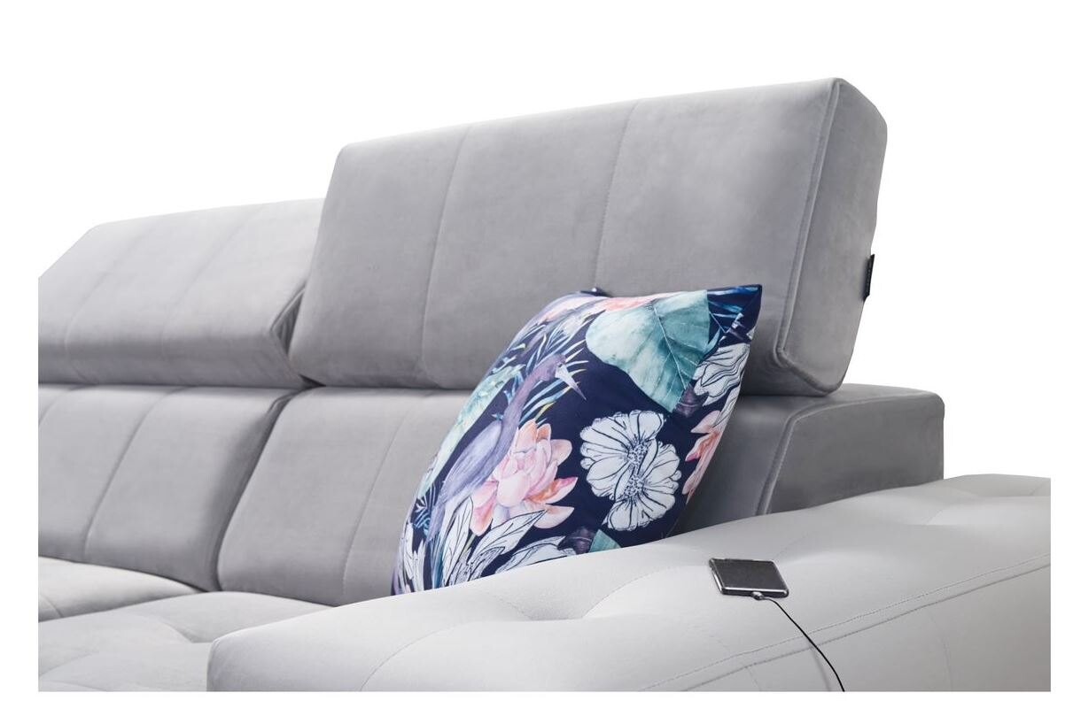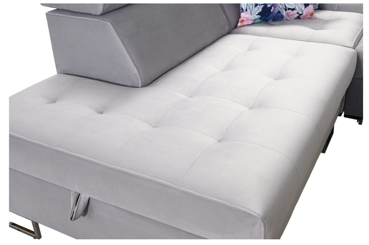 Narożnik Vertizo VI jest dostępny w wielu kolorach i strukturach tkanin, takich jak welur czy plecionki, co umożliwia dopasowanie do różnych aranżacji wnętrz. Przednie nóżki są metalowe, chromowane lub czarne, natomiast tylne mogą być drewniane lub metalowe (za dopłatą). Dodatkowym atutem jest funkcja spania oraz pojemnik na pościel, co sprawia, że narożnik jest idealnym rozwiązaniem dla gości. W rogu narożnika znajduje się praktyczna półka, której wybarwienie można wybrać.