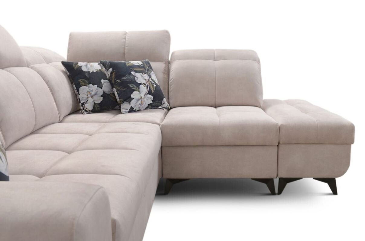 Narożnik ten wyposażony jest w funkcję spania, co czyni go praktycznym rozwiązaniem do salonu. Rozkładany mechanizm pozwala na szybkie i łatwe przekształcenie narożnika w łóżko, idealne dla gości. Dodatkowo narożnik posiada pojemnik na pościel, co ułatwia przechowywanie dodatkowych koców czy poduszek. Siedzisko wykonane z utwardzonej pianki T30 i sprężyn falistych gwarantuje wygodę i trwałość.
