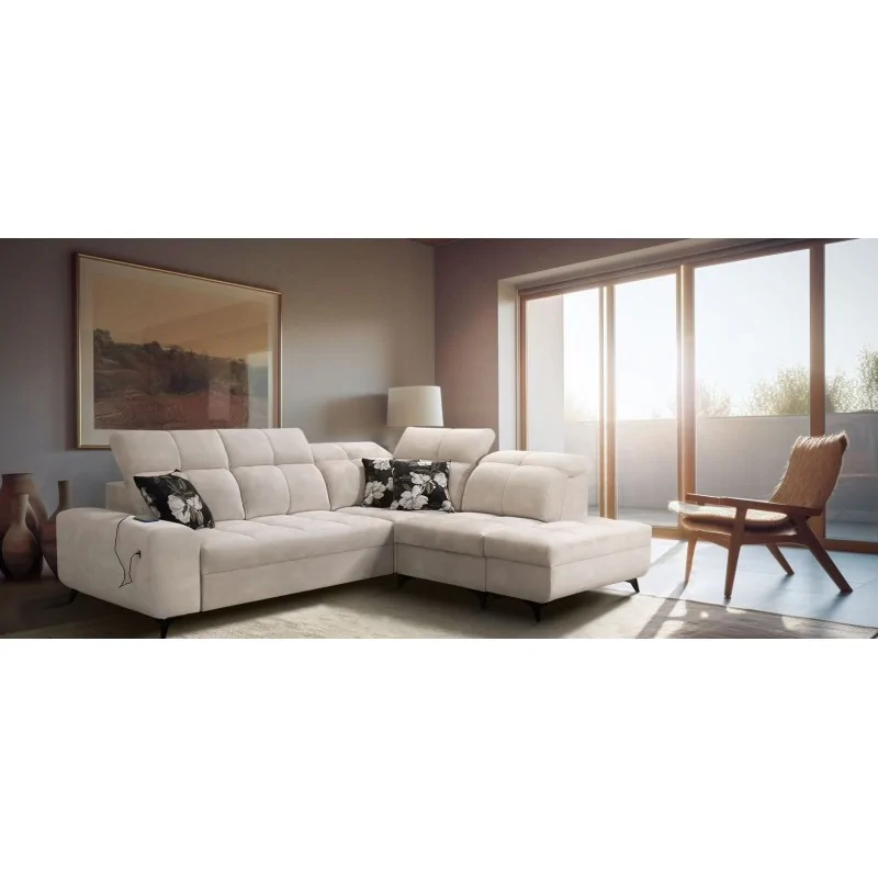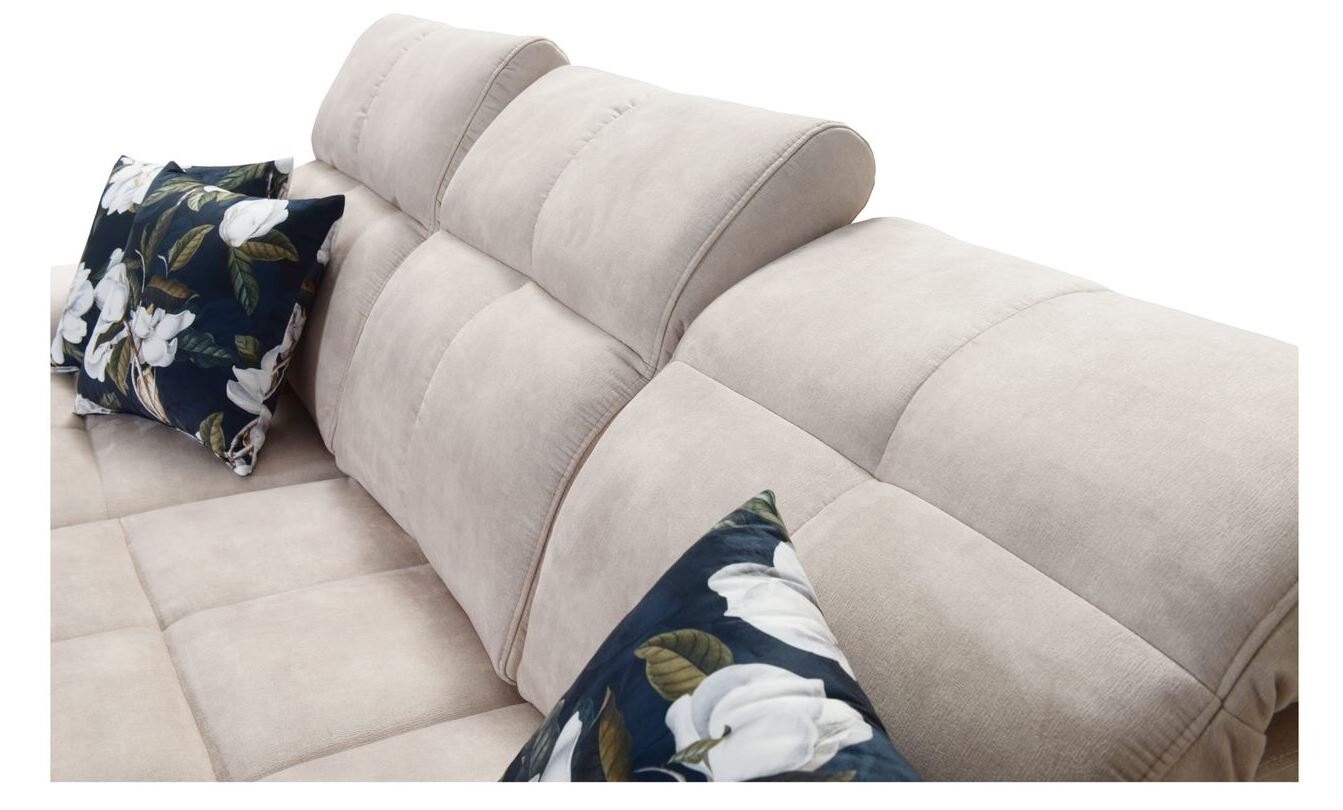 Narożnik Ligier VII 266x212 cm prezentuje się elegancko i nowocześnie. Pikowana powierzchnia siedziska i oparcia dodaje mu charakteru i stylu, a subtelne przeszycia tworzą harmonijną całość. Regulowane zagłówki zapewniają komfort podczas odpoczynku, a wygodne podłokietniki dopełniają estetykę mebla. Nóżki narożnika są dostępne w kilku wariantach – metalowe, chromowane, czarne lub drewniane, co pozwala na dopasowanie do różnych aranżacji wnętrz.