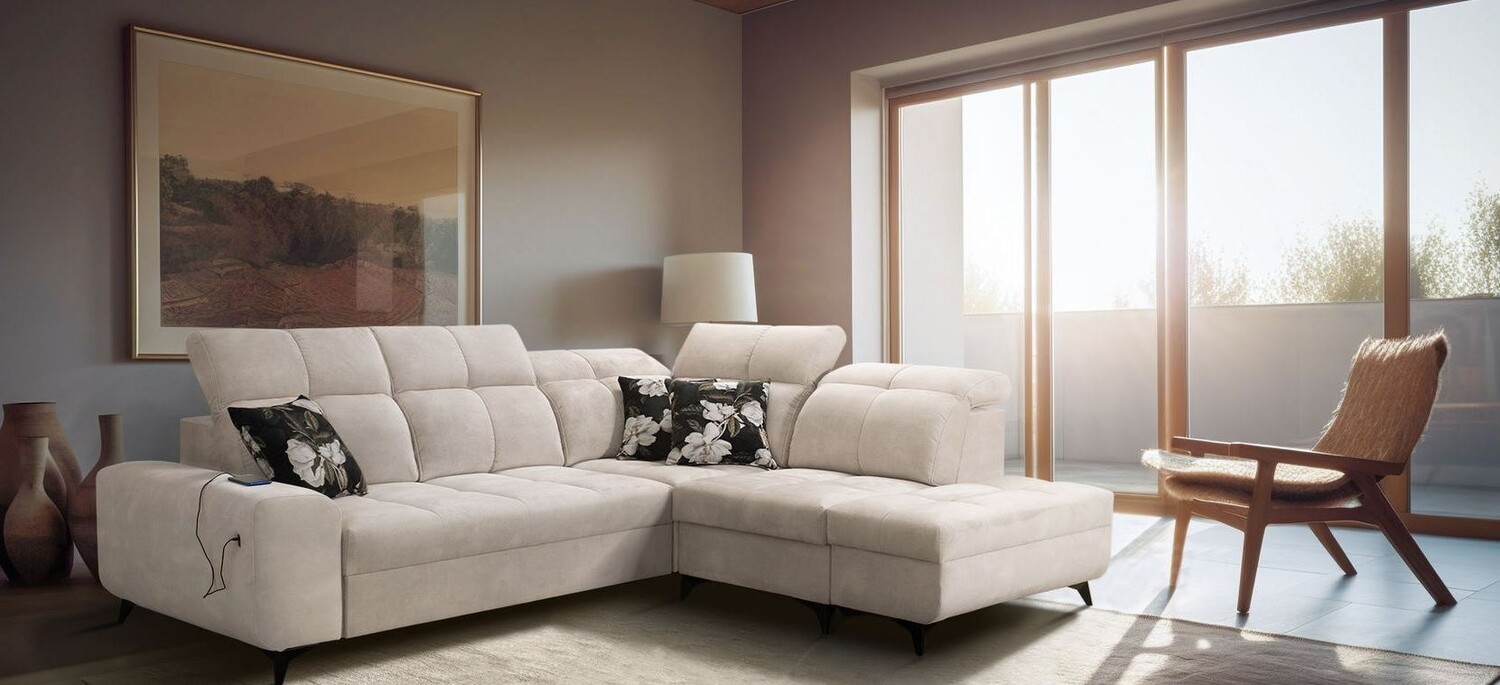 - Narożnik dostępny w wielu kolorach plamoodpornych tkanin o różnych strukturach, m.in welurach i plecionkach