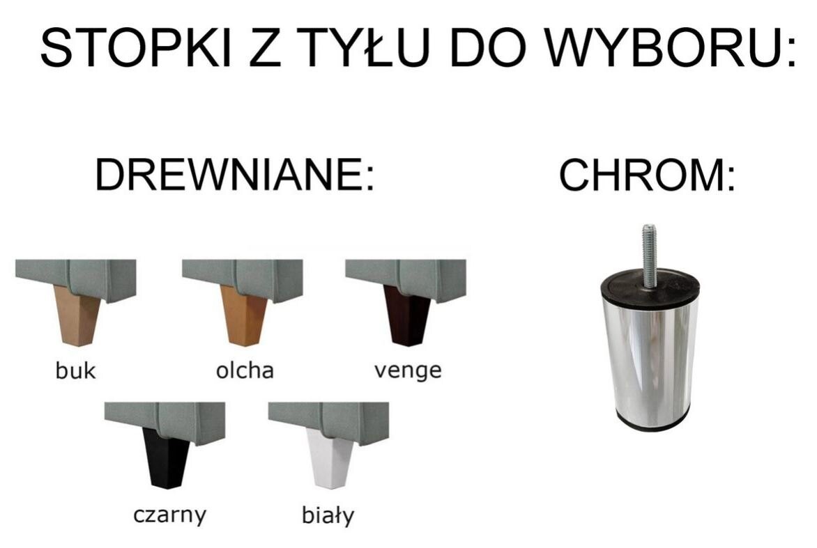 - Nóżki z przodu: metalowe, chromowane lub czarne. Nóżki z tyłu: drewniane lub metalowe (metalowe za dopłatą + 100 zł)