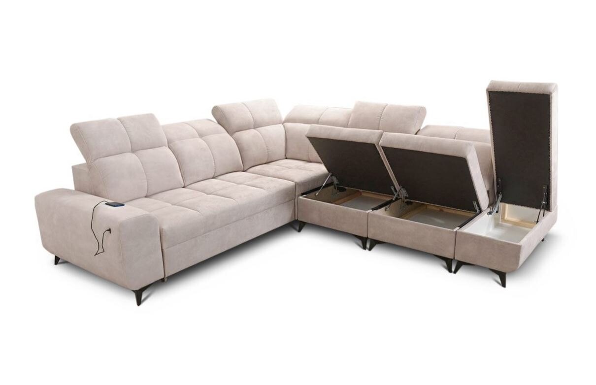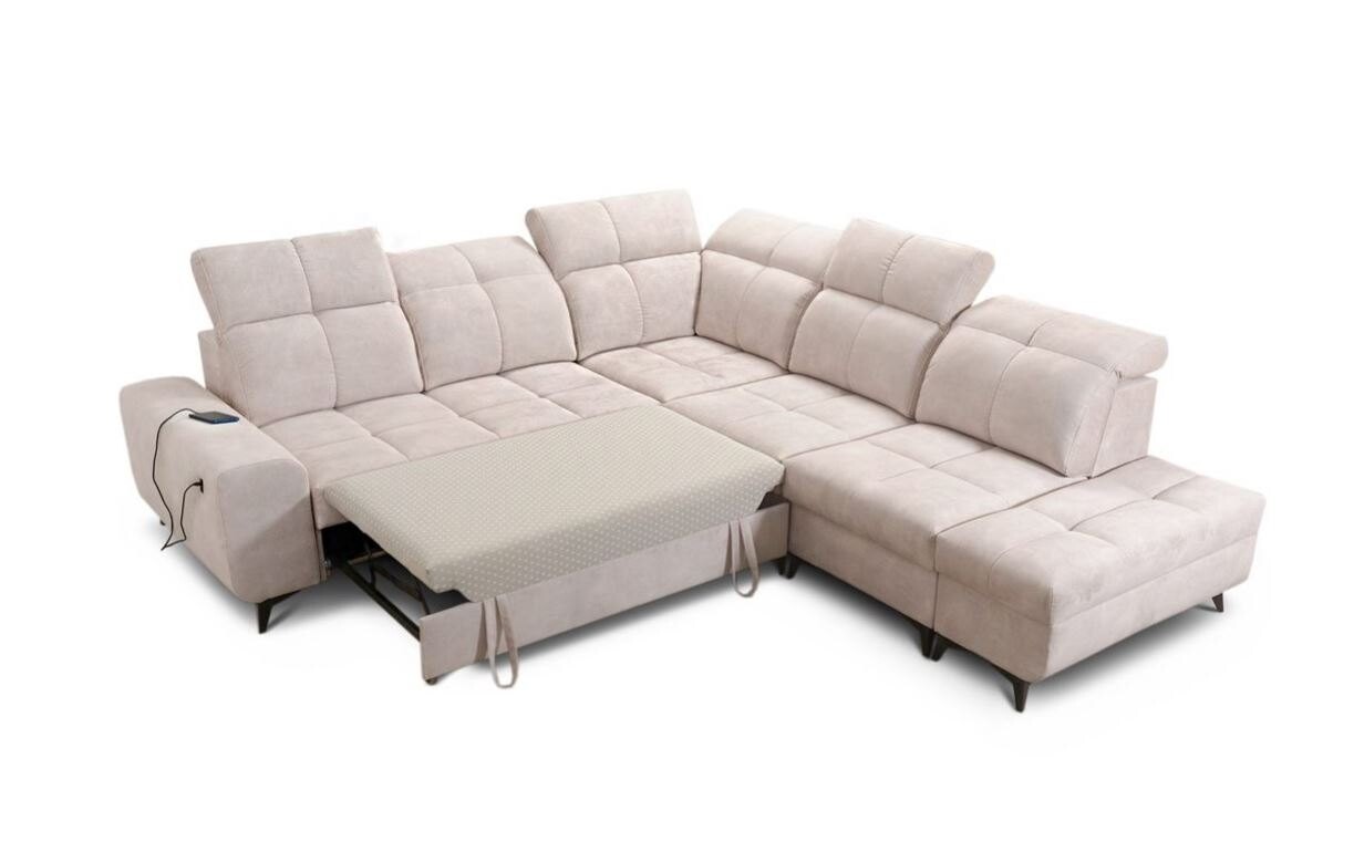 Funkcja spania jest łatwa do rozłożenia, co czyni ten narożnik idealnym rozwiązaniem na noclegi dla gości. Pojemnik na pościel oferuje praktyczne miejsce do przechowywania, pomagając utrzymać porządek w salonie. Siedzisko wykonane jest z sprężyn falistych oraz utwardzonej pianki T30, co zapewnia trwałość i komfort użytkowania. Stelaż z drewna i płyty gwarantuje solidność konstrukcji. Dodatkowo, narożnik wyposażony jest w wejście USB, co umożliwia wygodne ładowanie urządzeń mobilnych.