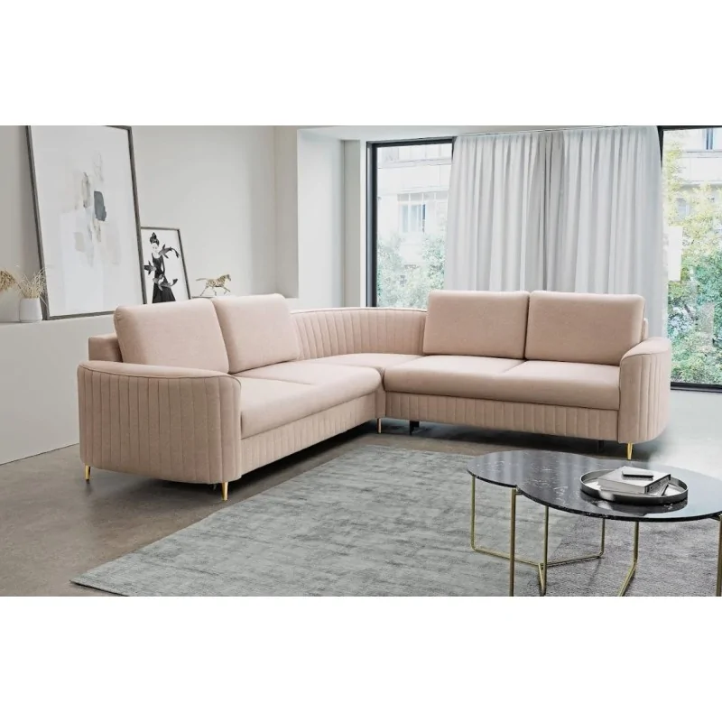 Elegancki narożnik Golden o wymiarach 251x251 cm to doskonałe rozwiązanie dla osób ceniących sobie styl i komfort. Tapicerka w delikatnym, pastelowym odcieniu beżu nadaje wnętrzu lekkości i nowoczesności. Smukłe linie oraz subtelne pikowania na bokach i oparciach dodają meblowi elegancji i klasy. Złote nóżki podkreślają luksusowy charakter narożnika, jednocześnie zapewniając stabilność i trwałość konstrukcji.