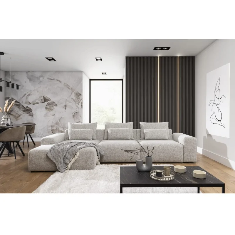 Najważniejsze cechy narożnika Rodos S to modułowa konstrukcja, umożliwiająca elastyczne dopasowanie do różnych przestrzeni i potrzeb użytkowników. Narożnik jest wykonany z wysokiej jakości materiałów, takich jak sprężyny faliste, pianka T30, oraz pasy tapicerskie, które zapewniają średnio miękkie siedzisko. Poduszki oparciowe wypełnione granulatem silikonowym dodają komfortu, a nóżki plastikowe w czarnym kolorze o wysokości 2,5 cm nadają narożnikowi nowoczesny wygląd. Mebel nie posiada funkcji spania ani pojemnika, co podkreśla jego minimalistyczny design.