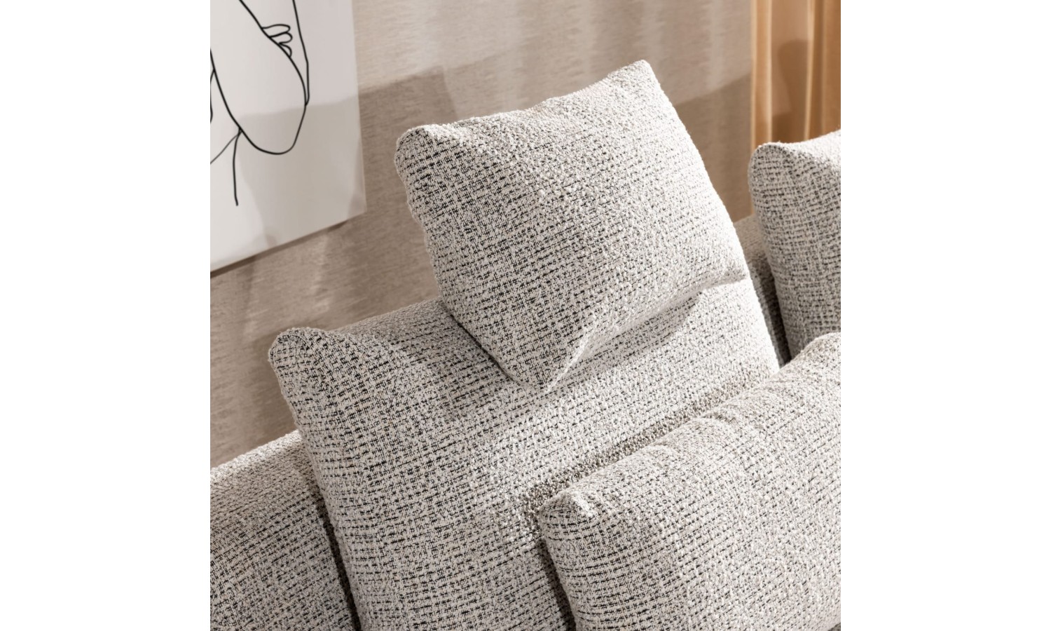 Najważniejsze cechy narożnika Rodos L to modułowa konstrukcja, która umożliwia tworzenie różnych konfiguracji. Narożnik nie posiada funkcji spania ani pojemnika, co podkreśla jego minimalistyczny design. Siedzisko średnio miękkie jest wypełnione pianką T30, pasami tapicerskimi oraz sprężynami falistymi, co zapewnia wygodę i trwałość. Poduszki oparciowe są wypełnione granulatem silikonowym, co dodatkowo zwiększa komfort użytkowania. Nóżki plastikowe w kolorze czarnym o wysokości 2,5 cm nadają narożnikowi nowoczesny wygląd.