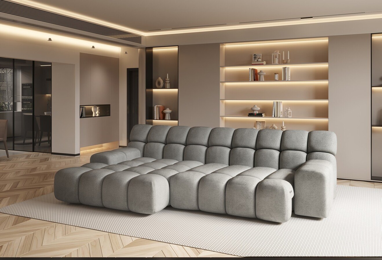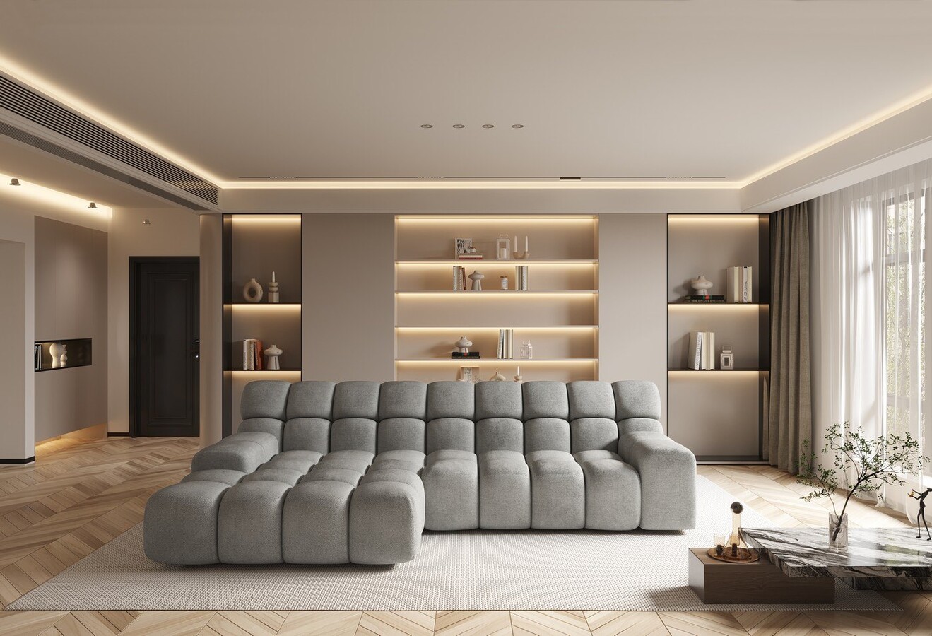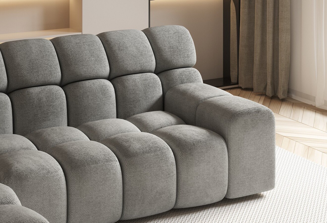 Narożnik Sempre 297 x 180 cm to wyjątkowy mebel, który wprowadza nowoczesny i elegancki akcent do każdego wnętrza. Jego szara tapicerka i modularna konstrukcja sprawiają, że narożnik doskonale komponuje się z różnymi stylami aranżacyjnymi. Mebel charakteryzuje się miękkimi, zaokrąglonymi kształtami, co podkreśla jego przytulny charakter. Wyjątkowy komfort użytkowania zapewniają duże, pikowane poduszki siedziska i oparcia.