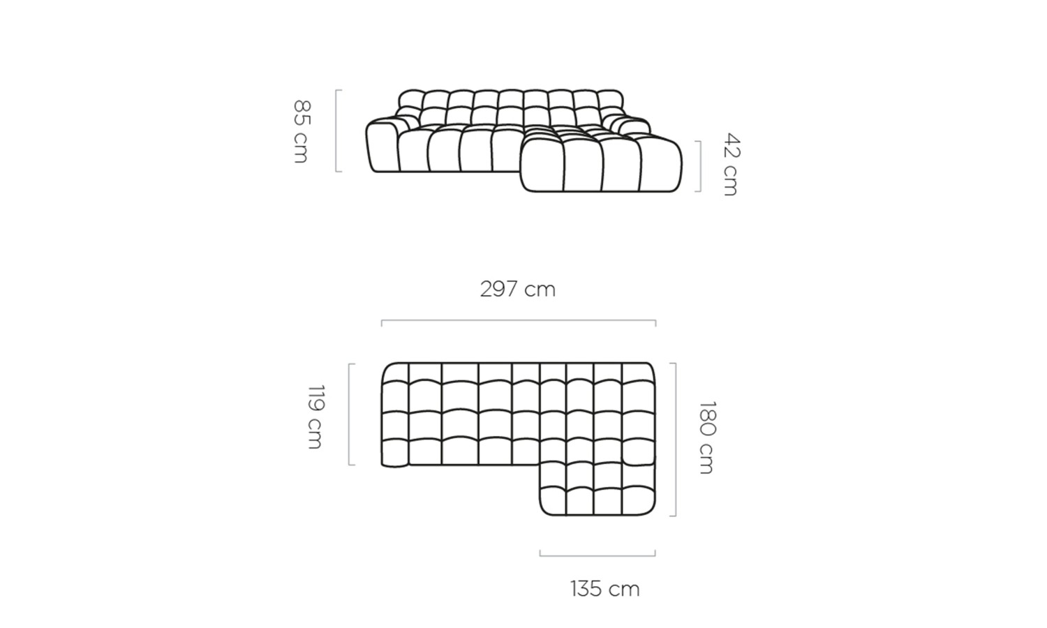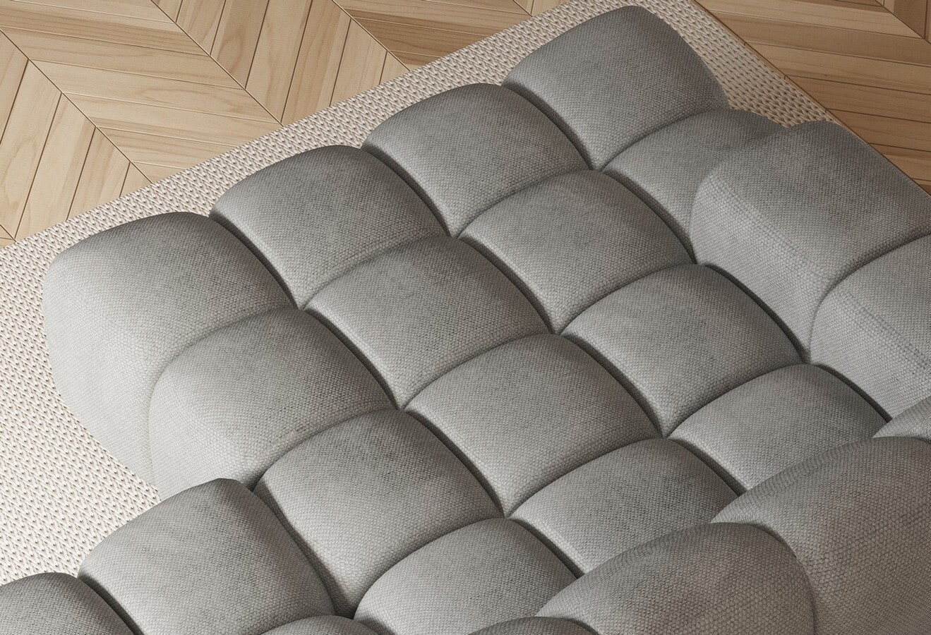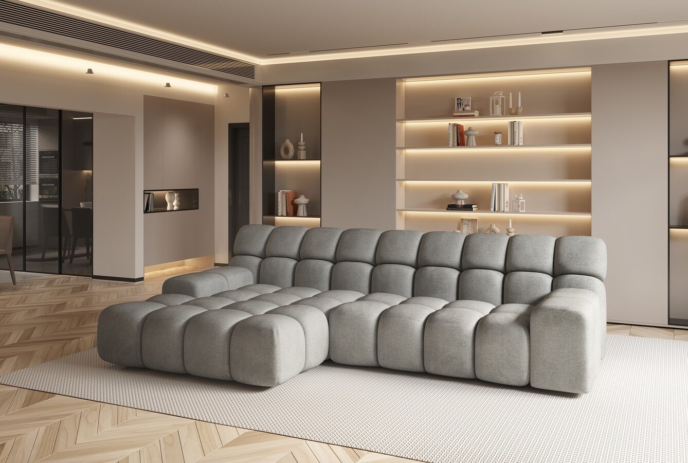 Narożnik Sempre 297 x 180 cm to wyjątkowy mebel, który wprowadza nowoczesny i elegancki akcent do każdego wnętrza. Jego szara tapicerka i modularna konstrukcja sprawiają, że narożnik doskonale komponuje się z różnymi stylami aranżacyjnymi. Mebel charakteryzuje się miękkimi, zaokrąglonymi kształtami, co podkreśla jego przytulny charakter. Wyjątkowy komfort użytkowania zapewniają duże, pikowane poduszki siedziska i oparcia.