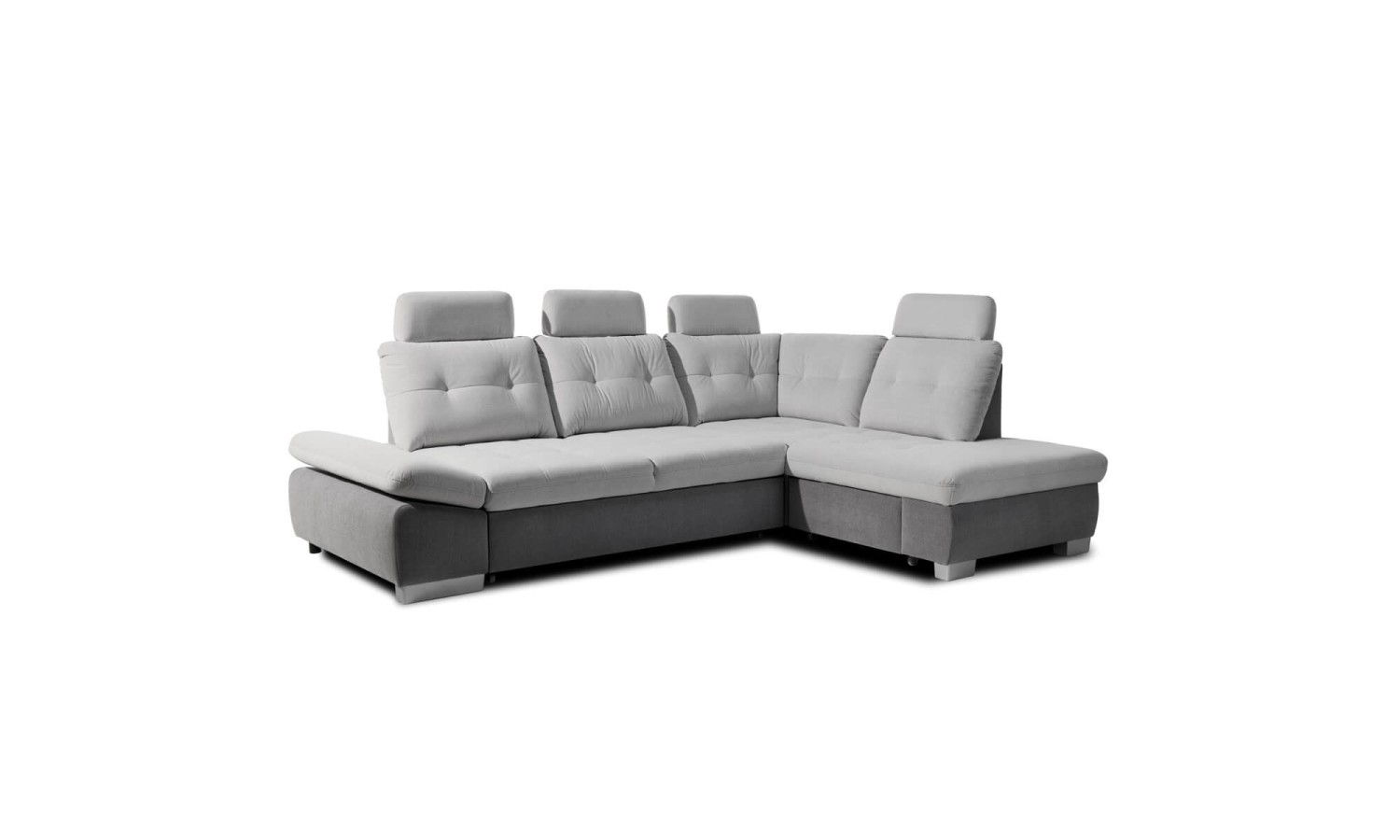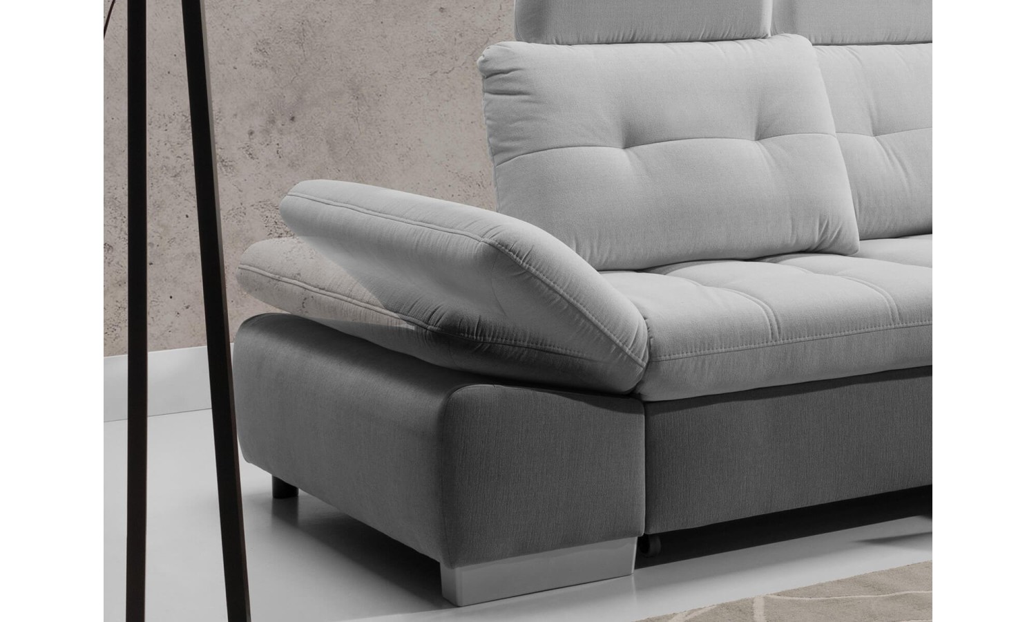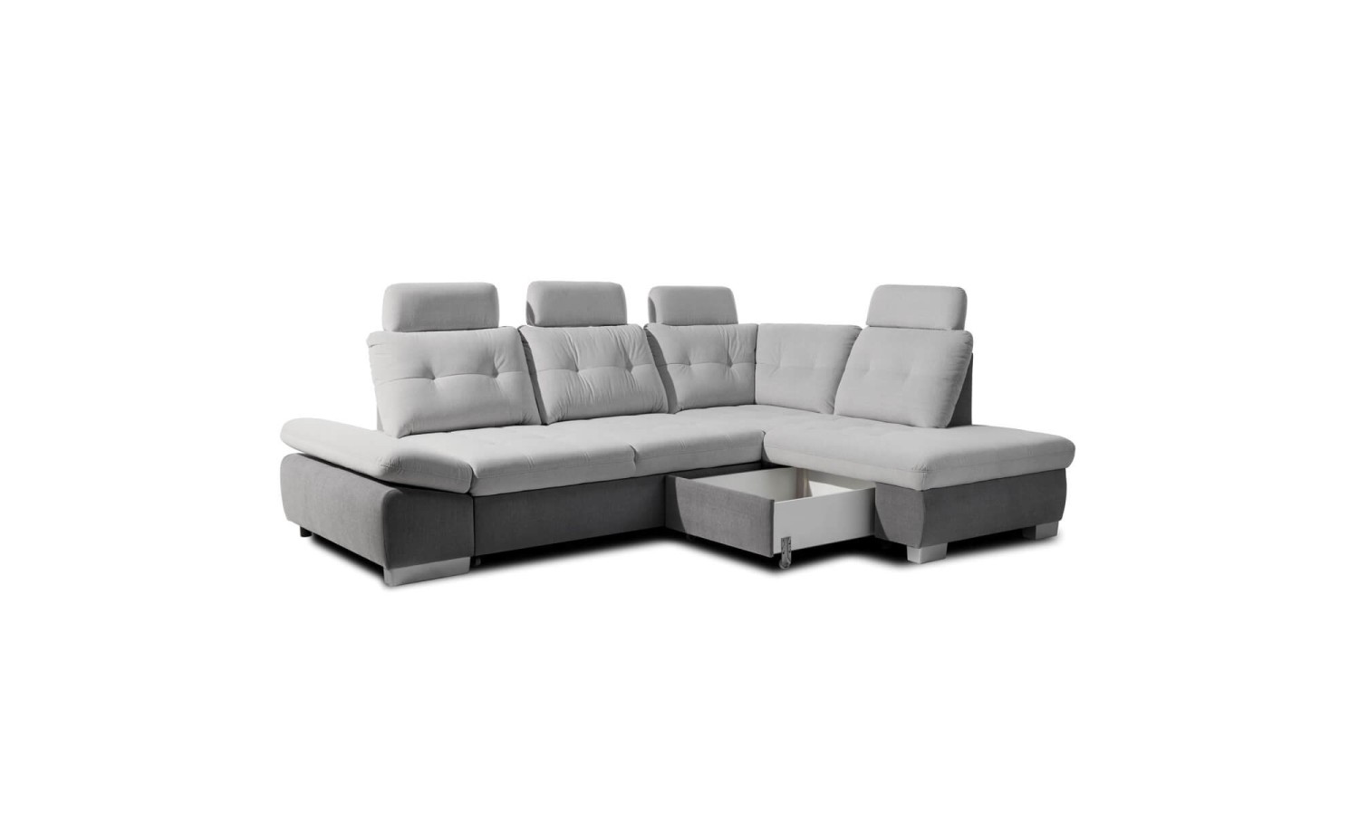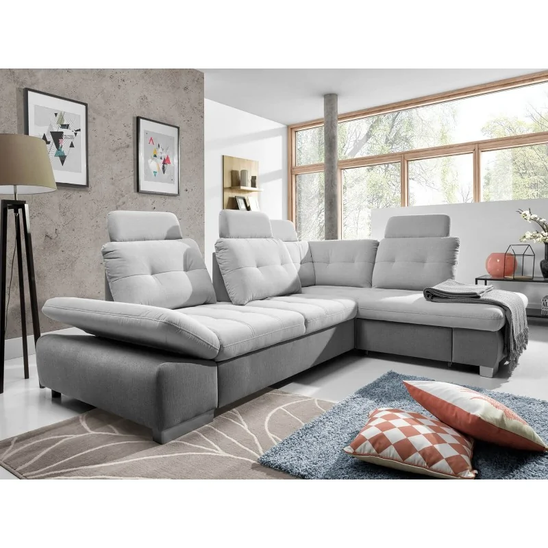 Narożnik Festina o wymiarach 275x205 cm prezentuje się wyjątkowo stylowo i funkcjonalnie. Tapicerka w jasnoszarym odcieniu dodaje wnętrzu nowoczesnego charakteru. Konstrukcja narożnika jest solidna, a srebrne nóżki dodają mu lekkości i elegancji. Regulowane oparcia i podłokietniki zapewniają wygodę i komfort użytkowania, dostosowując się do potrzeb użytkownika. Wysuwana funkcja spania oraz pojemnik na pościel czynią go praktycznym rozwiązaniem dla każdego domu.