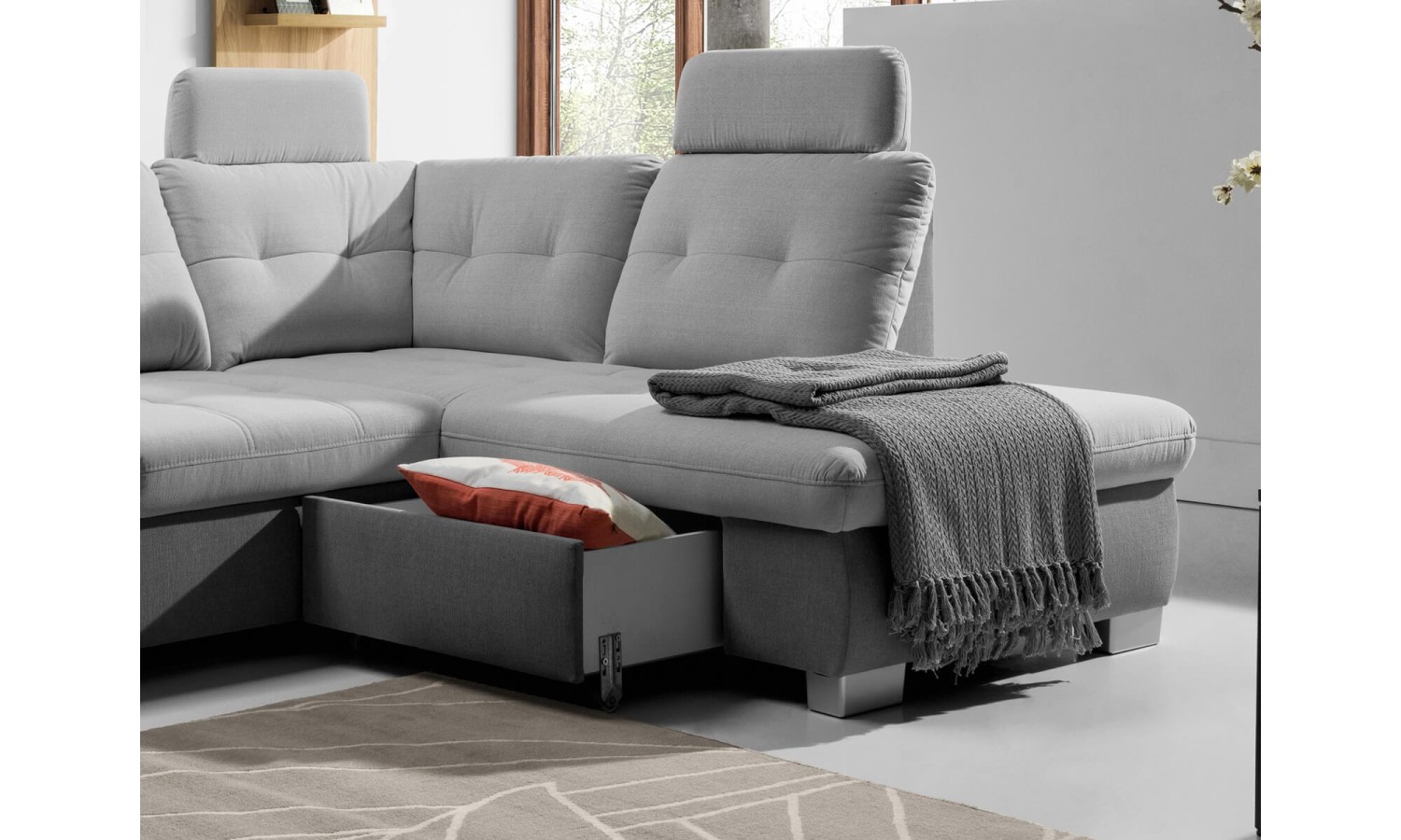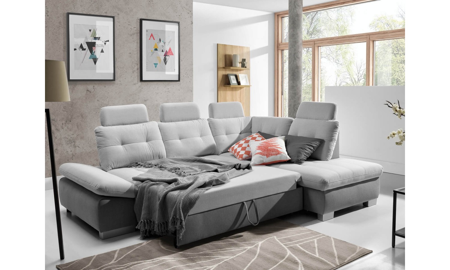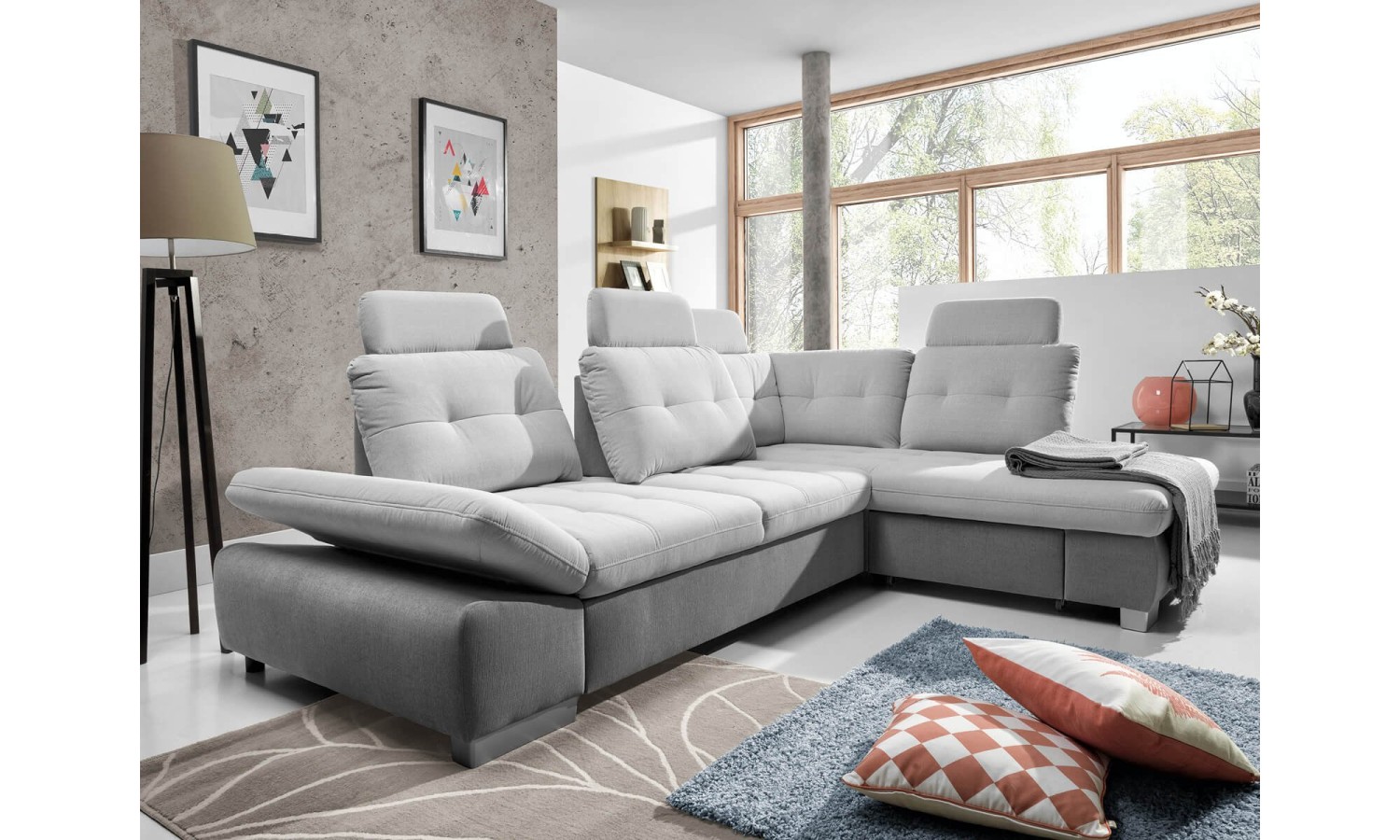 Narożnik Festina o wymiarach 275x205 cm prezentuje się wyjątkowo stylowo i funkcjonalnie. Tapicerka w jasnoszarym odcieniu dodaje wnętrzu nowoczesnego charakteru. Konstrukcja narożnika jest solidna, a srebrne nóżki dodają mu lekkości i elegancji. Regulowane oparcia i podłokietniki zapewniają wygodę i komfort użytkowania, dostosowując się do potrzeb użytkownika. Wysuwana funkcja spania oraz pojemnik na pościel czynią go praktycznym rozwiązaniem dla każdego domu.