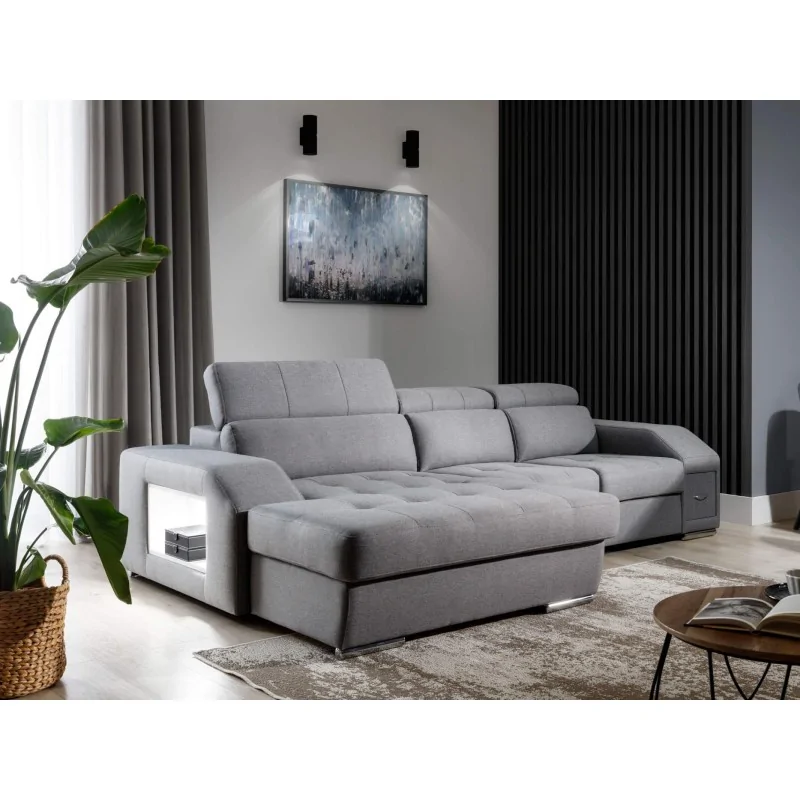 Narożnik Lordi jest nie tylko estetyczny, ale i niezwykle praktyczny. Wyposażony w pojemnik na pościel oraz podświetlaną półkę i pojemnik w boczku, oferuje dużo miejsca do przechowywania, co sprawia, że jest idealnym rozwiązaniem do mniejszych przestrzeni. Wymiary 275x173 cm oraz wysokość siedziska 43 cm zapewniają komfort użytkowania, a powierzchnia spania 210x122 cm pozwala na wygodne przespanie nocy.