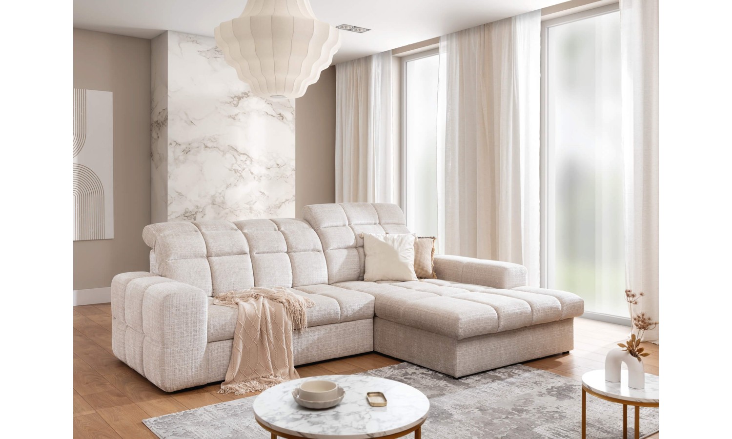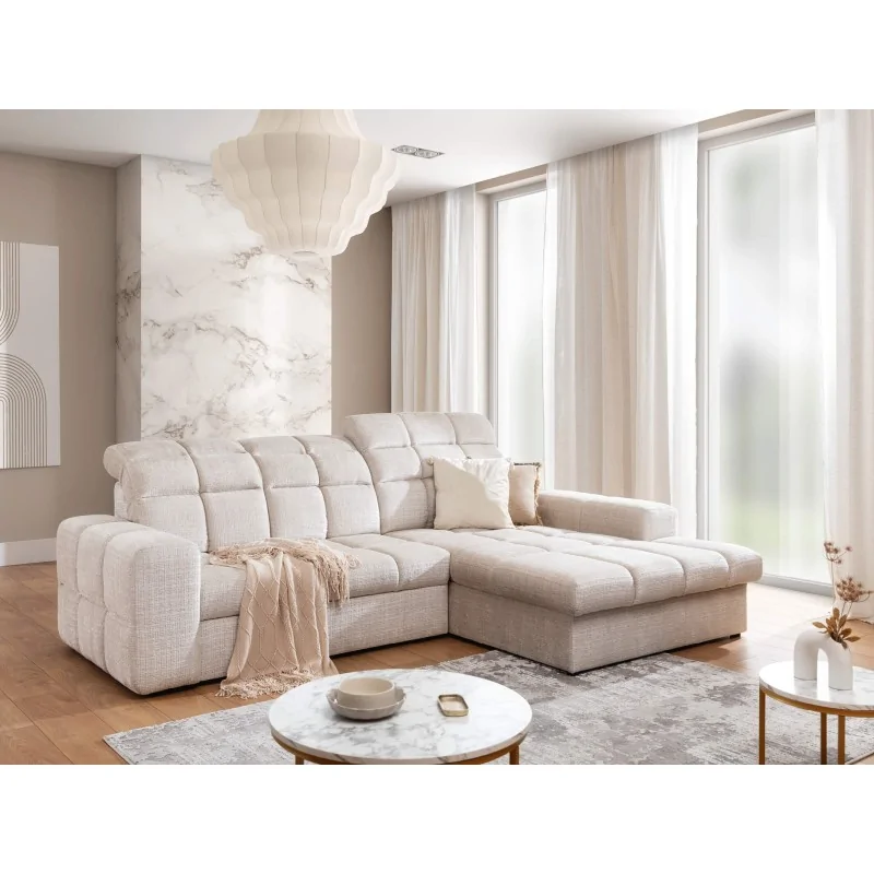 Najważniejszym atutem narożnika Lambo jest jego wysuwana funkcja spania oraz pojemnik na pościel, co sprawia, że jest on idealnym rozwiązaniem dla osób ceniących praktyczność. Regulowane zagłówki pozwalają na dostosowanie wysokości oparcia do indywidualnych potrzeb, zapewniając maksymalny komfort. Wypełnienie narożnika składa się ze sprężyn falistych i pianki PU, co gwarantuje trwałość oraz wygodę siedzenia i spania.