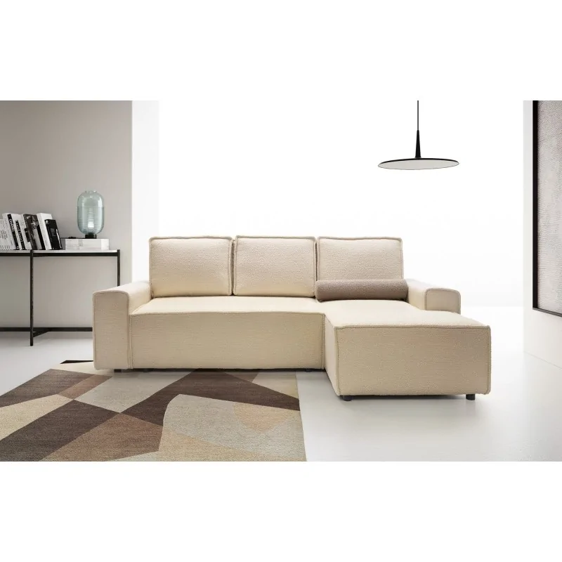 Narożnik Mazuri o wymiarach 255x170 cm to elegancki i funkcjonalny mebel, który doskonale wpisuje się w nowoczesne wnętrza. Jasnobeżowa tapicerka nadaje mu lekkości i elegancji, a proste linie i minimalistyczny design sprawiają, że pasuje do różnych stylów aranżacji. Szerokie podłokietniki i głębokie siedzisko zapewniają wysoki komfort użytkowania, idealny zarówno do wypoczynku, jak i codziennego relaksu.
