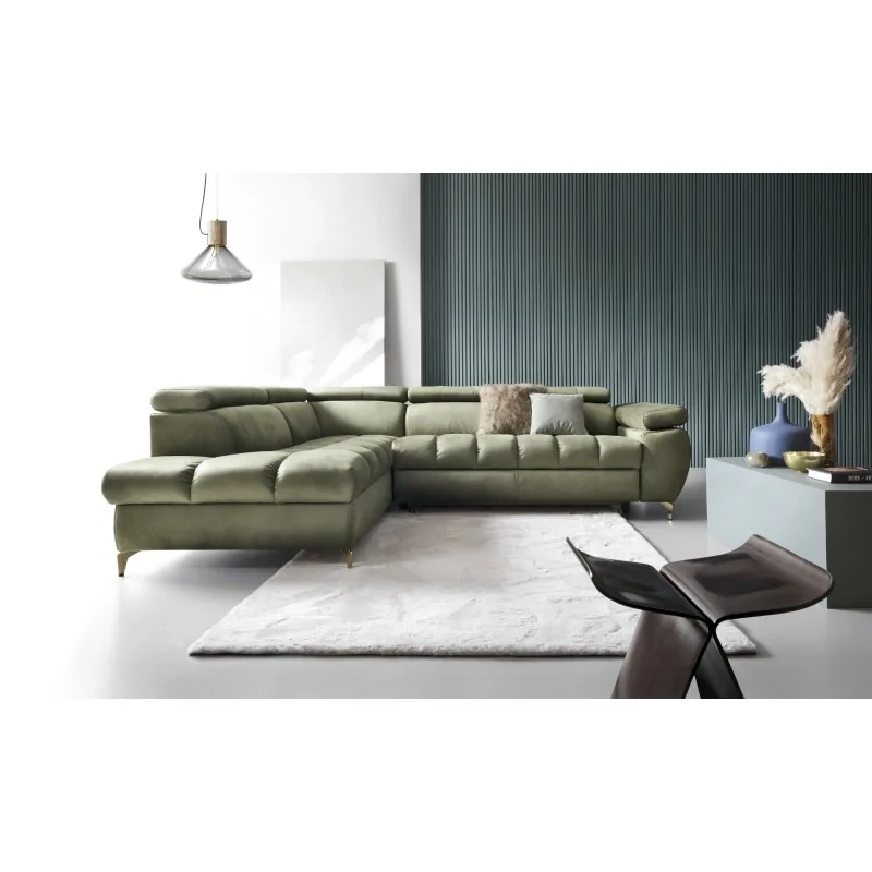 Narożnik Lardi 2 to elegancki i funkcjonalny mebel, który wnosi do wnętrza zarówno styl, jak i wygodę. Jego zielona tapicerka, wykonana z wysokiej jakości materiałów, idealnie komponuje się z różnymi stylami wnętrzarskimi, od nowoczesnych po klasyczne. Przeszycia na siedzisku i oparciach dodają mu wyrafinowanego charakteru, podkreślając dbałość o detale i solidne wykonanie. Smukłe, złote nóżki nadają konstrukcji lekkości, a zarazem stabilności, tworząc harmonijną całość.
