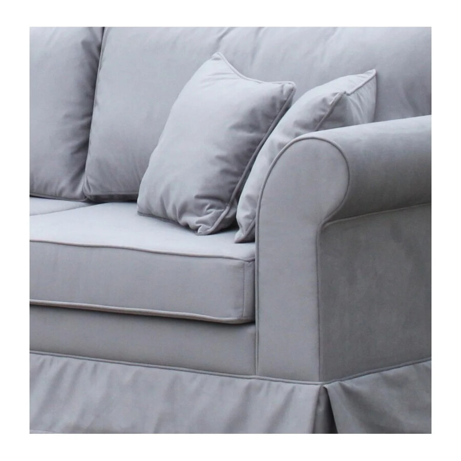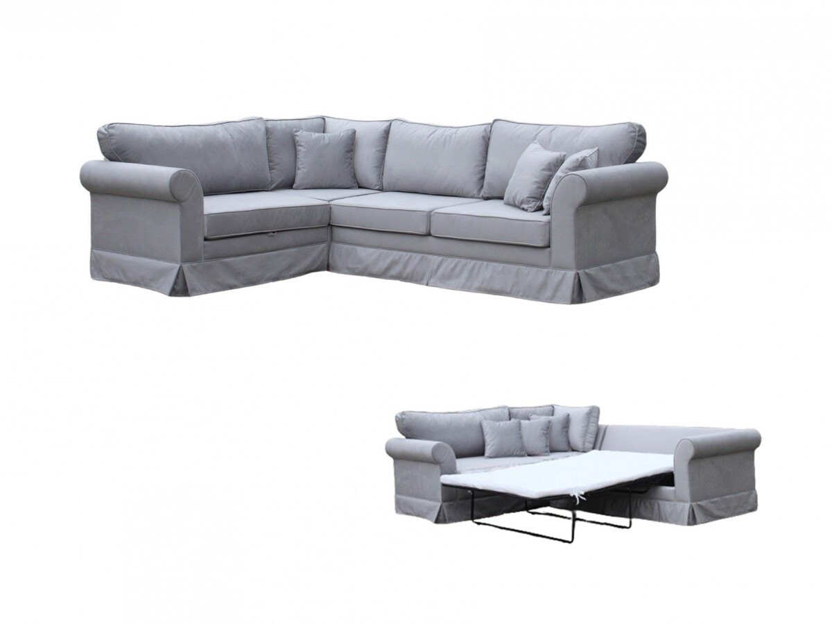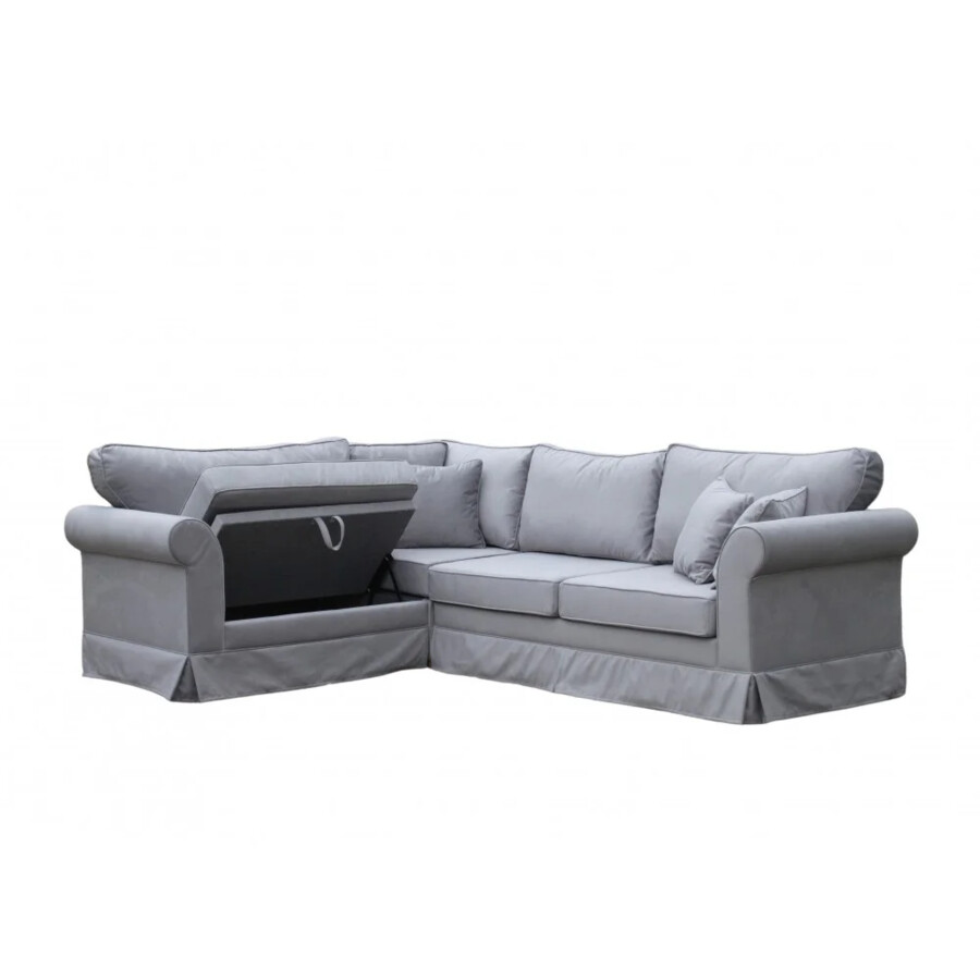 Narożnik Antonio to wyjątkowy mebel o klasycznym wyglądzie, który łączy funkcjonalność z ponadczasowym designem. Jego prosta forma i subtelne linie sprawiają, że świetnie wpasowuje się zarówno w eleganckie, jak i nowoczesne wnętrza. Zastosowanie zdejmowanego pokrowca nadaje mu praktycznego charakteru, umożliwiając łatwe utrzymanie mebla w czystości. Tapicerka w stonowanym, szarym kolorze idealnie komponuje się z szerokimi, zaokrąglonymi podłokietnikami, które dodają mu klasycznego wyglądu. Obszycia wykończone w formie falbany u dołu narożnika podkreślają jego wyjątkową estetykę. Dzięki funkcji spania oraz pojemnikowi na pościel, Antonio stanowi idealne rozwiązanie do salonów pełniących funkcję pokoju gościnnego.