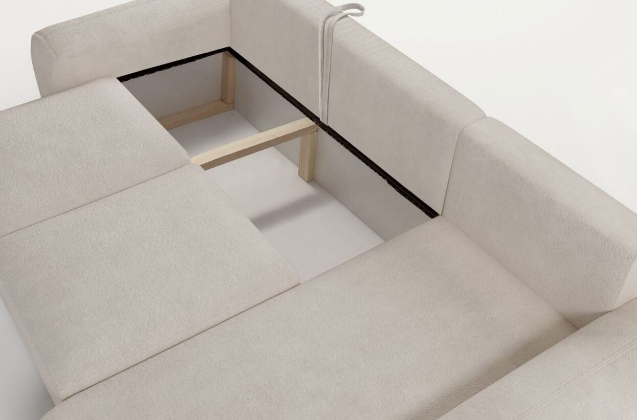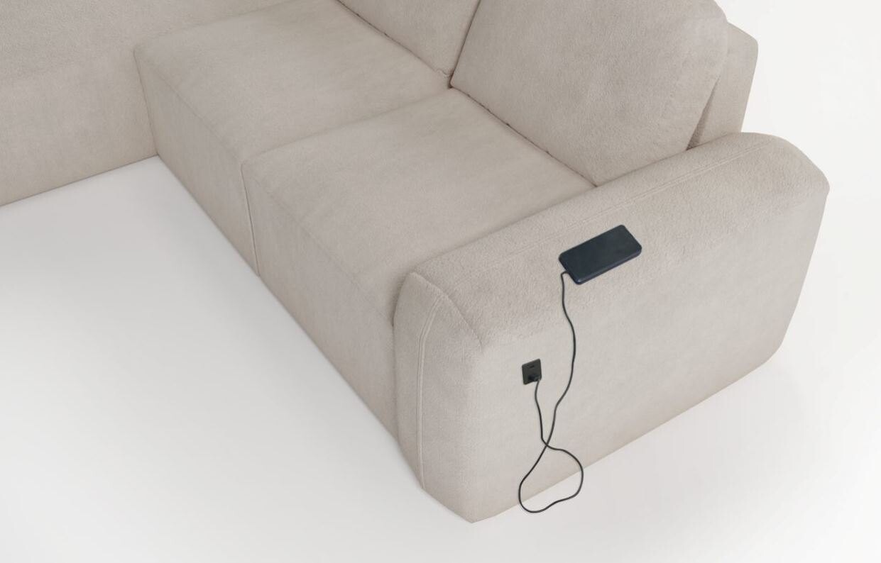Wyposażony w funkcję spania, narożnik szybko zmienia się w wygodne łóżko dla gości lub codziennego użytku. Dodatkowo, pojemnik na pościel ułatwia przechowywanie, pomagając w utrzymaniu porządku. Stelaż z drewna i płyty zapewnia stabilność oraz trwałość, a sprężyny faliste na siedzisku gwarantują odpowiednie podparcie i wygodę. Dla miłośników technologii, dostępne jest wejście USB, które umożliwia ładowanie urządzeń bezpośrednio z mebla.