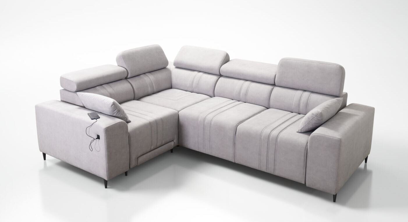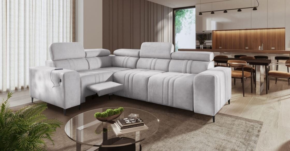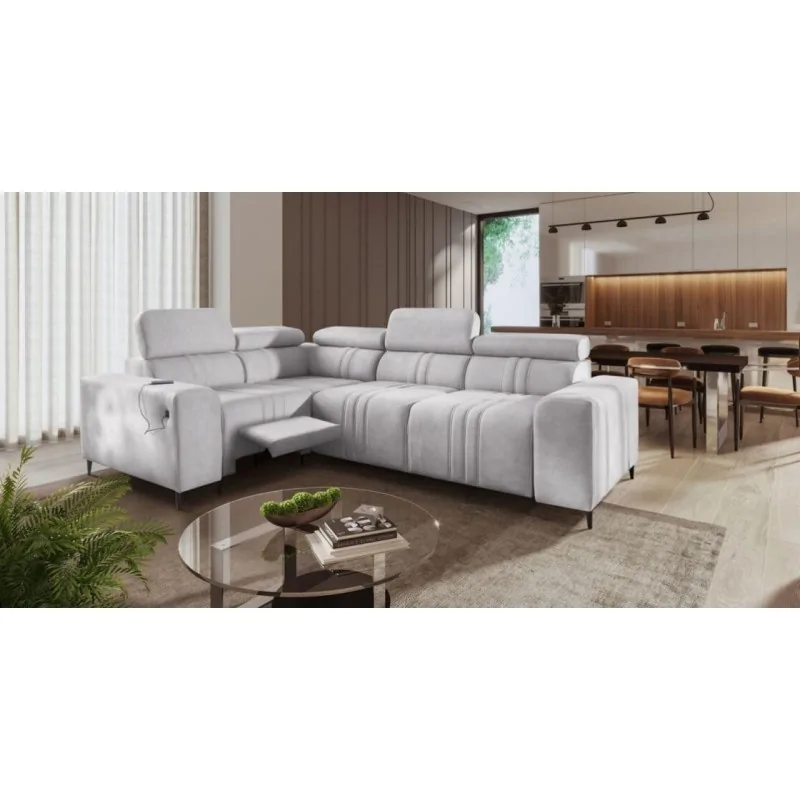 Narożnik Ditro MIX II to nowoczesny mebel o przemyślanym designie, który łączy funkcjonalność z wyjątkową estetyką. Subtelne przeszycia na tkaninie obiciowej oraz regulowane zagłówki nadają mu eleganckiego wyglądu i zapewniają wysoki poziom komfortu podczas codziennego użytkowania. Narożnik dostępny jest w szerokiej gamie plamoodpornych tkanin, takich jak miękki welur czy odporne plecionki, co czyni go praktycznym wyborem dla różnych aranżacji wnętrz.