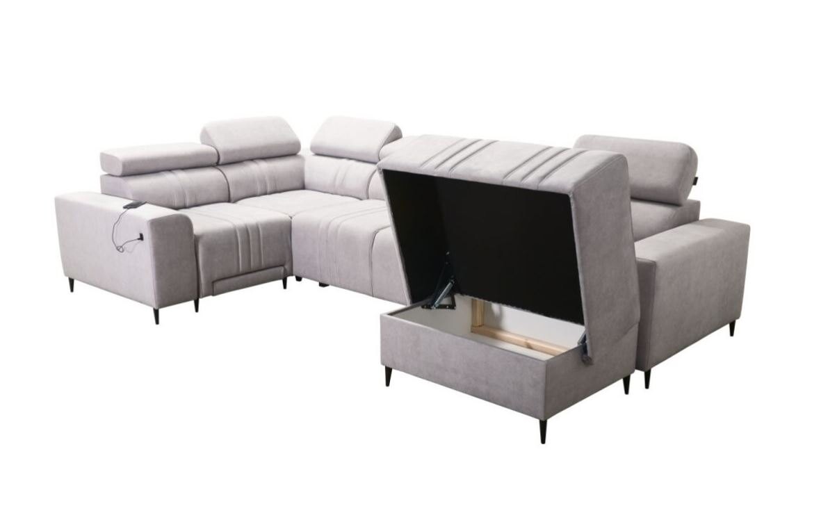 Narożnik wyposażony jest w funkcję spania typu puma, co czyni go idealnym rozwiązaniem zarówno do codziennego użytkowania, jak i podczas przyjmowania gości. Manualny wysuwany podnóżek zwiększa komfort odpoczynku, a pojemnik na pościel zapewnia dodatkowe miejsce do przechowywania. W zestawie znajdują się dwie formatki, które eliminują przerwy w powierzchni spania, zapewniając wygodny i równy sen. Możliwość personalizacji nóżek – czarnych, złotych, drewnianych lub chromowanych – pozwala dopasować narożnik do preferowanego stylu wnętrza.