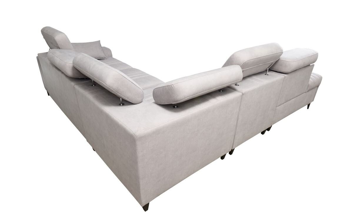 Wyposażony w funkcję spania typu puma, narożnik Ditro IX MIX oferuje komfortowy sen i praktyczność w codziennym użytkowaniu. Manualny wysuwany podnóżek zwiększa wygodę podczas odpoczynku, a pojemnik na pościel zapewnia dodatkową przestrzeń do przechowywania. Dwie formatki w zestawie służą do wyrównania powierzchni spania, co pozwala na pełną wygodę w nocy. Możliwość wyboru nóżek – czarnych, złotych, drewnianych lub chromowanych – daje pełną swobodę personalizacji, dopasowując narożnik do aranżacji wnętrza.