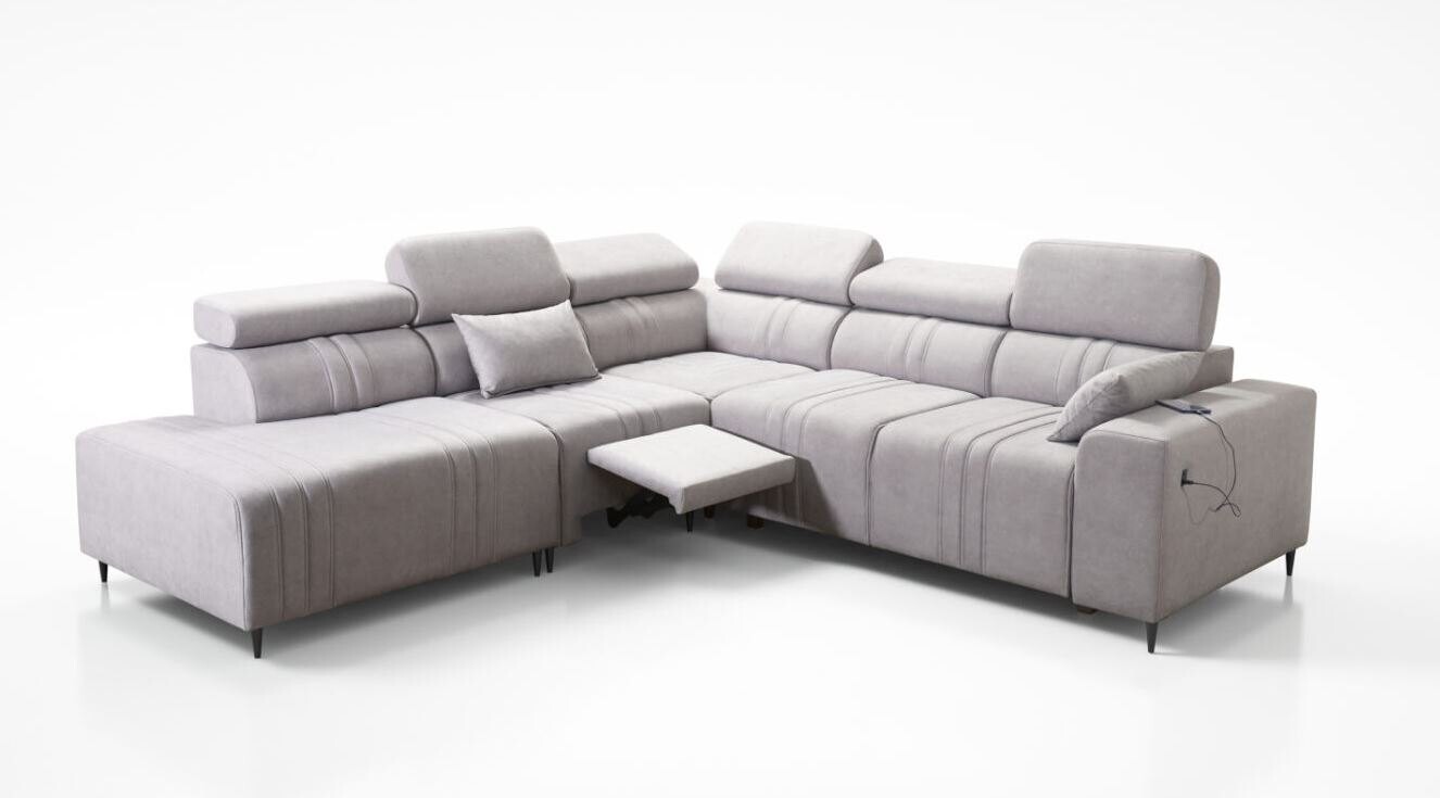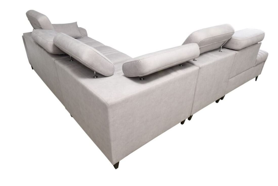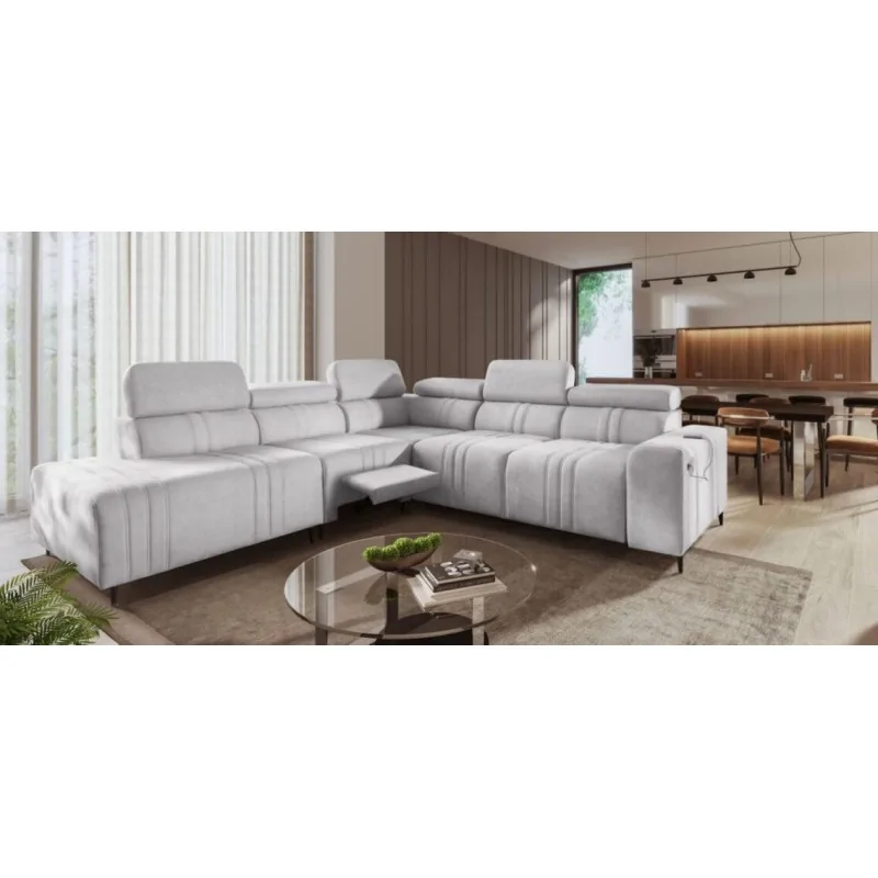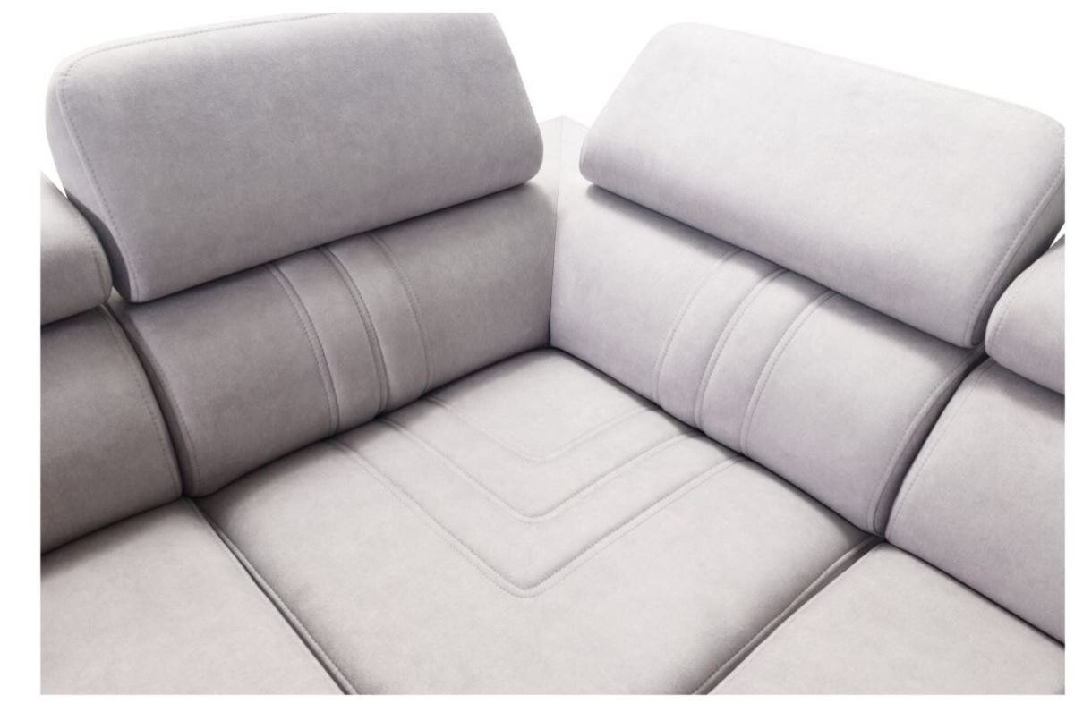 Narożnik Ditro IX MIX to funkcjonalny i przestronny model, który doskonale łączy nowoczesny design z wygodą użytkowania. Wyrafinowane przeszycia na tapicerce i regulowane zagłówki podkreślają elegancję narożnika, zapewniając jednocześnie doskonałe wsparcie podczas relaksu. Plamoodporne tkaniny, dostępne w szerokiej gamie kolorów i struktur, takich jak welur czy plecionka, gwarantują łatwą pielęgnację i estetykę na lata.