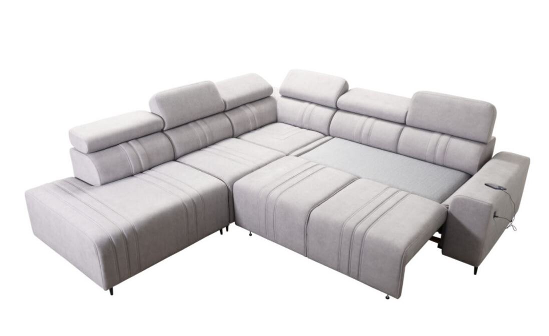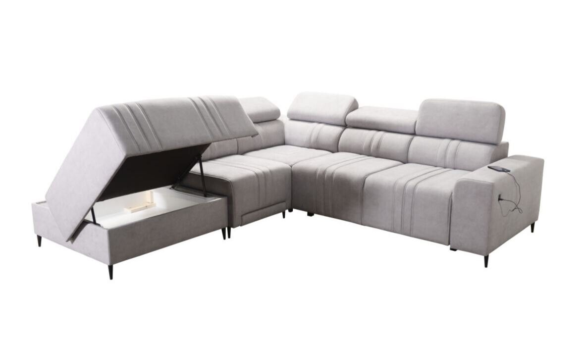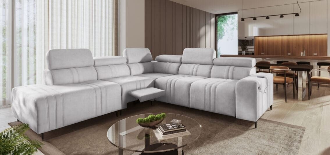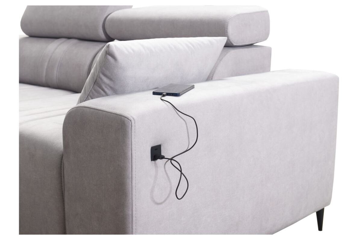 Narożnik Ditro IX MIX to funkcjonalny i przestronny model, który doskonale łączy nowoczesny design z wygodą użytkowania. Wyrafinowane przeszycia na tapicerce i regulowane zagłówki podkreślają elegancję narożnika, zapewniając jednocześnie doskonałe wsparcie podczas relaksu. Plamoodporne tkaniny, dostępne w szerokiej gamie kolorów i struktur, takich jak welur czy plecionka, gwarantują łatwą pielęgnację i estetykę na lata.