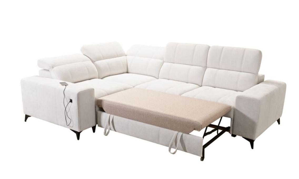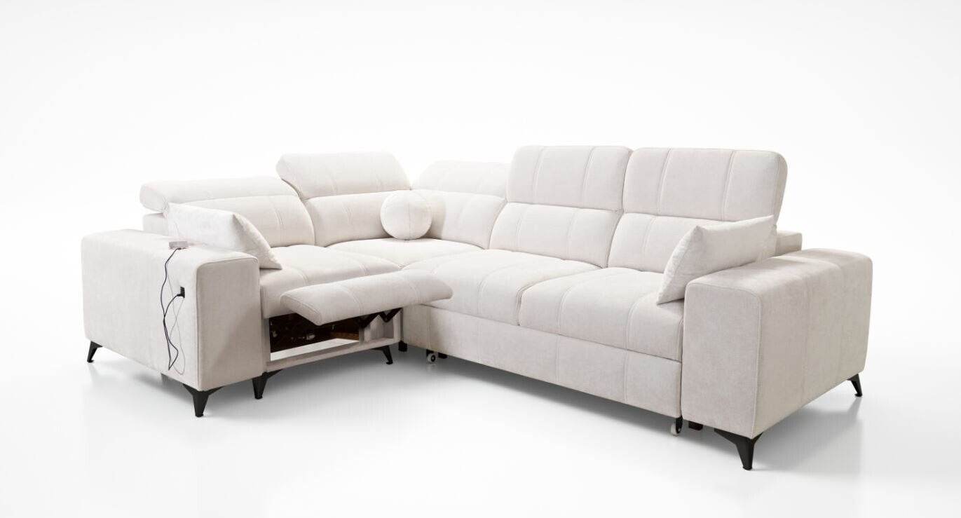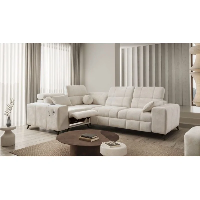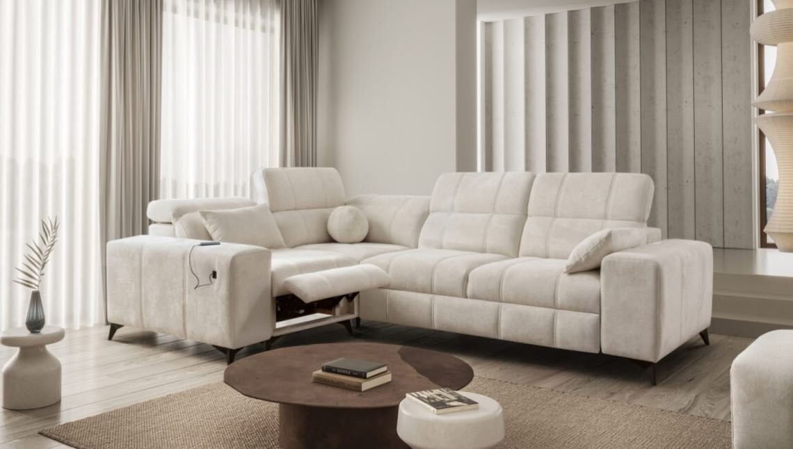 Wyposażony w funkcję relaksu, narożnik oferuje wyjątkowy komfort dzięki systemowi sterowania podnóżkiem za pomocą przycisków. Siedzisko wykonane na bazie sprężyn falistych i pianki T30 zapewnia idealne podparcie dla kręgosłupa. Dzięki funkcji spania typu delfin, mebel w łatwy sposób przekształca się w wygodne łóżko. Stelaż z drewna i płyty gwarantuje trwałość, a opcjonalne doposażenie w piankę HR 35 lub materac wyrównujący sprawia, że można dopasować narożnik do indywidualnych potrzeb.