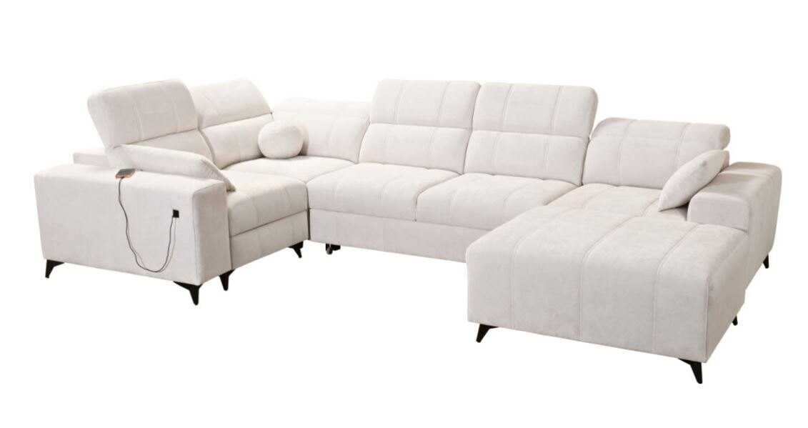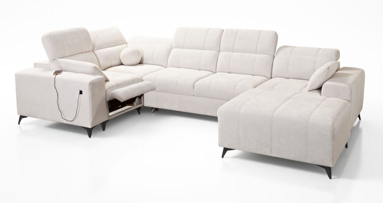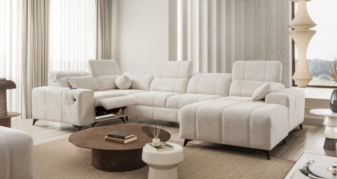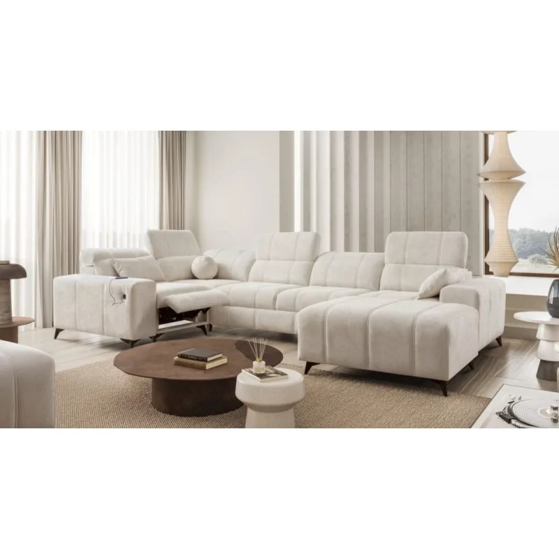 Narożnik Kombo IV MIX 345x205 cm wyróżnia się eleganckim designem i imponującymi rozmiarami, które doskonale wpasują się w przestronny salon. Jego precyzyjnie wykonane pikowania nadają mu stylowego charakteru, a miękka, wysokiej jakości tapicerka gwarantuje wyjątkowy komfort. Regulowane zagłówki oraz elektrycznie wysuwany podnóżek to innowacyjne rozwiązania, które podnoszą komfort codziennego użytkowania, dostosowując narożnik do indywidualnych potrzeb.