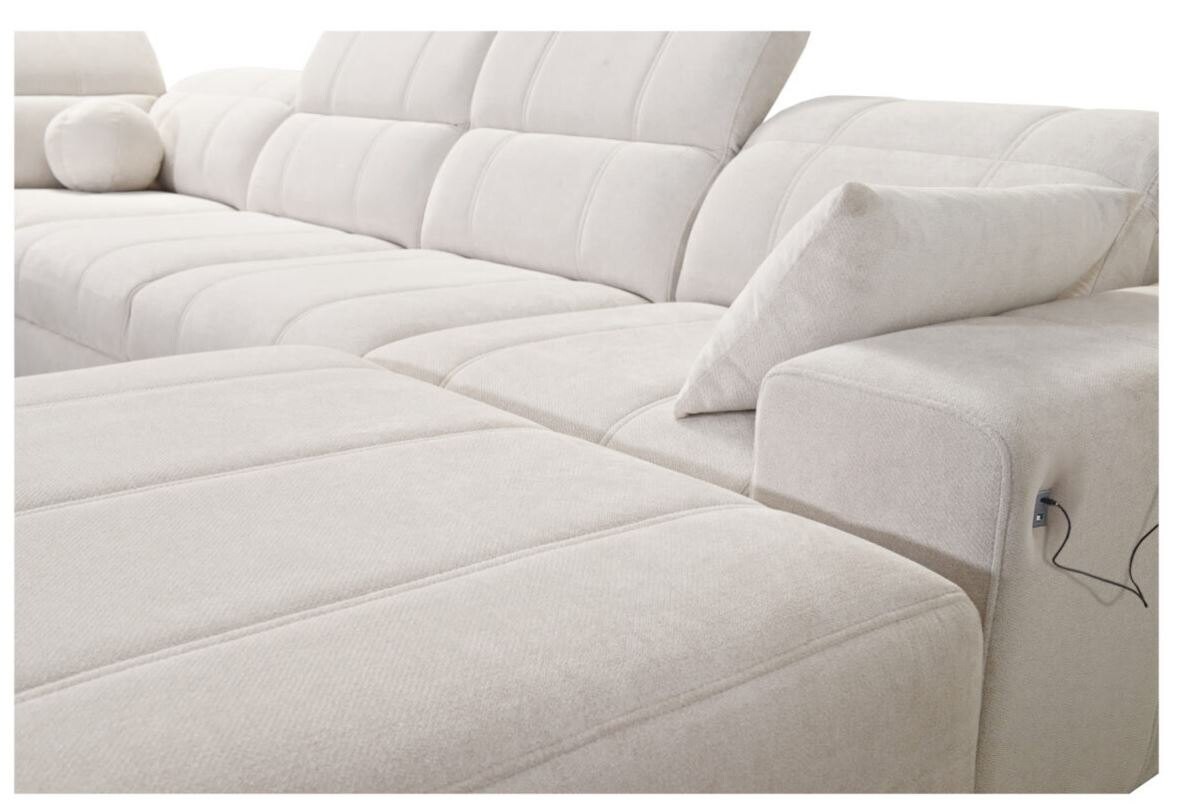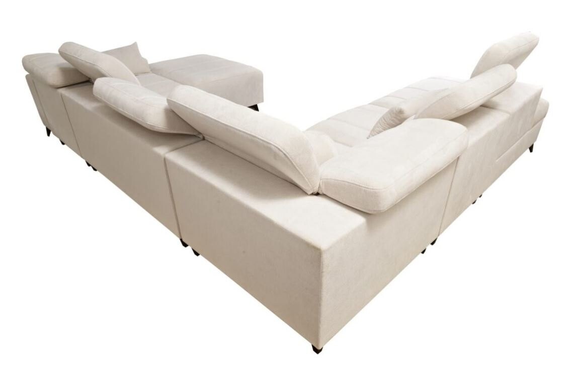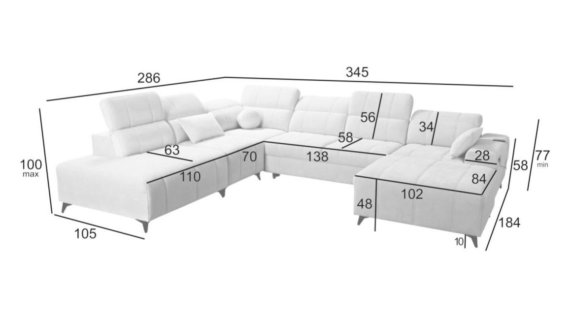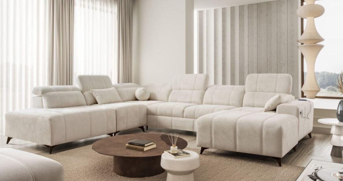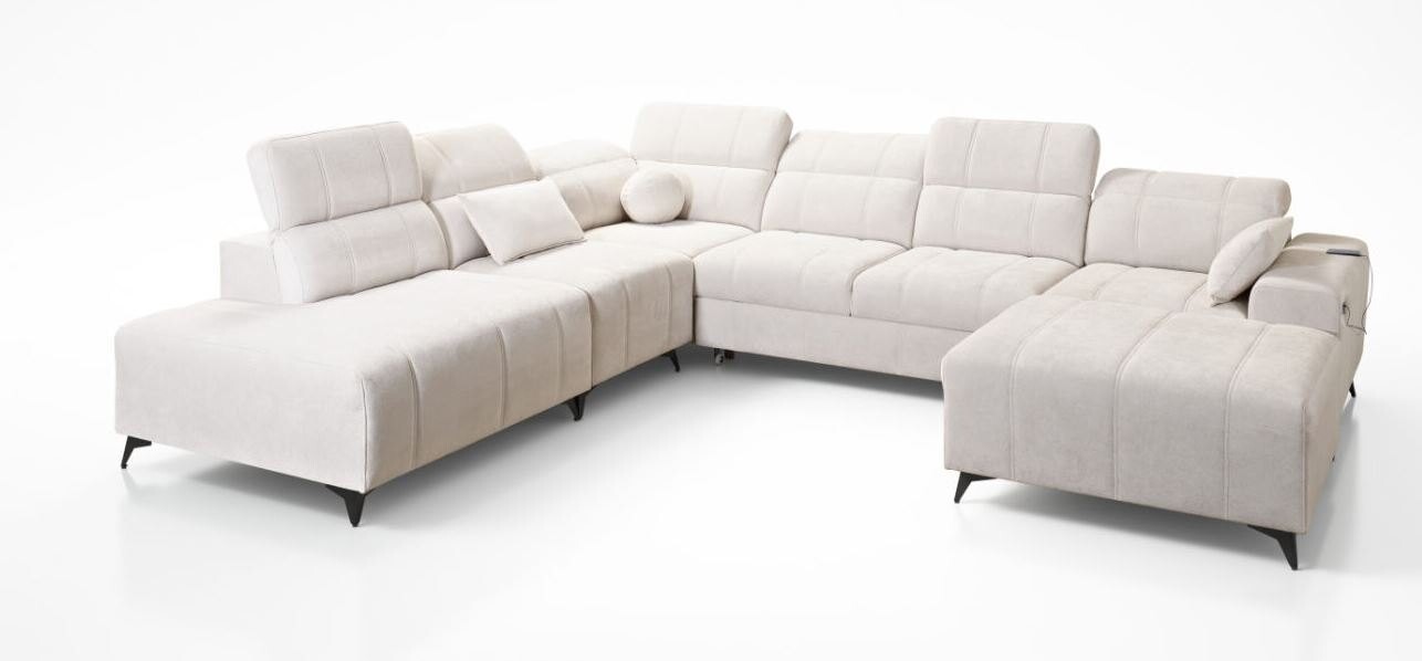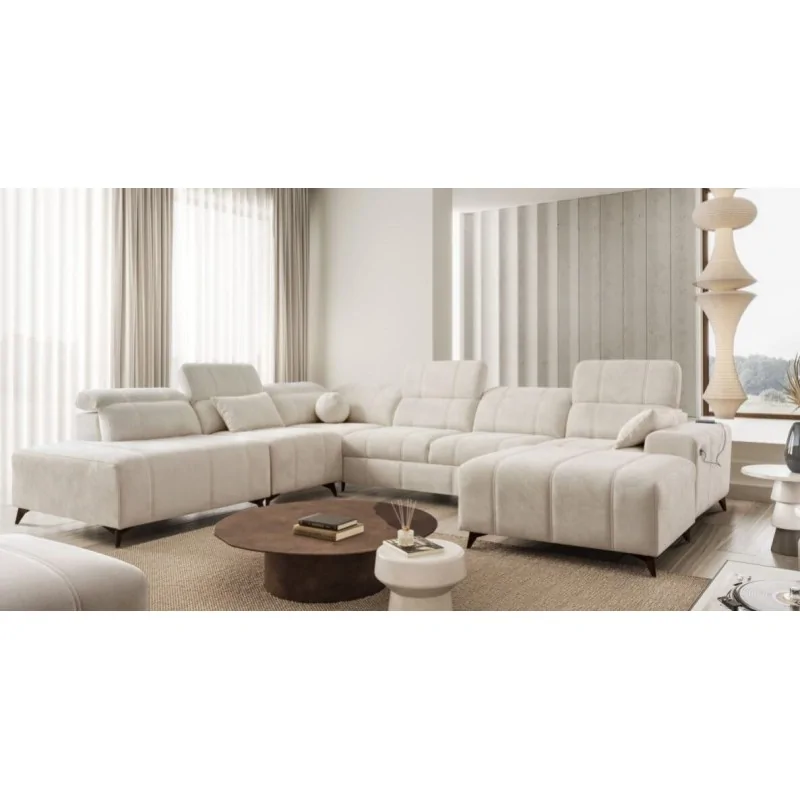 Narożnik Kombo X 286x345x184 cm to imponujący i wszechstronny mebel, który łączy w sobie nowoczesny design i funkcjonalność. Jego przestronna konstrukcja, subtelne pikowania oraz wyrafinowane detale sprawiają, że idealnie wpisuje się w eleganckie i przestronne wnętrza. Regulowane zagłówki dodają wygody, umożliwiając dopasowanie oparcia do preferencji użytkownika, co czyni ten narożnik idealnym miejscem do relaksu.