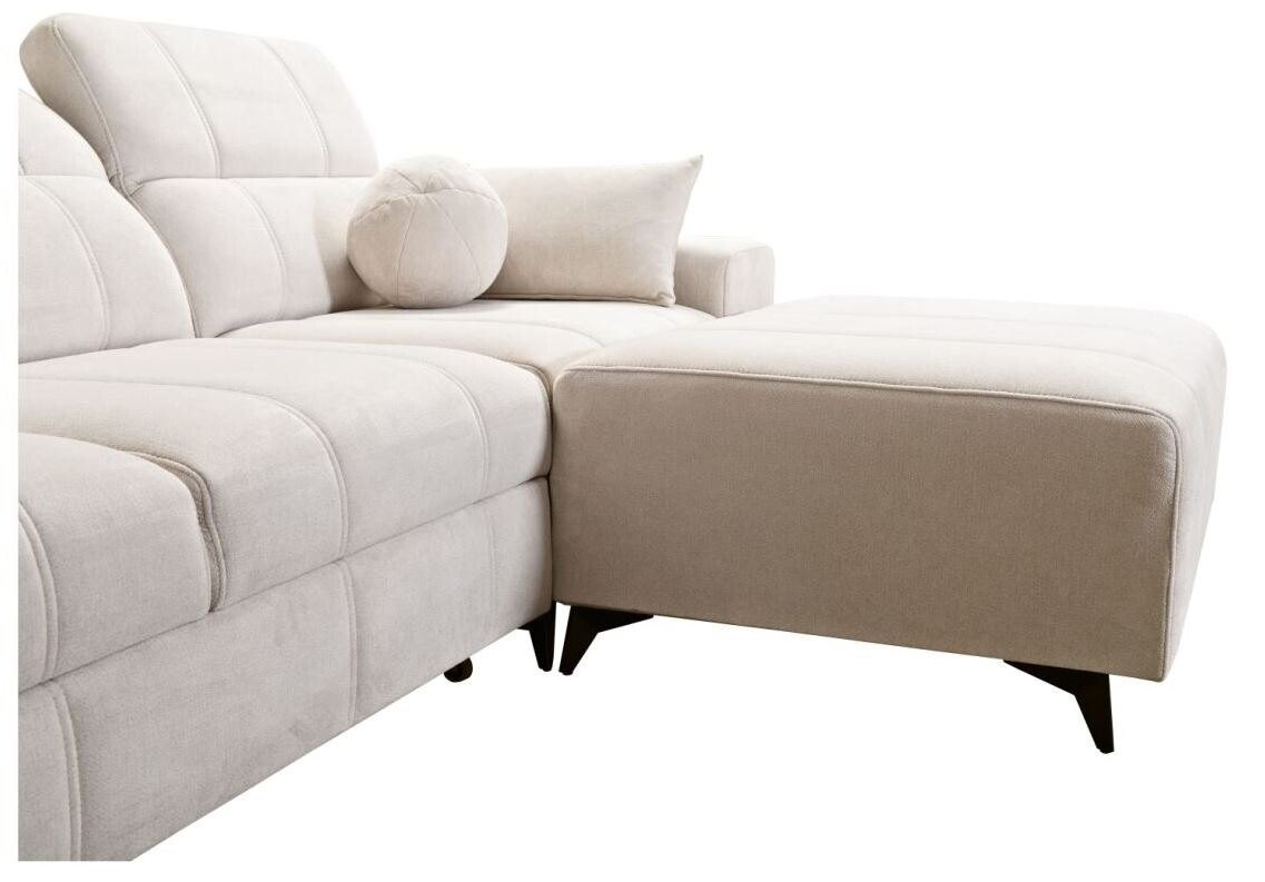Ten narożnik został wyposażony w funkcję spania typu delfin, która umożliwia szybkie i łatwe przekształcenie go w wygodne łóżko. Pojemnik na pościel zapewnia dodatkowe miejsce na przechowywanie, ułatwiając utrzymanie porządku. Siedzisko wykonane z pianki T30 oraz sprężyn falistych gwarantuje trwałość i komfort siedzenia, z opcją doposażenia w piankę HR35 dla jeszcze większej wygody. Solidna konstrukcja oparta na stelażu z drewna i płyty zapewnia stabilność i wytrzymałość.