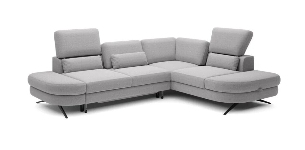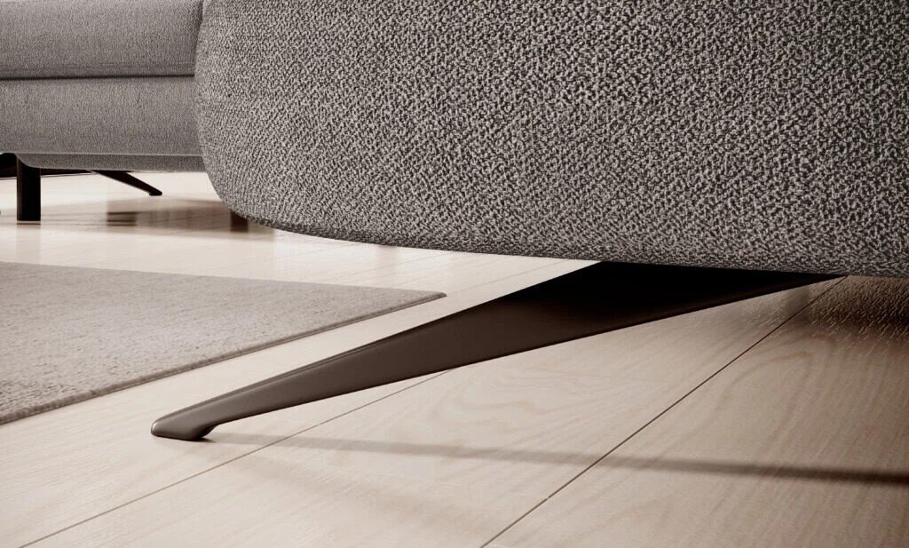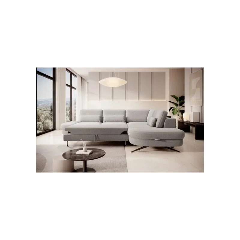 Elegancki narożnik o wyraźnych liniach i nowoczesnym charakterze. Tapicerka w subtelnym odcieniu szarości doskonale podkreśla geometryczną formę mebla, a metalowe nogi nadają mu lekkości i unikalnego stylu. Modułowa budowa oraz zintegrowane zagłówki prezentują się nowocześnie i świadczą o dopracowanym projekcie, który łączy estetykę z wygodą. Obicie zachowuje równowagę między miękkością a sprężystością, co widać w idealnie napiętej powierzchni siedziska.