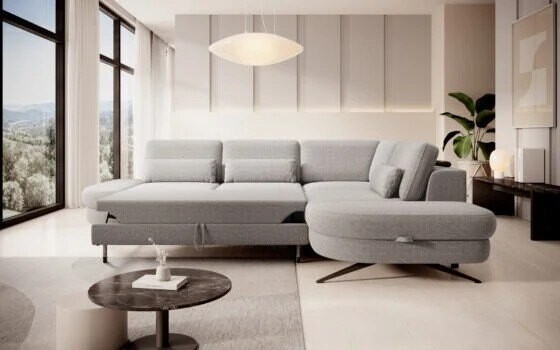 Model Fly oferuje nie tylko relaks w ciągu dnia, ale też komfortowe miejsce do spania. Zastosowana funkcja typu „Delfin” pozwala na szybkie i łatwe rozłożenie narożnika, tworząc równą powierzchnię o wymiarach 131 x 207 cm. Dodatkowym atutem jest pojemnik na pościel – praktyczny schowek ukryty pod siedziskiem, który pomaga utrzymać porządek w salonie i zwiększa funkcjonalność mebla.
