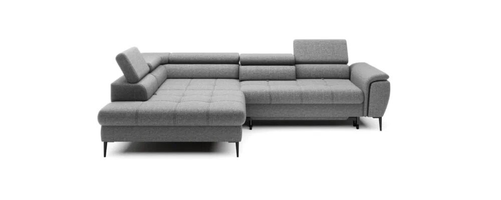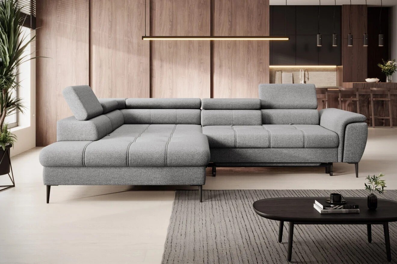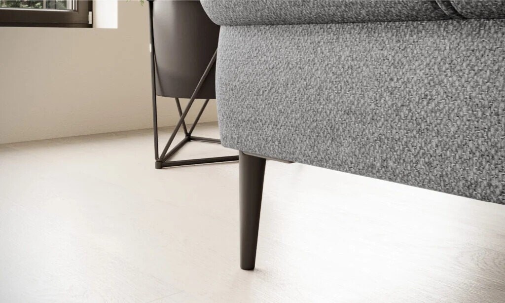 Bryła narożnika Liana wyróżnia się nowoczesną geometrią i zdecydowanymi liniami, które tworzą elegancką, ale przy tym przytulną sylwetkę. Szara tapicerka z delikatną strukturą, starannie wykończone przeszycia oraz smukłe metalowe nogi budują wrażenie solidności i lekkości zarazem. Harmonijnie wyprofilowane oparcia i siedziska z subtelnymi zaobleniami podkreślają dbałość o detale, a dwa przesuwane segmenty oparcia dodają meblowi wyjątkowej funkcjonalności.